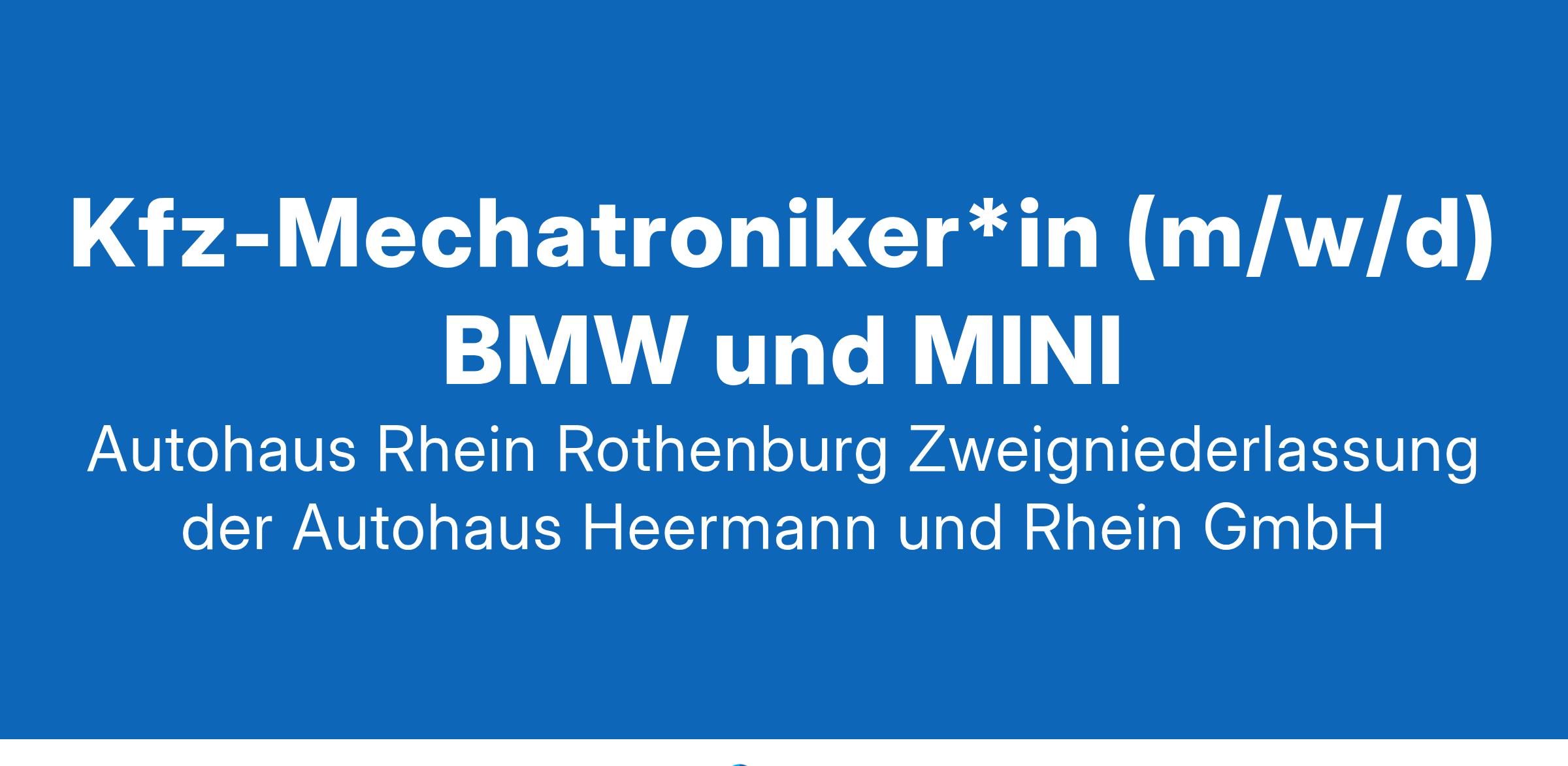 Willkommen bei BMW. Willkommen bei Rhein.KFZ-MECHATRONIKER*IN (M/W/D) BMW UND MINIDie Autohaus Rhein Gruppe ist einer der führenden Anbieter von BMW- und MINI-Fahrzeugen sowie Serviceleistungen in Deutschland. Sie finden uns an rund zwanzig Standorten in Bayern und Baden Württemberg. Wir suchen nach talentierten und leidenschaftlichen Mitarbeitenden, die uns in unserem Autohaus tatkräftig unterstützen können. Wenn Sie eine Karriere in der Rhein Gruppe anstreben und ein starkes Engagement für exzellenten Kundenservice haben, freuen wir uns darauf, von Ihnen zu hören!StellenbeschreibungAls KFZ-Mechatroniker sind Sie für die Wartung, Reparatur und Inspektion von Kraftfahrzeugen verantwortlich