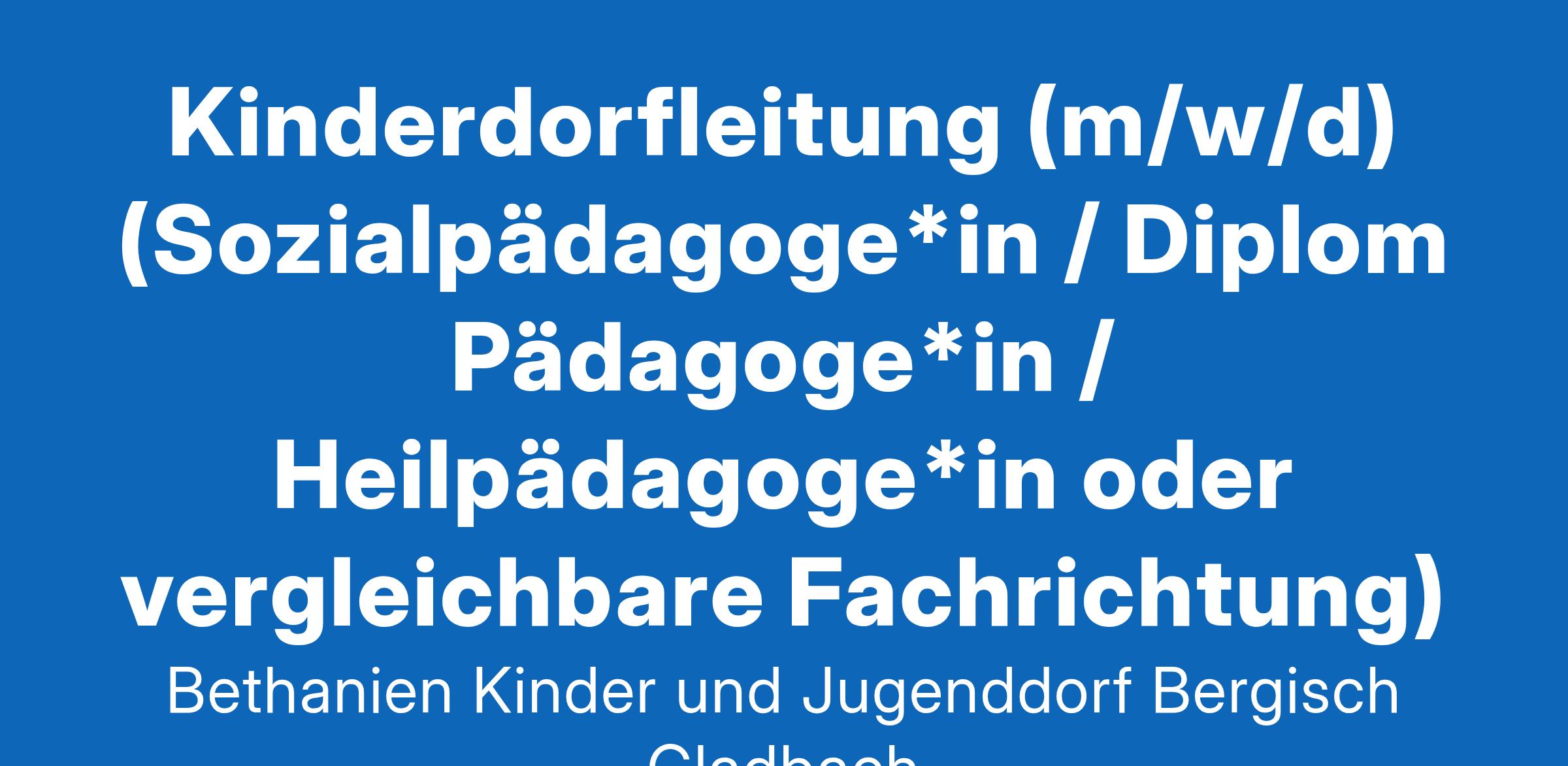 AUF SIE WARTET EIN GANZES DORF ENGAGIERTER MENSCHEN Im Bethanien Kinderdorf geben wir über 120 Kindern und Jugendlichen ein Zuhause, das Geborgenheit und Perspektiven schenkt. Unsere Arbeit basiert auf den Werten der christlichen Tradition und der Überzeugung, dass jedes Kind ein selbstbestimmtes Leben verdient. Werden Sie Teil unseres engagierten Teams und gestalten Sie mit uns eine Zukunft, die Kindern echte Chancen bietet. Vertrauen, Geborgenheit, Zukunftschancen Wir suchen Sie für unser Bethanien Kinderdorf Bergisch Gladbach als Kinderdorfleitung (m/w/d) (Sozialpädagog *in / Diplom Pädagog *in / Heilpädagog *in oder vergleichbare Fachrichtung) Als Leitung unseres Kinderdorfes (m/w/d) mit rund 170 Mitarbeitenden übernehmen Sie die strategische und organisatorische Führung, koordinieren ein vielseitiges Leitungsteam und vertreten die Einrichtung engagiert nach außen. Vollzeit Unser gemeinsames Ziel: Die Kinder in ihrer individuellen Entwicklung zu begleiten und zu unterstützen, damit sie ihr Leben später selbstständig und erfolgreich meistern. DAS ERWARTET SIE: Leitung und Organisation unseres Kinderdorfes mit rund 170 Mitarbeitenden Führung des Leitungsteams, bestehend aus Erziehungsleitungen, Verwaltungsleitung sowie der Stabsstellen Öffentlichkeitsarbeit und Personalreferat Repräsentation des Kinderdorfes nach außen Enge Zusammenarbeit mit der Geschäftsführung sowie den Leitungen der drei Kinderdörfer in strategischen und operativen Belangen Verantwortung für die Weiterentwicklung pädagogischer Konzepte und die Sicherstellung des operativen Geschäftes Überwachung der Einhaltung rechtlicher und interner Vorgaben Schaffung eines kreativen Umfelds, um neue Ideen und Ansätze in der Betreuung und Organisation zu fördern WAS BRINGEN SIE MIT: Ein abgeschlossenes Studium im Bereich Sozialpädagogik, Heilpädagogik, Soziale Arbeit oder vergleichbare Fachrichtung Systemische Zusatzqualifikationen von Vorteil Mehrjährige Führungserfahrung in der Kinder- und Jugendhilfe Starke Management- und Organisationsfähigkeiten Empathisches und motivierendes Auftreten Fähigkeit zur selbstständigen Konzeptentwicklung Sehr gute Deutschkenntnisse in Wort und Schrift Identifikation mit den christlichen Werten WIR BIETEN IHNEN: Eine attraktive Vergütung nach AVR mit überdurchschnittlichen Sozialleistungen Eine arbeitgeberfinanzierte Altersvorsorge Individuelle Fort- und Weiterbildungsmöglichkeiten Supervision im Team, Einzelsupervision Betriebliche Gesundheitsfürsorge Bikeleasing und Jobticket 30 Tage Urlaub (zzgl. Heiligabend, Silvester, Rosenmontag und einen weiteren freien Tag) Eine wertschätzende Unternehmenskultur basierend auf christlichen Werten und Vertrauen SIE SUCHEN EINE SINNGEBENDE AUFGABE? Dann bewerben Sie sich über www.bethanien-karriere.de oder senden Ihre Unterlagen an unseren Geschäftsführer Dr. Klaus Esser per E-Mail an bewerbung@bethanien-kinderdoerfer.de Bethanien Kinderdorf Bergisch Gladbach Neufeldweg 26 | 51427 Bergisch Gladbach| Tel.: 02204 2002 100 www.bethanien-karriere.de