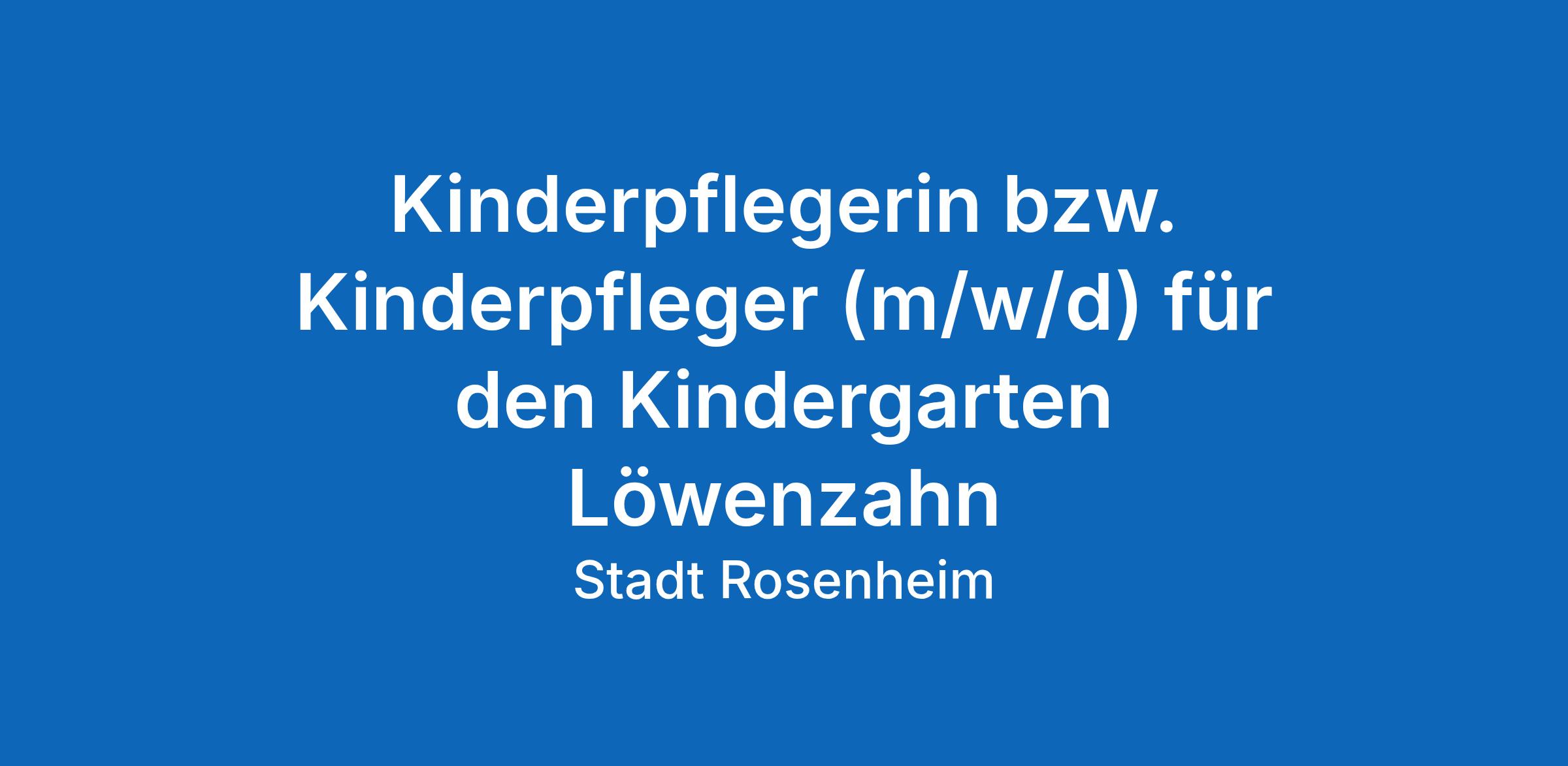Die Stadt Rosenheim, Amt für frühkindliche Bildung, Erziehung und Betreuung, sucht zum nächstmöglichen Zeitpunkt eine/-n Kinderpflegerin bzw. Kinderpfleger (m/w/d) für den Kindergarten Löwenzahn, möglichst in Vollzeit.