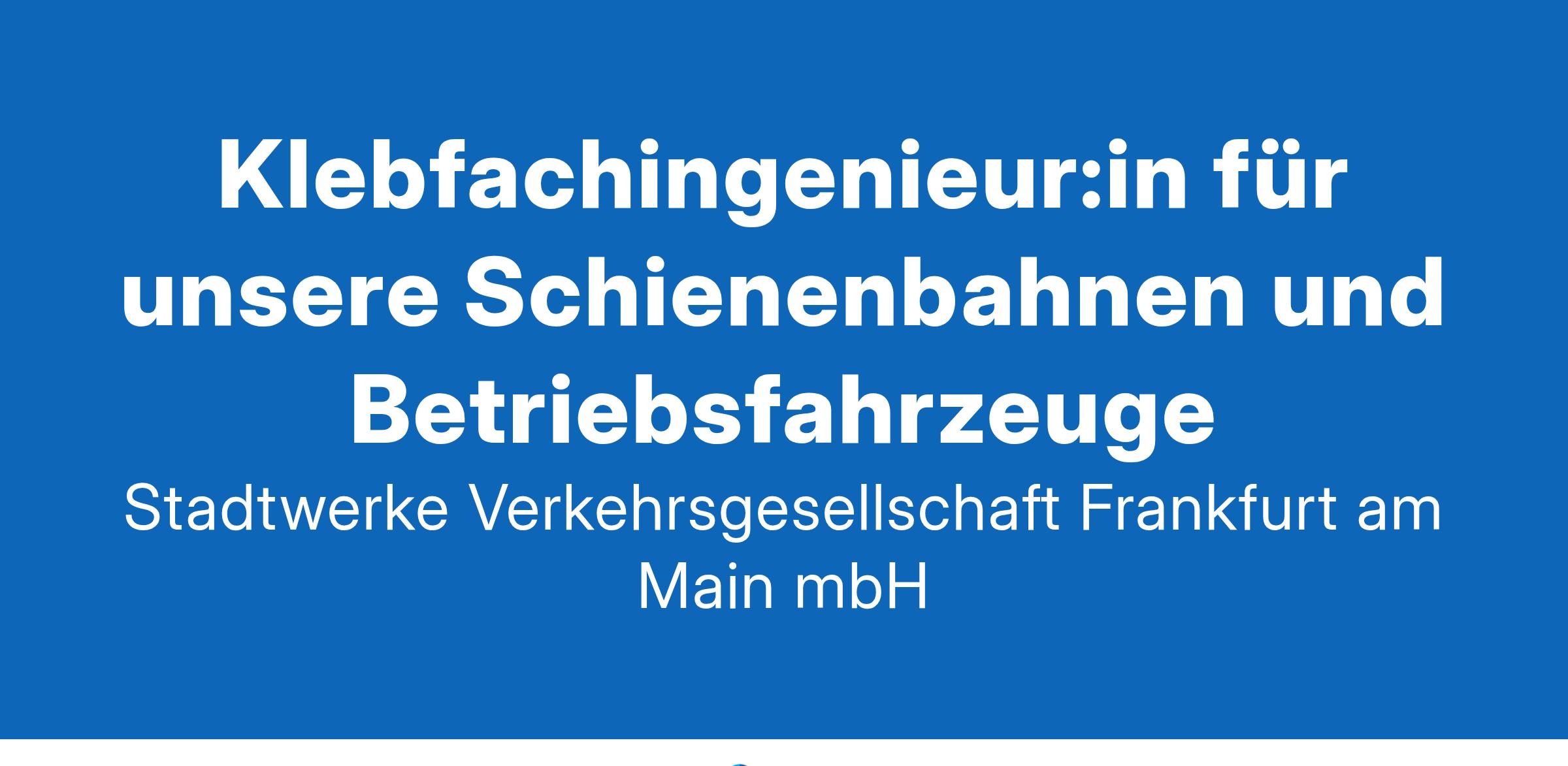Klebfachingenieur:in für unsere Schienenbahnen und Betriebsfahrzeuge WIR BEWEGEN MENSCHEN Als Verkehrsdienstleisterin arbeiten wir an der Zukunft Frankfurts – als Arbeitgeberin kümmern wir uns mit Ihnen um Ihre Zukunft. Darum leben wir in unserem Unternehmen Offenheit, Toleranz und Gleichberechtigung und unterstützen Sie mit vielfältigen Benefits. Wir glauben: Der Nahverkehr ist die Zukunft der Mobilität. Deswegen entwickeln wir mit Leidenschaft neue Ideen und Konzepte. Arbeiten Sie mit uns an der Mobilität Frankfurts! IHRE AUFGABEN