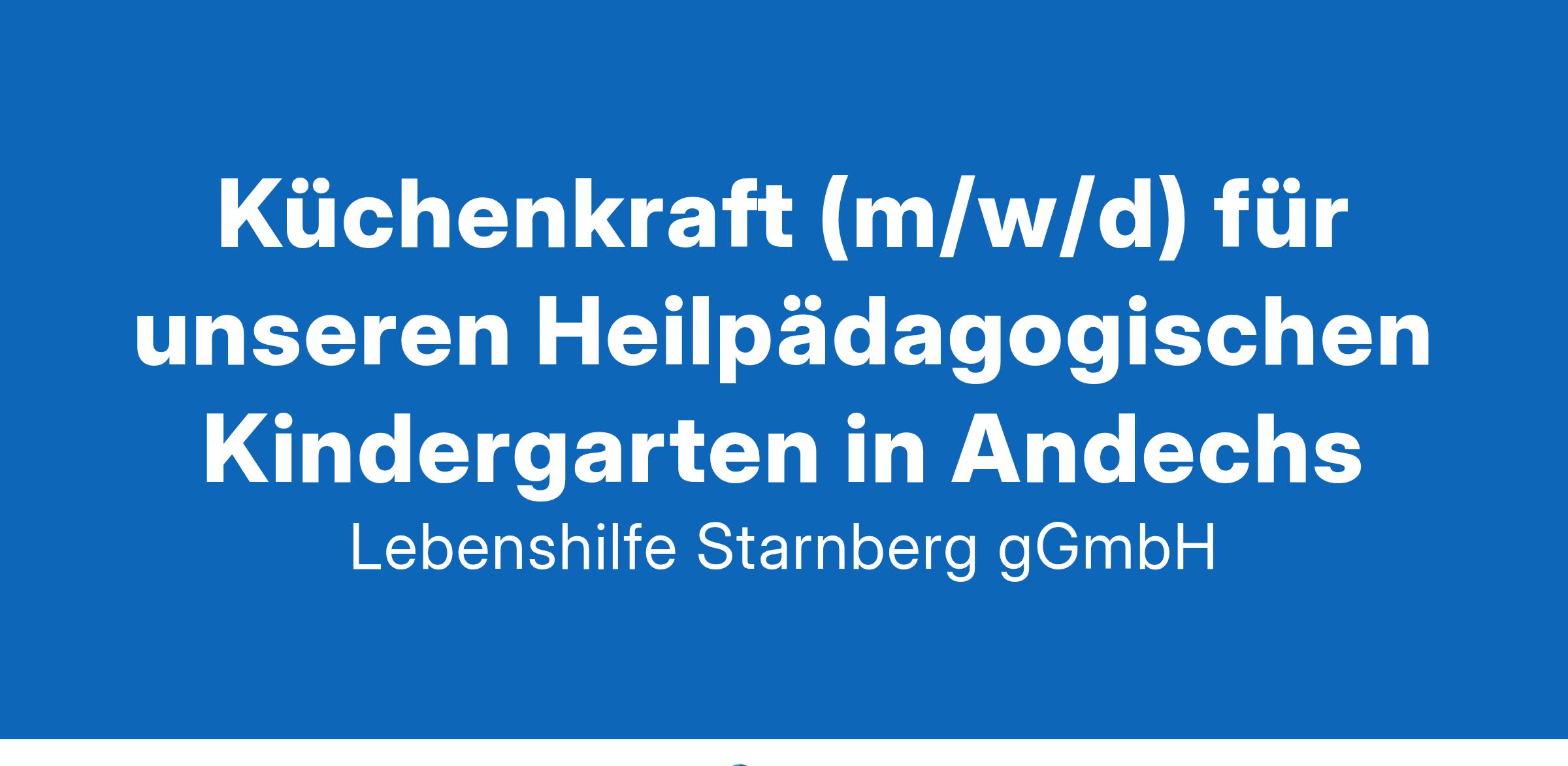 Küchenkraft (m/w/d) für unseren Heilpädagogischen Kindergarten in AndechsHeilpädagogischer Kindergarten AndechsFür unseren heilpädagogischen Kindergarten in Andechs suchen wir zum 07.01.2025 eine Küchenkraft (m/w/d).