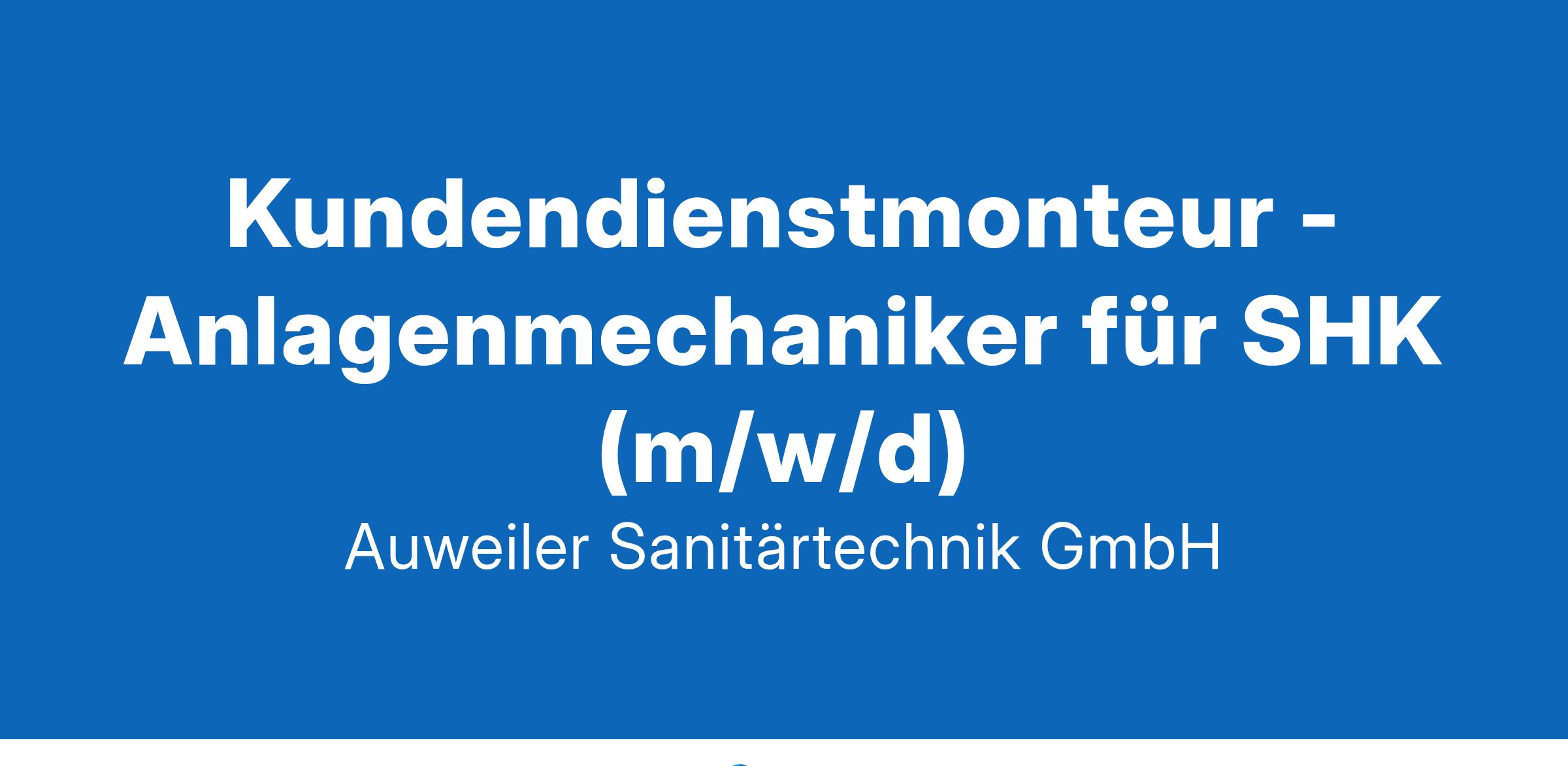 Auweiler Sanitärtechnik GmbH Arbeitsfeld: Service / Reparatur / Sanierung an: Wasserinstallationen, Abwasserinstallationen, Gasinstallationen, Heizungsanlagen (vorrangig Gas) Badezimmerinstallationen im Bestand und Neubau Wartung von Gasheizungsanlagen Ihr Profil: Abgeschlossene Ausbildung zum Anlagenmechaniker SHK Führerschein Klasse B Selbständiges / eigenständiges Arbeiten Sorgfalt / Genauigkeit Motivation / Leistungsbereitschaft Zuverlässigkeit Kundenorientierung Wir bieten: Unbefristetes Arbeitsverhältnis Freundliches familiäres Arbeitsklima Geregelte Arbeitszeiten (auch mehr oder weniger als 37h / Woche) Urlaubs- und Weihnachtsgeld Geschäfts-Smartphone Überlassung Firmenfahrzeug für den Dienstweg Arbeitskleidung Außerbetriebliche Schulungen der SHK-Innung / Handwerkskammer / Hersteller u.v.m. Unsere Arbeitswerte: Nachhaltigkeit: Erhaltenswertes erhalten und verbessern Das Team steht an erster Stelle Ausbildung / Weiterbildung Wir freuen uns über eine Bewerbung an: Auweiler Sanitärtechnik GmbH