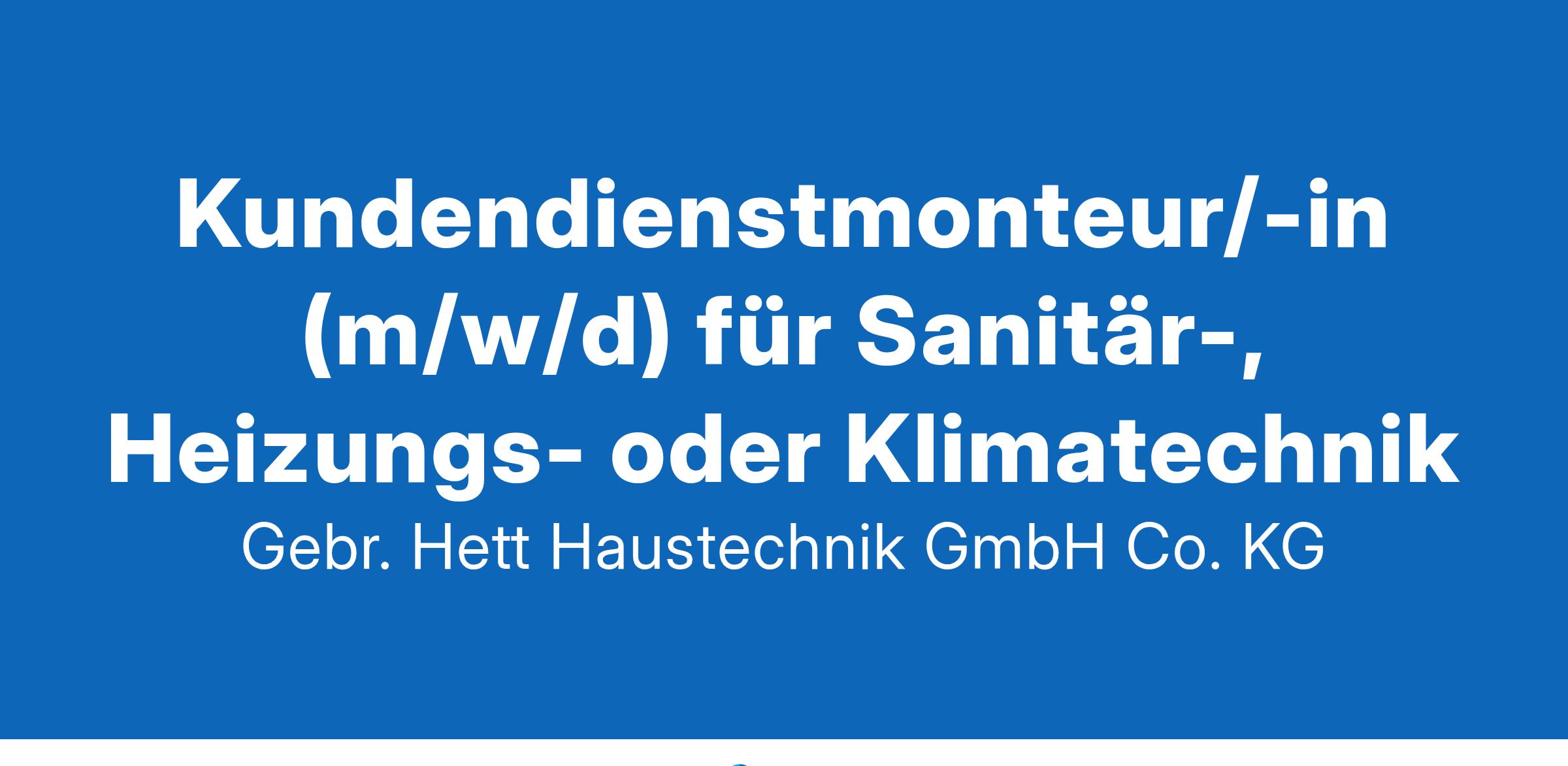 Kundendienstmonteur/-in (m/w/d) für Sanitär-, Heizungs- oder Klimatechnik Als Kundendienstmonteur/in SHK unterstützen Sie unser Team bei der Wartung, Reparatur und Sanierung von Heizungs-, Lüftungs- und Sanitäranlagen. Dabei arbeiten Sie eigenständig in abwechslungsreichen Themengebieten und selbstverständlich mit hochwertigen Materialien. Moderne Lösungen für Bad, Wärme und Luft sind Ihr tägliches Brot. Details Wir sind ein zukunftsorientiertes Unternehmen mit idealen Rahmenbedingungen in einem familiären, angenehmen Arbeitsumfeld. Konsequente Kundenorientierung ist ein Grundpfeiler unserer Unternehmenskultur. Ihre Aufgaben und Tätigkeiten Wartung und Instandsetzung von Heizungsanlagen Durchführen von Inbetriebnahmen sowie Vor- und Nachbereitung von Baustellen Beratung von Kunden und Bearbeitung von Reklamationen Was wir bieten angenehmes Arbeitsumfeld in einem kollegialen Team interessantes und abwechslungsreiches Aufgabengebiet Arbeiten in einem zukunftsorientierten und krisensicheren Gewerk Umsetzung der Klimaziele durch Einbau von Anlagen der erneuerbaren Energien geförderte Altersvorsorge Vermögenswirksame Leistungen (VWL) flache Hierarchien Weiterbildungsmöglichkeiten Weihnachts- und Urlaubsgeld Neue Arbeitskleidung und Arbeitsschuhe werden gestellt Neues Werkzeug und Fahrzeuge E-Bike Leasing auf Wunsch möglich Firmenfahrzeug Was wir erwarten Abgeschlossene Berufsausbildung in SHK- oder Elektrobereich mit mind. 4 Jahren Berufserfahrung Zuverlässigkeit und Pünktlichkeit Engagement und teamorientiertes Arbeiten selbstständige Arbeitsweise professionelles fachliches Know-how Kundenorientiertheit Führerscheinklasse B Arbeitsbeginn: nach Absprache Befristung: unbefristet Vertragsart: Vollzeit Die Bewerbung geht an Firma Gebr. Hett Haustechnik GmbH & Co. KG Kirdorfer Straße 60 61350 Bad Homburg vor der Höhe E-Mail info@hett.de Telefon 06172 81014