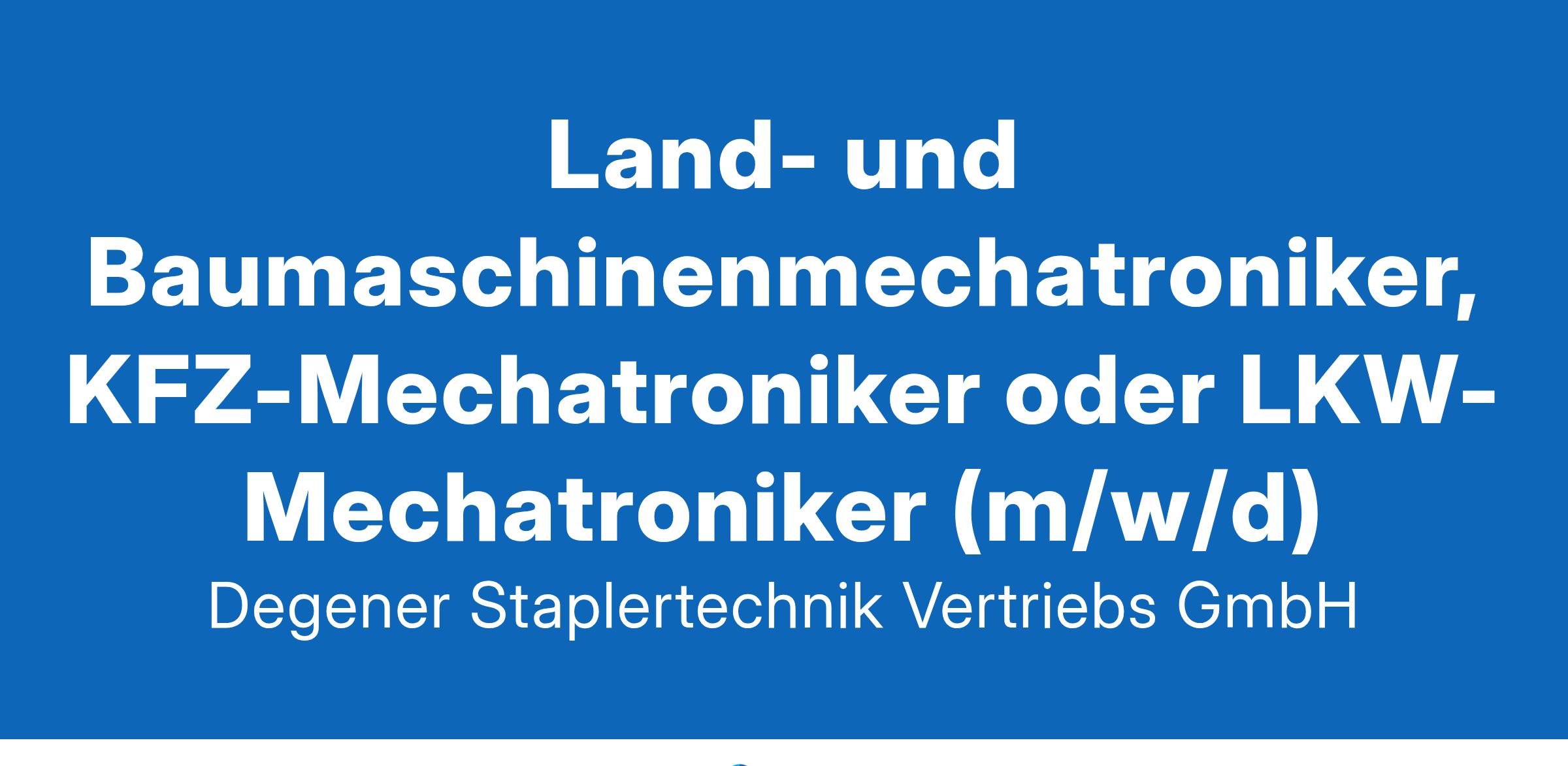 Die Firma Degener Staplertechnik Vertriebs-GmbH besteht seit mehr als 40 Jahren. Wir sind ein mittelständisches Unternehmen und gehören zu den erfolgreichsten Mitsubishi-Gabelstapler-Händlern Deutschlands. Von Anfang an haben wir großen Wert auf erstklassige Beratung und kundenorientierten Service gelegt. Dies ist nur möglich durch unsere qualifizierten Mitarbeiter/innen, die uns zum Teil schon seit Jahren ihre wertvolle Arbeitskraft zur Verfügung stellen. Wir suchen zu sofort für unsere Werkstatt in Senden einen: Land- und Baumaschinenmechatroniker, KFZ-Mechatroniker oder LKW-Mechatroniker (m/w/d) Ihre neuen Aufgaben: Durchführung von Eingangsinspektionen an GabelstaplernReparatur, Wartung und Sicherheitsprüfung an elektro- und verbrennungsmotorischen Flurförderzeugen / GabelstaplernDurchführung von Fehlerdiagnosen und die entsprechende Fehlerbehebung an mechanischen, hydraulischen, elektrischen und elektronischen Systemen von Flurförderzeugen / Gabelstaplernkundenspezifische UmbautenMontage von Anbaugeräten Das bringen Sie mit: eine abgeschlossene technische Ausbildung, vorzugsweise im Bereich KFZ-, LKW- oder Landmaschinenmechanik oder Elektrik oder vergleichbargerne auch Quereinsteiger m/w/d (z.B. aus dem Bereich Energieelektronik), die eine neue Herausforderung suchenEigeninitiative, Leistungsbereitschaft und ZuverlässigkeitTeamfähigkeit und Freude am Umgang mit Maschinen Es gibt viele gute Gründe bei uns zu arbeiten: viel Abwechslung und spannende Aufgaben in einem innovativen Arbeitsumfeldintensive Einarbeitung und regelmäßige SchulungenMitarbeit in einem starken Teambetriebliche Altersvorsorge über Entgeltumwandlung und Zuschuss vom ArbeitgeberJobrad Haben wir Ihr Interesse geweckt? Bewerben Sie sich jetzt und werden Sie Teil unseres erfolgreichen Teams - wir freuen uns auf Sie! Ihre aussagekräftige Bewerbung richten Sie bitte per E-Mail an: Degener Staplertechnik Vertriebs-GmbH Gisela Hülsbusch, Personalabteilung