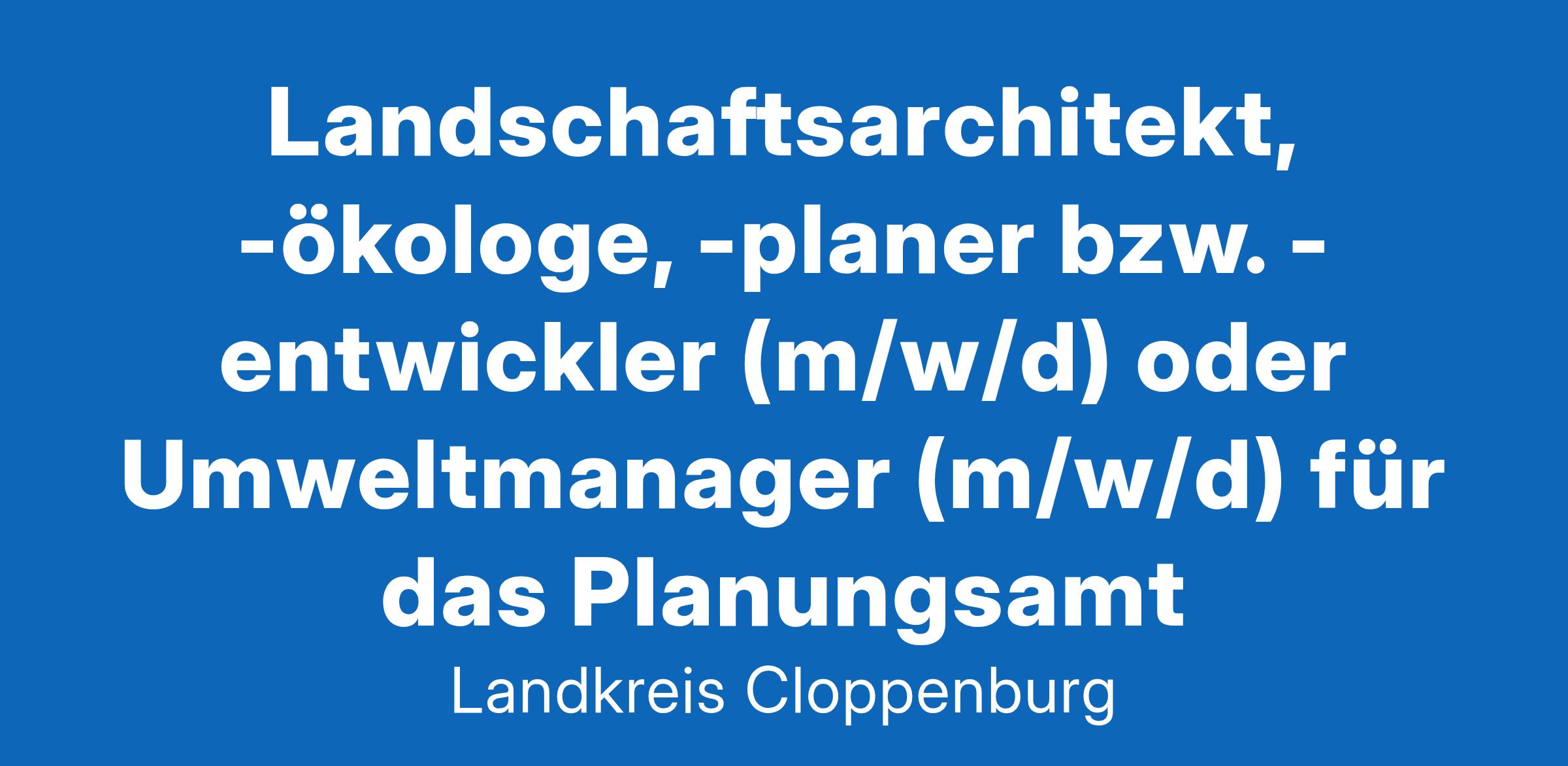 Der Landkreis Cloppenburg sucht für das Planungsamt zum nächstmöglichen Zeitpunkt Landschaftsarchitekt, -ökologe, -planer bzw. -entwickler (m/w/d) oder Umweltmanager (m/w/d) für das Planungsamt Ihre Aufgaben: Aufstellen von landschaftspflegerischen Planungen Aufstellen und Bewerten von Sondergutachten zu den Schutzgütern des UVPG Koordination und Abstimmung der Planung mit internen und externen Fachstellen und Behörden, z.B. der Unteren Naturschutzbehörde Aufstellen und Betreuen von landschaftsplanerischen Fachbeiträgen sowie Verträgen von Landschaftsbauleistungen Bauüberwachung von Landschaftsbauarbeiten Mitwirken bei der Flächenbeschaffung für Kompensations- und Trassenflächen Mitwirken bei der Öffentlichkeitsarbeit Unser Angebot: Verantwortungsvolle und abwechslungsreiche Tätigkeit in einem unbefristeten Arbeitsverhältnis Durchschnittliche regelmäßige wöchentliche Arbeitszeit von bis zu 39 Stunden Beschäftigung nach den Bestimmungen des Tarifvertrages für den öffentlichen Dienst (TVöD). Eingruppierung erfolgt in die Entgeltgruppe 11 TVöD In Abhängigkeit der vorliegenden Berufserfahrung können eine übertarifliche Stufenzuordnung oder eine befristete monatliche Fachkräftezulage in Betracht kommen. Erwerb einer Zusatzversorgung für den öffentlichen Dienst (VBL), Jahressonderzahlung nach TVöD sowie Teilnahme an der leistungsorientierten Bezahlung (LoB) Gleitende Arbeitszeit Möglichkeit des anteiligen Homeoffice Förderung von internen und externen Fort- und Weiterbildungsmöglichkeiten, hauseigene Kantine, Betriebskindertagesstätte für Kinder bis zu drei Jahren, Möglichkeit des Fahrradleasings, umfangreiches Gesundheitsmanagement (Hansefit, Betriebssportgruppen, Yoga in der Mittagspause, (kostenpflichtige) Massageangebote, u.v.m.) Ihr Profil: Abgeschlossenes Fach- oder Hochschulstudium (Diplom/Bachelor) der Fachrichtungen Landschaftsplanung, -architektur, -entwicklung oder -ökologie, Umweltmanagement oder -wissenschaften, Freiraumplanung, Urban Design oder in einem fachverwandten Studiengang Berufserfahrung im Bereich Landschaftsplanung bei Infrastrukturvorhaben wünschenswert Gute EDV-Kenntnisse in MS-Office-Programmen Gute Deutschkenntnisse in Wort und Schrift (mindestens Sprachniveau C 1) Besitz einer gültigen Fahrerlaubnis der Klasse B Bereitschaft zum Einsatz des eigenen PKWs gegen eine Fahrtkostenerstattung nach der Niedersächsischen Reisekostenverordnung wird vorausgesetzt Durch den Beitritt zur Charta der Vielfalt möchte der Landkreis Cloppenburg die Anerkennung, Wertschätzung und Einbeziehung von Vielfalt in der Verwaltung voranbringen und ein Arbeitsumfeld schaffen, dass frei von Vorurteilen ist. Alle Mitarbeitenden werden unabhängig von geschlechtlicher Identität, Nationalität, ethnischer Herkunft, Religion oder Weltanschauung, Behinderung, Alter, sexueller Orientierung oder Identität wertgeschätzt. Interessiert? Wir freuen uns auf Ihre aussagekräftige Bewerbung bis spätestens zum 23.02.2025. Ihre Bewerbungsunterlagen einschließlich der erforderlichen Qualifikationsnachweise (u.a. Ausbildungs- und Prüfungszeugnisse) reichen Sie bitte über unser Online-Bewerbungsportal unter https://karriere.lkclp.de ein.