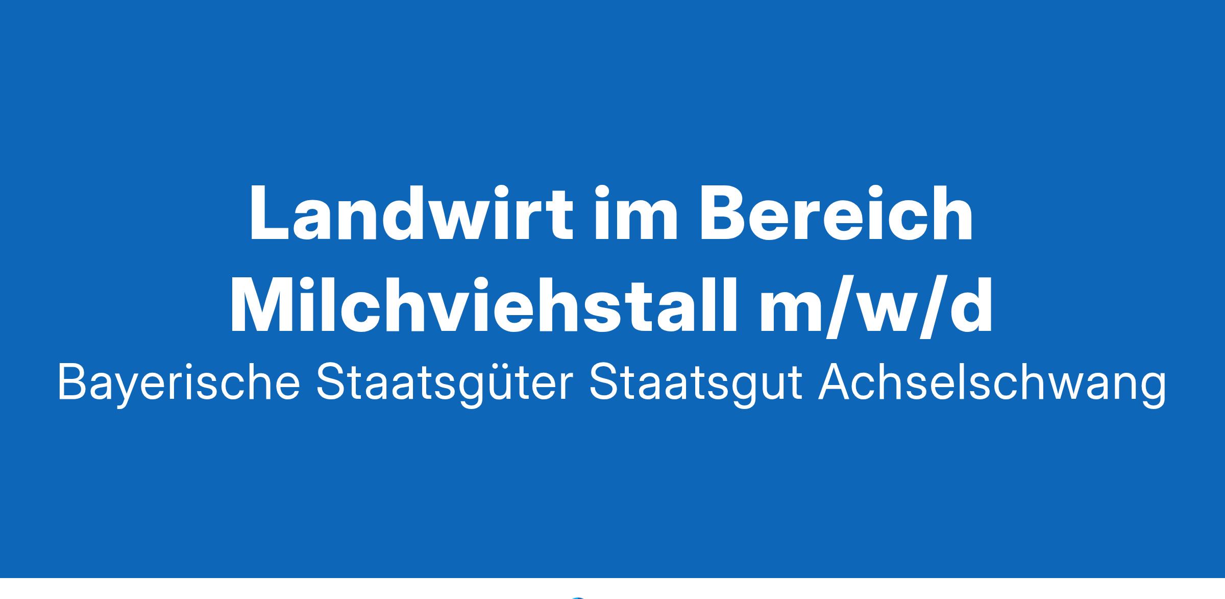 Landwirt im Bereich Milchviehstall m/w/d Stellenausschreibung Nr. 2025-06 / AZ: 0302 Freising, 13.01.2025 Die Bayerischen Staatsgüter (BaySG) sind ein unternehmerisch handelnder Staatsbetrieb, der dem Bayerischen Staatsministerium für Ernährung, Landwirtschaft, Forsten und Tourismus unmittelbar nachgeordnet ist. BaySG bewirtschaftet die ressorteigenen landwirtschaftlichen Betriebe und ist Dienstleister im Versuchs- und Bildungswesen. Bei den Bayerischen Staatsgütern am Standort Achselschwang ist ab sofort eine Stelle als Landwirt/Landwirtin (m/w/d)