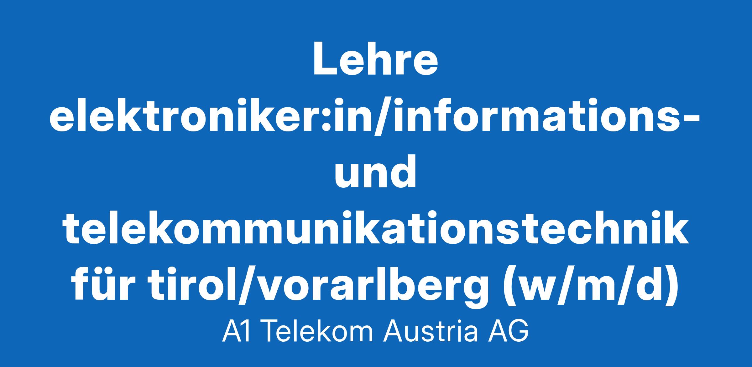 Als führender Kommunikationsanbieter im CEE-Raum bietet die A1 Group Produkte und Dienstleistungen in den Bereichen Sprachtelefonie, Breitband-Internet, Mobile und Home Entertainment sowie Smart-Home-, Daten- und IT-Lösungen, Wholesale sowie Payment-Lösungen und digitale Dienstleistungen. Lehre Elektroniker:in/Informations- und Telekommunikationstechnik für Tirol/Vorarlberg (w/m/d) Computer, Netzwerke und die Technik, die dahintersteckt - das alles ist genau deins? Perfekt, denn in den dreieinhalb Jahren deiner Ausbildung tauchst du tief in die vielfältigen Technikbereiche von A1 ein und lernst in deiner Ausbildungspraxis verschiedene Fachbereiche und unterschiedliche Teams kennen. Entwickle dich gemeinsam mit uns weiter - am A1 Future Campus erwarten dich spannende Weiterbildungen zu technischen Themen, Projekte und gemeinsame Veranstaltungen in unserer Community & du vernetzt dich mit vielen anderen A1 Lehrlingen.Aufgaben Du lernst wie Betriebssysteme und Netzwerke in der Praxis funktionieren und aufgebaut sind. Du lernst alles rund um die Anschluss- und Beschaltungstechnik und wie Daten von einer Schnittstelle zur nächsten übertragen werden. Bei uns kannst du praktische Erfahrungen mit Glasfaser- und Kupferkabeln sammeln und wir zeigen dir, wie das Internet zu dir nach Hause kommt. A1 Future Campus lernst du z. B. das Programmieren von Mikrocontrollern und was Strom, Spannung und Widerstand ist. Deine handwerkliche Fähigkeit stellst du beim Löten im Hauptverteiler von Kundenanschlüssen unter Beweis. Bei uns bringst du das Internet direkt zu unseren A1 Kunden und installierst A1 Produkte Profil Technik deine Leidenschaft ist. Du kein Problem mit Zahlen und Mathematik hast. Du gerne mit Menschen arbeitest und dir Service für unsere Kund:innen wichtig ist. Du neugierig und offen bist. Du gerne anpackst und Dein Einsatzort Du begleitest eine/n A1 Servicetechniker:in bei den Einsätzen im Raum Tirol oder Vorarlberg. Wir bieten In der Nähe deines Wohnortes. Nutze deine Chance und gestalte die Zukunft von Österreichs größtem Kommunikationsunternehmen aktiv mit! eine Top Ausbildung mit vielen Zusatz- und Vertiefungsmodulen. eine 4-monatige Basisausbildung in Wien am A1 Future Campus. Praxiseinsätze in der Nähe deines Wohnorts. die Möglichkeit zur berufsbegleitenden Matura und € 2.000,- für den erfolgreichen Abschluss. € 1.500,- für deinen B-Führerschein Klimaticket oder Top-Jugendticket einen Firmen-Laptop und ein Firmen-Handy die Teilnahme an Wettbewerben, Outdoor-Aktivitäten Das monatliche Lehrlingseinkommen laut Kollektivvertrag der A1 Telekom Austria AG beträgt im 1. Lehrjahr € 1.113,34 brutto. Wir suchen Menschen mit echter Leidenschaft und Top Motivation!JBG81_AT