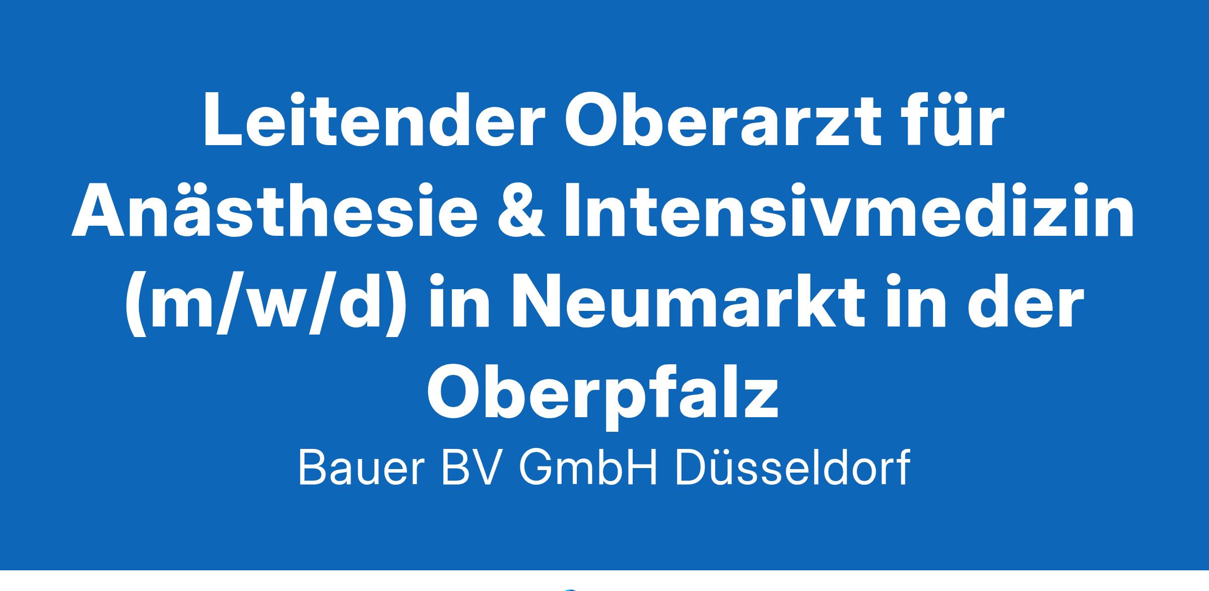Leitender Oberarzt für Anästhesie & Intensivmedizin (m/w/d)Stellen-ID: 2385 Standort: Neumarkt in der Oberpfalz Anstellungsart(en): VollzeitIhr neuer Arbeitsplatz:Akademisches Lehrkrankenhaus mit knapp 200 Betten in der Region Neumark in der Oberpfalz. Die Fachabteilung für Anästhesie arbeitet in einem modern ausgestatteten OP-Bereich mit allen operativen Disziplinen des Krankenhauses zusammen. Jährlich werden knapp 4.000 durchgeführt.Ihre Vorteile:Attraktiver und verantwortungsvoller ArbeitsplatzEinsatzin einem der drei OP-Sälein der interdisziplinären Intensivstationin der Prämedikationssprechstundeim SchmerzdienstTeilnahme am NotarztdienstGute interdisziplinäre Zusammenarbeit mit anderen FachabteilungeFreundliches, menschliches und teamorientiertes BetriebsklimaUnterstützung und Förderung von WeiterbildungenAttraktive Vergütung mit Beteiligung am AbteilungspoolUnbefristete Festanstellung mit PerspektiveIhr Profil:Facharzt (m/w/d) für AnästhesieZusatzbezeichnungen IntensivmedizinHohe fachliche QualifikationLeitungserfahrungEngagement und TeamfähigkeitIhr Ansprechpartner:Bauer B+V Personalberatung Frau Lena Schwarz Grafenberger Allee Jetzt bewerbenDüsseldorfT.: 0211 - Jetzt bewerbenE.: Jetzt bewerben