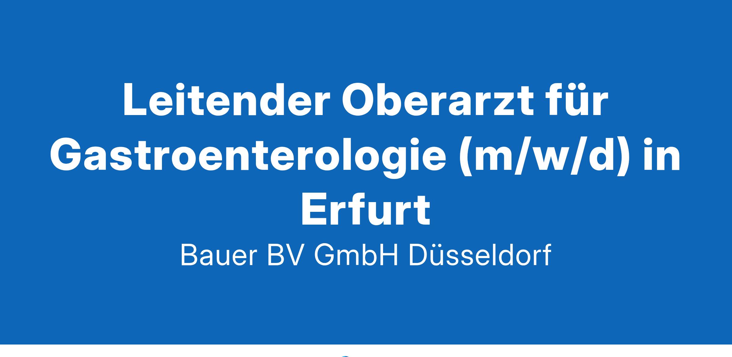 Anstellungsart(en): VollzeitIhr neuer Arbeitsplatz:Akutkrankenhaus der Schwerpunktversorgung im Raum Erfurt mit ca. 750 Betten. Die Klinik für Gastroenterologie betreut nahezu das gesamte Leistungsspektrum einer Universitätsklinik und zählt zu den gastroenterologischen Spezialkliniken. Die Klinik umfasst 78 Betten mit mehreren dazugehörigen Intensivbetten auf der Intermediate Care Station und versorgt ca. 4.000 Patienten pro Jahr.Ihre Vorteile:Großer und abwechslungsreicher Tätigkeits- und AufgabenbereichInterventionelle endoskopische EingriffeSonographisch geführte InterventionenStellvertretende Leitung der KlinikAusbildung der AssistenzärzteUnterstützung für Fort- und WeiterbildungsmaßnahmenAttraktive Vergütung inkl. betrieblicher AltersversorgungUnbefristete FestanstellungIhr Profil:Facharzt (m/w/d) für GastroenterologieFundierte Kenntnisse im FachgebietErfahrungen in der ERCP sowie in der Endosonographie wünschenswertIhr Ansprechpartner:Bauer B+V Personalberatung