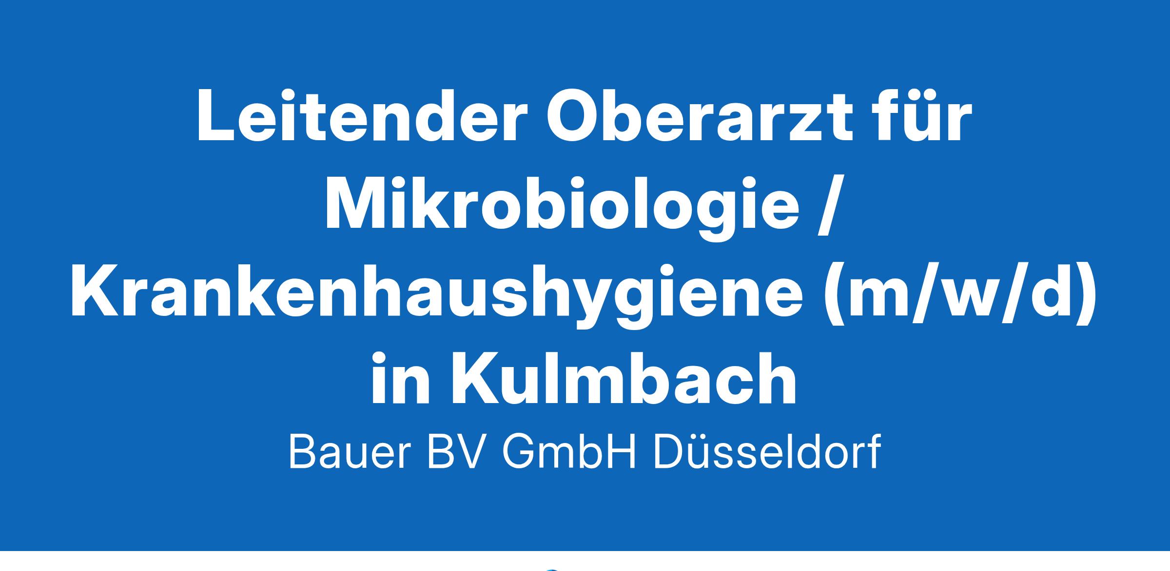 Anstellungsart(en): VollzeitIhr neuer Arbeitsplatz:Krankenhaus der Maximalversorgung / akademisches Lehrkrankenhaus mit 900 Betten und über 3.000 Mitarbeiterinnen und Mitarbeitern in der Region Kulmbach (Bayern). Für den weiteren Ausbau des Instituts für Virologie, Mikrobiologie und Hygiene suchen wir einen Leitenden Oberarzt (m/w/d).Ihre Vorteile:Attraktiver Arbeitsplatz in einer modernen KlinikInteressanter ArbeitsbereichVertretung der InstitutsleitungEigenverantwortliche Betreuung eines InstitutsbereichesKlinische / diagnostische MikrobiologieHygieneAktive Mitgestaltung beim Ausbau der KlinikEntwicklung und Aufbau eines hausweiten ABS-KonzeptesPlanung und Durchführung von Schulungen und FortbildungenFamilienfreundliche ArbeitszeitenAttraktive VergütungUnbefristete FestanstellungIhr Profil:Facharzt (m/w/d) für Mikrobiologie, Virologie und Infektionsepidemiologie oderFacharzt (m/w/d) für Hygiene und UmweltmedizinFundierte Kenntnisse im FachbereichFührungserfahrungStrukturierte Arbeitsweise, hohes Verantwortungsbewusstsein und TeamfähigkeitIhr Ansprechpartner:Bauer B+V Personalberatung
