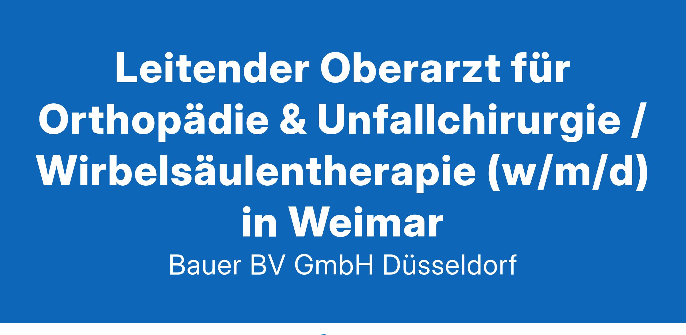 Anstellungsart(en): VollzeitIhr neuer Arbeitsplatz:Akademisches Lehrkrankenhaus und Schwerpunktklinik mit 450 Betten im Raum Weimar. Die Klinik für Orthopädie, Unfallchirurgie und Wirbelsäulentherapie (zertifiziertes EndoProthetikZentrum) betreut jährlich gut 4.500 Patienten sowohl ambulant als auch stationär bei der Behandlung aller Unfälle einschließlich des Beckens und der Wirbelsäule mit modernen Osteosyntheseverfahren sowie der Erkrankungen des Stütz- und Bewegungsapparates mit Endoprothetik und arthroskopischer Chirurgie.Ihre Vorteile:Abwechslungsreiches und verantwortungsvolles TätigkeitsfeldWeiterentwicklung der endoprothetischen VersorgungGroße GestaltungsmöglichkeitenPerspektivisch Übernahme der Leitung des bestehenden EPZSehr gute technische AusstattungFreundliches und engagiertes TeamFörderung von Fort- und WeiterbildungenZusatzweiterbildung Spezielle UnfallchirurgieAttraktive VergütungUnbefristeter Arbeitsplatz mit PerspektiveIhr Profil:Facharzt (m/w/d) für Orthopädie und UnfallchirurgieZusatzweiterbildung Spezielle Orthopädische ChirurgieGroße fachliche ExpertiseMehrjährige Leitungs- und OrganisationserfahrungPromotionEngagement und TeamfähigkeitIhr Ansprechpartner:Bauer B+V Personalberatung