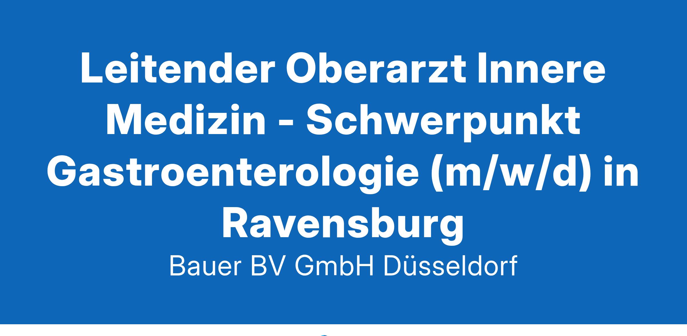 Anstellungsart(en): VollzeitIhr neuer Arbeitsplatz:Akutkrankenhaus mit 150 Betten in der Region Ravensburg. Die Klinik für Innere Medizin behandelt zusätzlich zu den üblichen Untersuchungs- und Behandlungsmethoden alle gängigen endoskopischen Verfahren zur Untersuchung der Bauchorgane, auch mit Hilfe einer hochmodernen Durchleuchtungsanlage. Es werden alle gängigen Ultraschallverfahren zur Untersuchung von Herz-Kreislauf-Erkrankungen, der Bauchorgane und der Schilddrüse angeboten. Das therapeutische Spektrum beinhaltet die Chemotherapie bösartiger Erkrankungen.Ihre Vorteile:Moderne, technisch gut ausgestattete KlinikVerantwortungsvoller und vielseitiger ArbeitsplatzDiagnose, Therapie und Planung der BehandlungsprozesseAnleitung und Weiterbildung der Assistenz- und FachärzteInterdisziplinäre und kooperative Zusammenarbeit mit anderen medizinischen FachabteilungenFreundliches und engagiertes TeamAttraktive VergütungUnterstützung und Förderung von WeiterbildungenUnbefristete Festanstellung mit PerspektiveIhr Profil:Facharzt (m/w/d) für Innere MedizinGerne Zusatzbezeichnung(en)GastroenterologieIntensivmedizinKardiologieFundierte Kenntnisse im FachbereichBerufserfahrung in leitender FunktionEngagement und TeamfähigkeitIhr Ansprechpartner:Bauer B+V Personalberatung