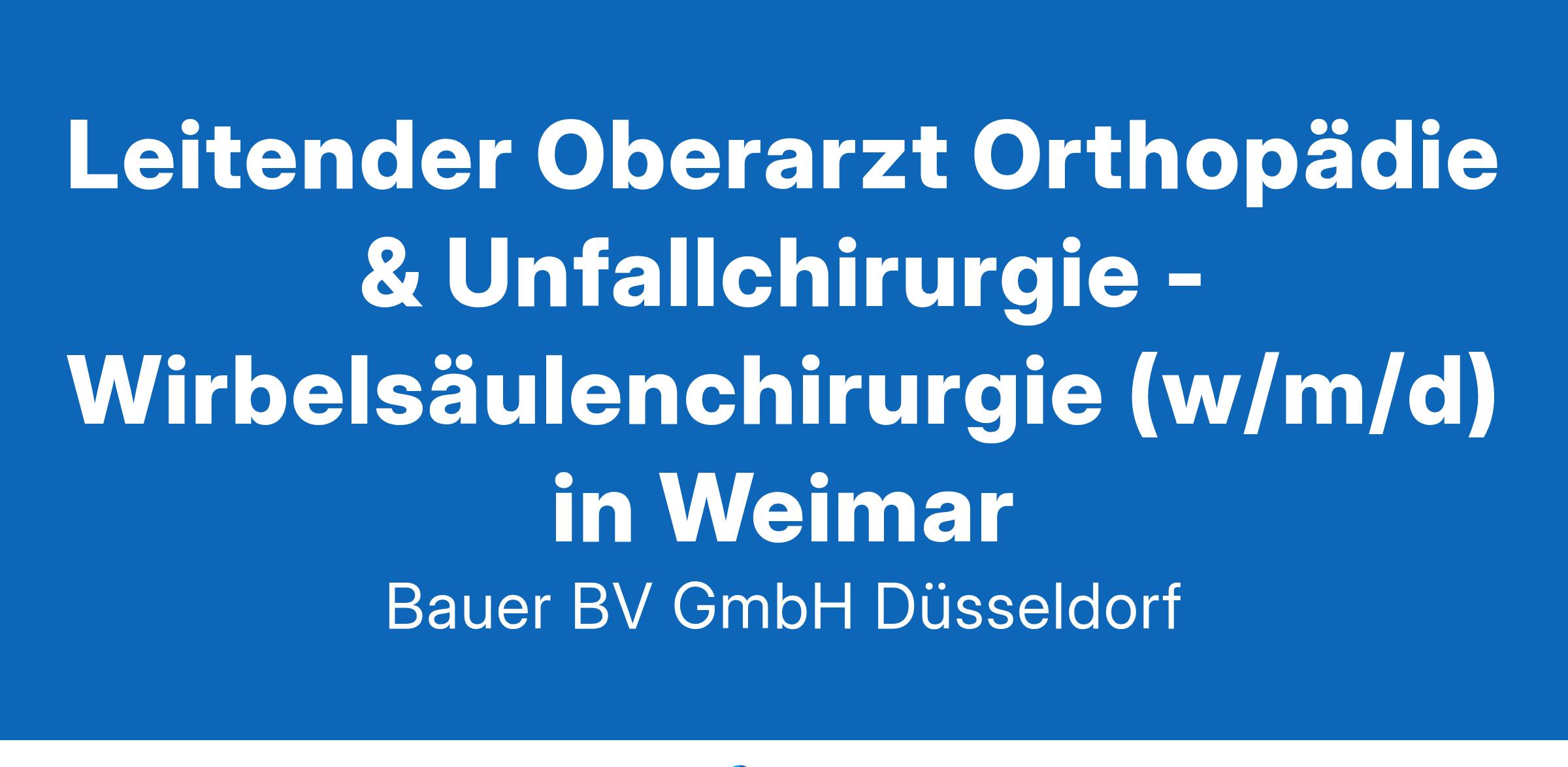 Anstellungsart(en): VollzeitIhr neuer Arbeitsplatz:Akademisches Lehrkrankenhaus mit 650 Betten im Raum Weimar. Die Klinik für Wirbelsäulentherapie versorgt alle Wirbelsäulenerkrankungen wie Deformitäten, Degeneration, Trauma, Tumore, Infektionen sowohl konservativ als auch operativ. Zur Beurteilung der Erkrankung stehen neben konventionellen Röntgenverfahren das MRT und CT einschließlich Myelo-CT zur Verfügung. Die Möglichkeit der gesamtheitlichen Behandlung beinhaltet die konservative, minimal-invasive Wirbelsäulentherapie, die multimodale Schmerztherapie und den operativen Sektor.Ihre Vorteile:Verantwortungsvolle AufgabeWeiterentwicklung der AbteilungAngenehmes ArbeitsklimaWeiterbildungsermächtigung "Spezielle orthopädische Chirurgie"Attraktive VergütungUnbefristete Anstellung mit PerspektiveIhr Profil:Facharzt (m/w/d) für Orthopädie und Unfallchirurgie oder NeurochirurgieIdealerweise Schwerpunktbezeichnung Spezielle Unfallchirurgie und/oder spezielle orthopädische ChirurgieGroße Expertise im FachbereichEngagement und TeamfähigkeitIhr Ansprechpartner:Bauer B+V Personalberatung