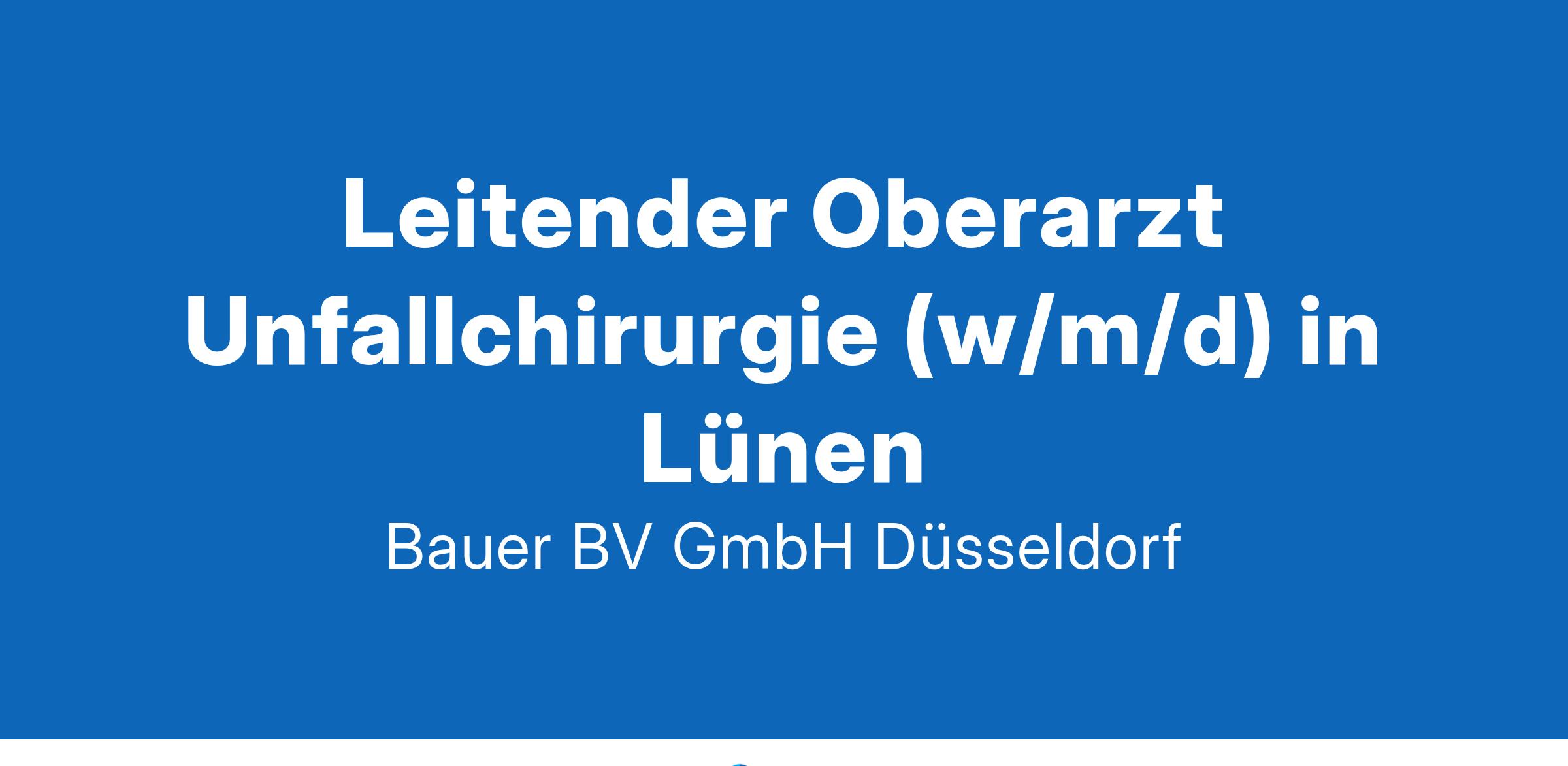 Beschäftigungsbeginn: Jetzt bewerbenIhr neuer Arbeitsplatz:Akademisches Lehrkrankenhaus mit rund 650 Betten in der Region Lünen. Die Sektion Unfallchirurgie versorgt rund 14.000 Patienten pro Jahr. Das Operationsspektrum umfasst alle modernen Verfahren der Unfallchirurgie inkl. minimalinvasiver arthroskopischer Verfahren. Alle Verfahren der akuten und wiederherstellenden Knochenbruchbehandlung mit Titanimplantaten gewebeschonend operativ kommen zur Anwendung.Ihre Vorteile:Ärztliche und fachliche Leitung der Sektion UnfallchirurgieGroße Gestaltungsmöglichkeiten bei der Weiterentwicklung der SektionUmfangreiche interne und externe Fort- und WeiterbildungsmöglichkeitenSystematische Förderung von LeitungskräftenAttraktive Vergütung inkl. betrieblicher AltersversorgungUnbefristete AnstellungIhr Profil:Facharzt für Orthopädie und Unfallchirurgie (m/w/d)Zusatzbezeichnung Spezielle UnfallchirurgieGroße unfallchirurgische ExpertiseBereitschaft zur interdisziplinären ZusammenarbeitBetriebswirtschaftliche KenntnisseIhr Ansprechpartner:Bauer B+V Personalberatung