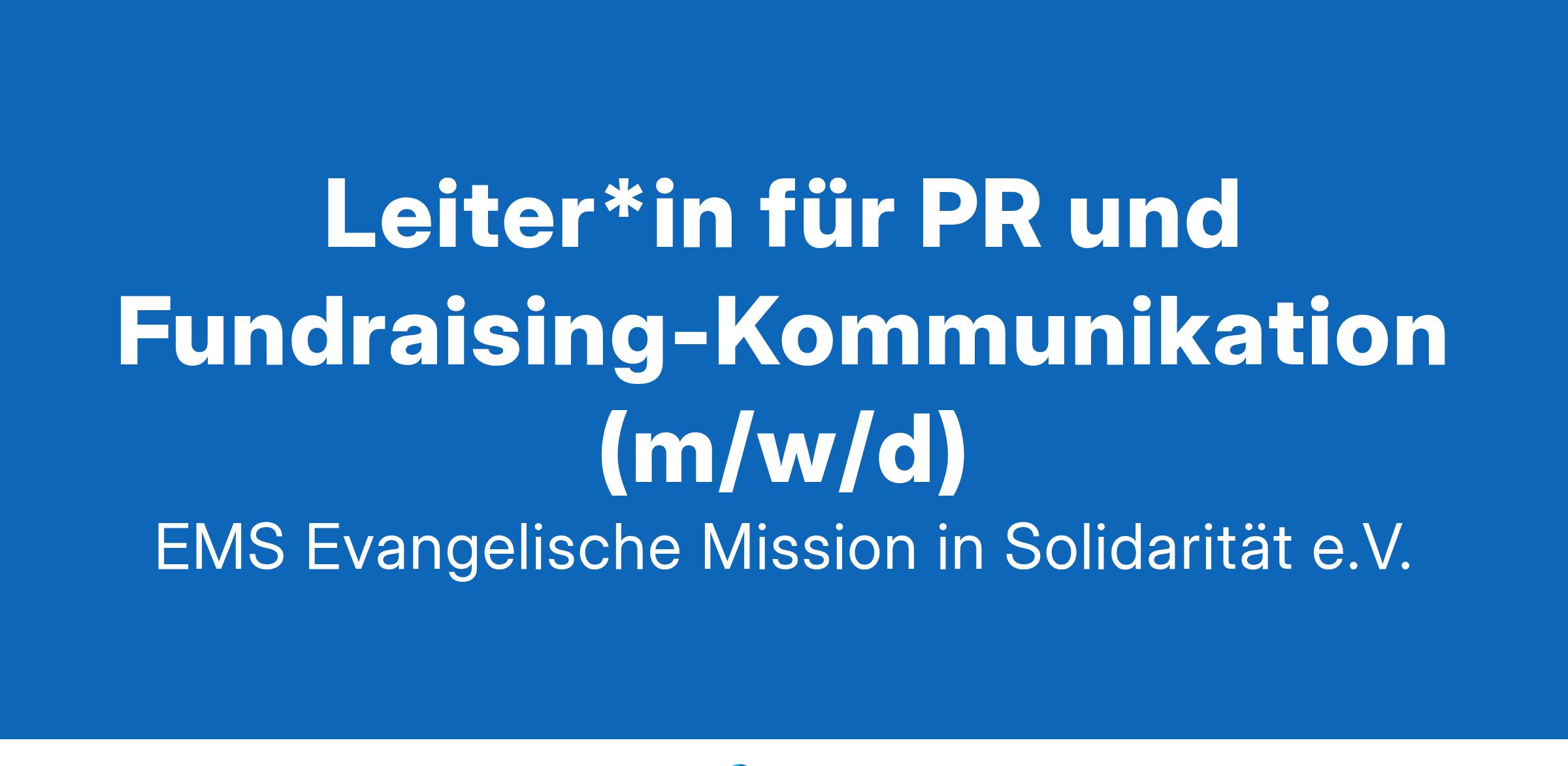 PR / Print-Redakteur (m/w/d) als Abteilungsleiter Kommunikation / Fundraising (m/w/d)Die Evangelische Mission in Solidarität (EMS) verbindet Menschen in Europa, Afrika, Asien und im Nahen Osten. Als internationales kirchliches Netzwerk setzen wir uns für eine Welt ohne Armut und Krieg ein. Wir entwickeln Programme zum Empowerment von Frauen und Minderheiten, für gerechtere Bildungschancen, eine bessere Gesundheitsversorgung sowie theologischen Austausch. Unser engagiertes Team von rund 40 Kolleg*innen in Stuttgart benötigt dafür Unterstützung. Wir suchen: PR / Print-Redakteur (m/w/d) als Abteilungsleiter Kommunikation / Fundraising (m/w/d)Ihre Aufgaben: Mitglied der Geschäftsleitung, Mitarbeit in den Leitungsgremien der EMS. Verantwortung für die ordnungsgemäße Erfüllung der Aufgaben in der Abteilung. Koordination der Presse- und Öffentlichkeitsarbeit der EMS. Koordination des internationalen Kommunikationsnetzwerks; Content-Erstellung im Rahmen des Crossmedia-Konzepts der EMS (Online, Print und Fundraising); Pressearbeit und Erstellung von Publikationen; PR für EMS-Kampagnen und -Events; Ihr Profil: Sie haben einen (Fach-) Hochschulabschluss in Kommunikations- oder Geisteswissenschaften oder Evangelischer Theologie; Sie haben eine journalistische Ausbildung oder journalistische Berufserfahrung; Sie beherrschen die Werkzeuge digitaler Kommunikationsmedien; Sie verfügen über Managementfähigkeiten; Sie haben Interesse daran, in einer internationalen Gemeinschaft von Kirchen und Missionsgesellschaften zu arbeiten; Sie verfügen über sehr gute Deutsch- und Englischkenntnisse und haben ein ausgeprägtes Gespür für Texte und Sprachen. Wir bietenEs erwartet Sie ein wertebasiertes Arbeiten in einem motivierten Team mit internationaler Ausrichtung, ein modernes Arbeitsumfeld und die Möglichkeit zur mobilen Arbeit. Die Bezahlung erfolgt nach KAO/TVöD.KontaktRückfragen richten Sie bitte an den Generalsekretär Dr. Dieter Heidtmann, heidtmann@ems-online.org, Tel. 0711/63678-21. Bitte senden Sie Ihre vollständigen Bewerbungsunterlagen (Motivationsschreiben und Lebenslauf in Englisch und Deutsch zusammen mit 3 Arbeitszeugnissen) bis zum 01.02.2025 per Mail an: Evangelische Mission in Solidarität e.V. Personalabteilung personal@ems-online.org www.ems-online.org