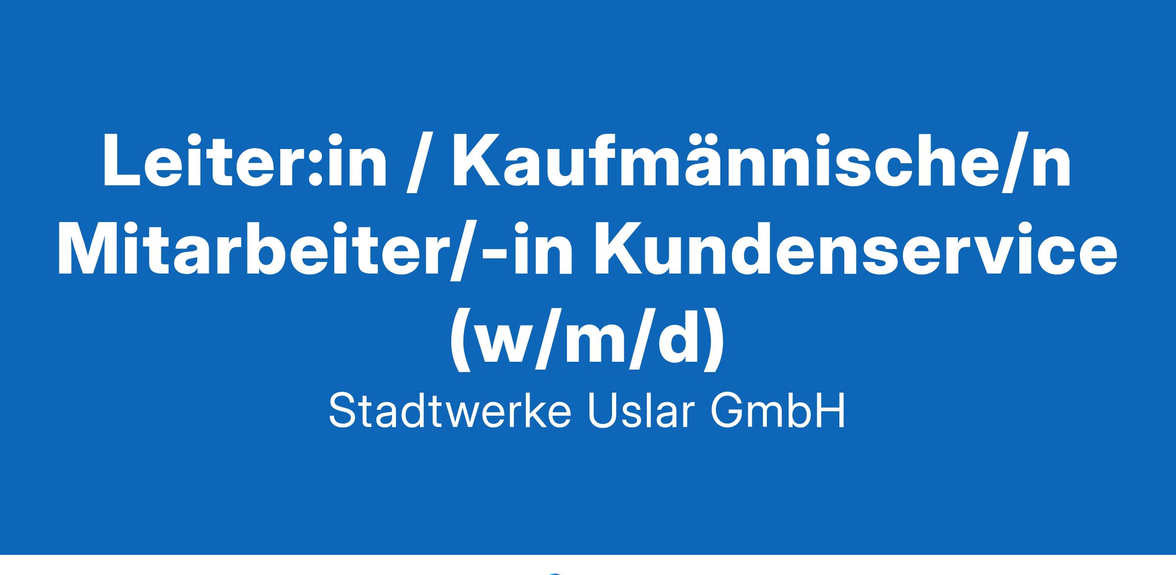 Leiter:in / Kaufmännische/n Mitarbeiter/-in Kundenservice (w/m/d) Wir stellen zum nächstmöglichen Zeitpunkt ein: Leiter:in Kundenservice (w/m/d) Weitere Informationen zu den ausgeschriebenen Stellen finden Sie auf der Homepage der Stadtwerke Uslar GmbH (www.stadtwerke-uslar.de). Bewerbungen mit aussagekräftigen Unterlagen (schriftlich, ausschließlich PDF) werden erbeten bis zum 24.01.2025 an: Stadtwerke Uslar GmbH