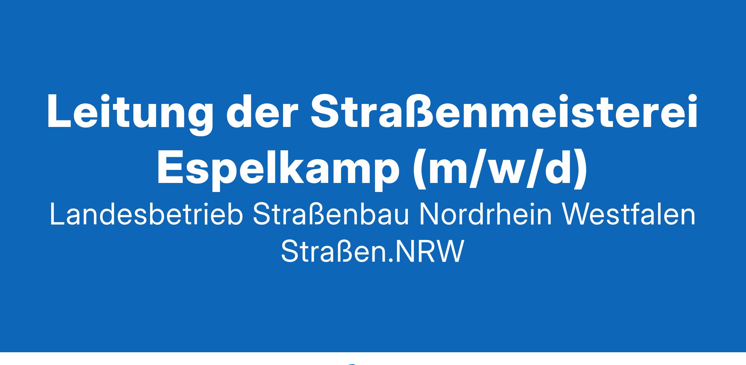 Der Landesbetrieb Straßenbau Nordrhein-Westfalen (Straßen.NRW) sucht zum nächstmöglichen Zeitpunkt für den Dienstort Espelkamp mit Einsatzort SM Espelkamp in Teilzeit, Vollzeit eine Leitung der Straßenmeisterei Espelkamp (m/w/d).