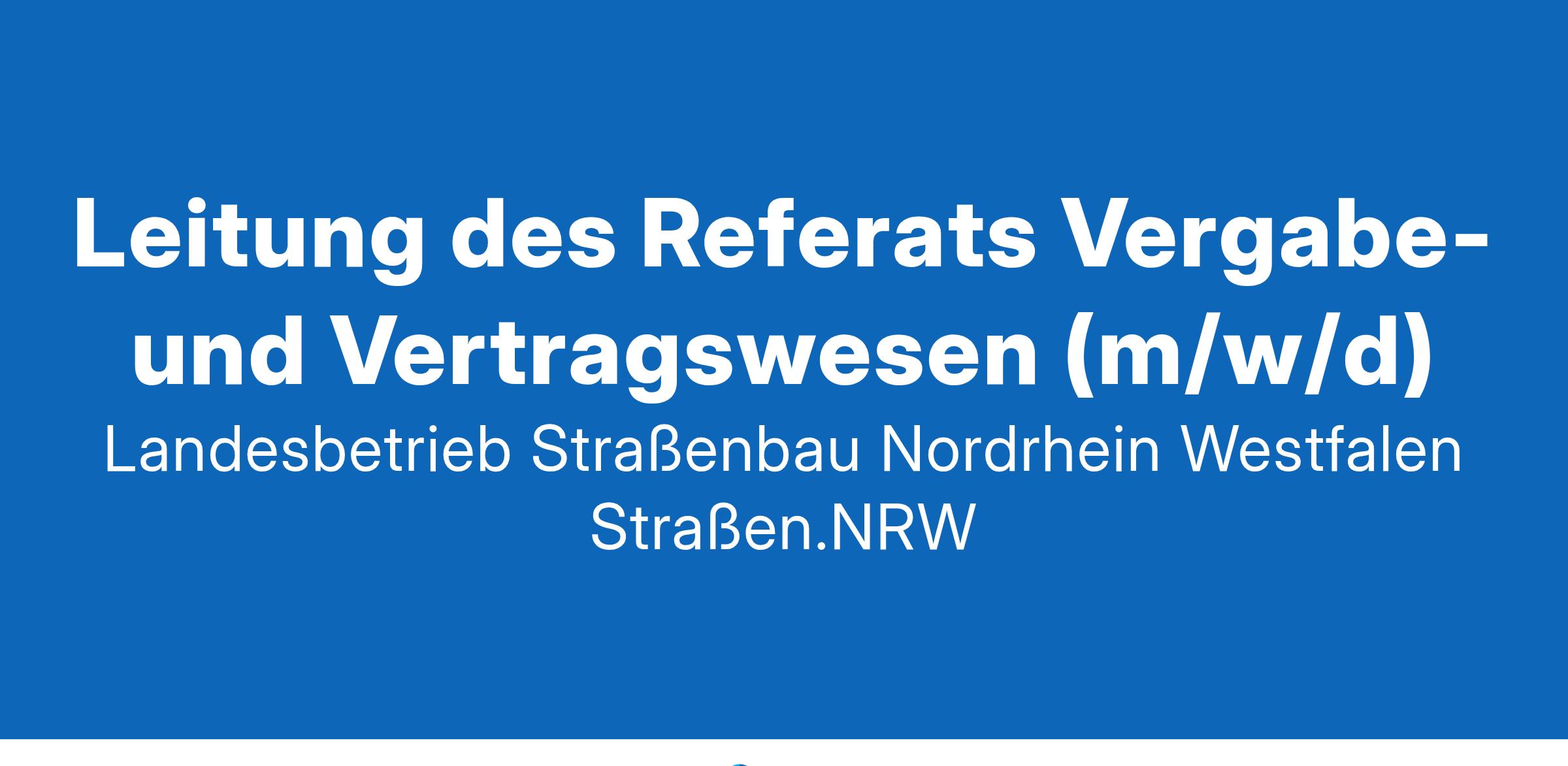 Der Landesbetrieb Straßenbau Nordrhein Westfalen (Straßen.NRW) sucht zum nächstmöglichen Zeitpunkt für den Einsatzort Gelsenkirchen eine/n Leitung des Referats Vergabe- und Vertragswesen.