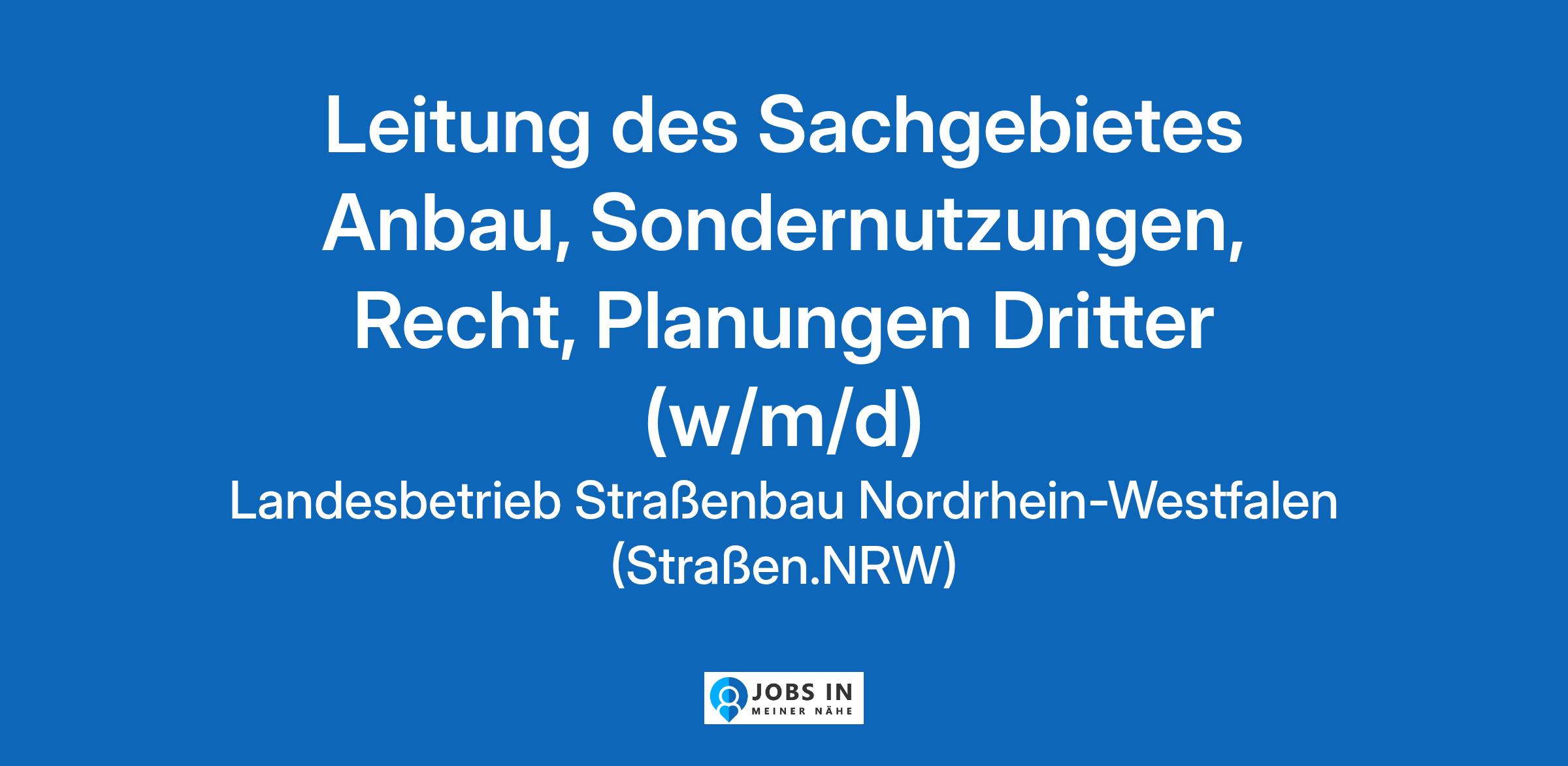Der Landesbetrieb Straßenbau Nordrhein-Westfalen (Straßen.NRW) sucht zum nächstmöglichen Zeitpunkt für den Standort Region I NL Sauerland-Hochstift, für den Dienstort Meschede oder Paderborn mit Einsatzort Region I RNL Sauerland-Hochstift in Teilzeit, Vollzeit mit einem Beschäftigungsumfang von 100 % eine/n Leitung des Sachgebietes Anbau, Sondernutzungen, Recht, Planungen Dritter (w/m/d).