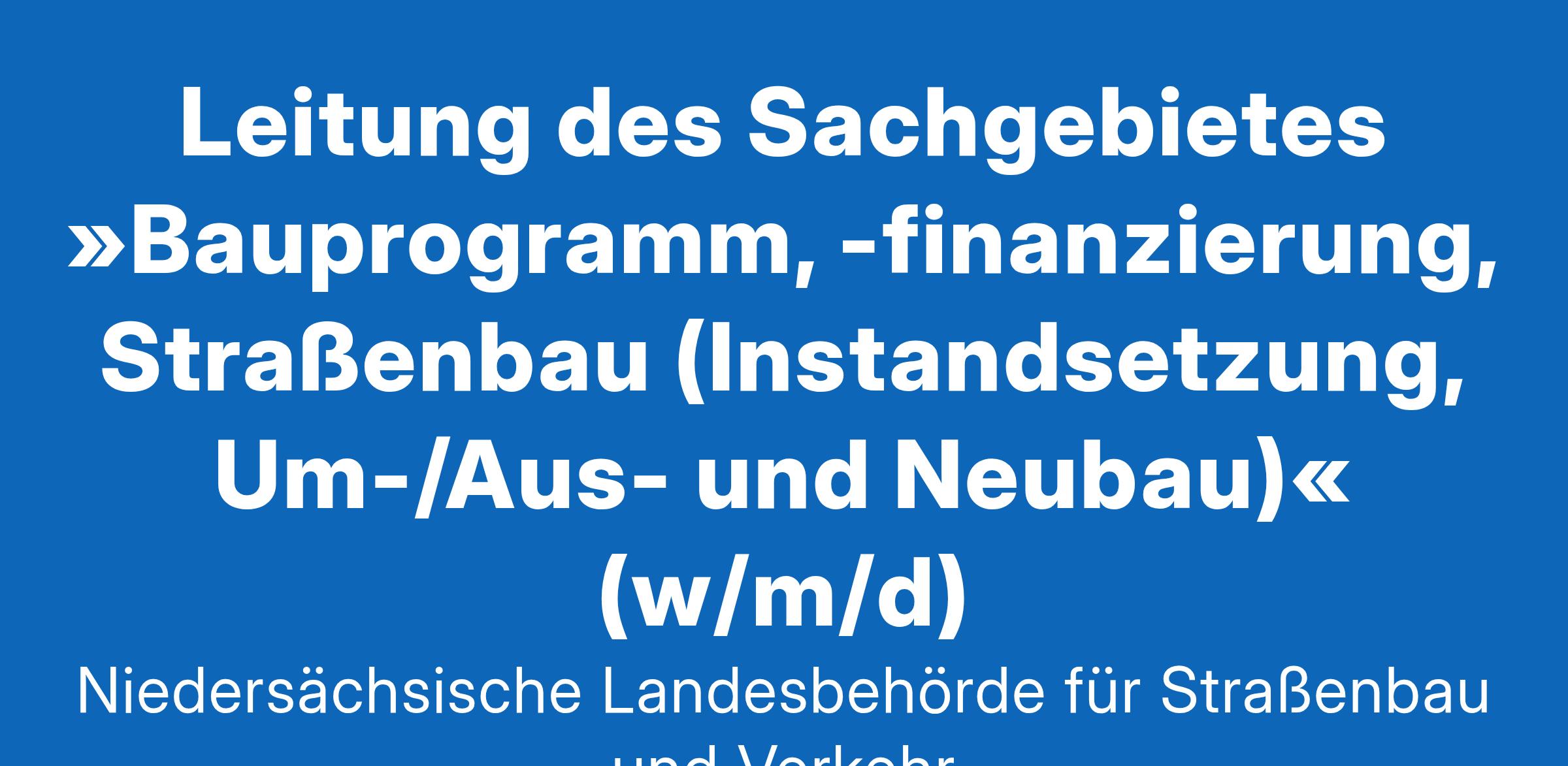 Niedersächsische Landesbehörde für Straßenbau und VerkehrLeitung des Sachgebietes „Bauprogramm, -finanzierung, Straßenbau (Instandsetzung, Um-/Aus- und Neubau)“ (w/m/d)GoslarÜber uns:In der Niedersächsischen Landesbehörde für Straßenbau und Verkehr ist im regionalen Geschäftsbereich Goslar im Fachbereich Bau zum nächstmöglichen Zeitpunkt derArbeitsplatz / Dienstposten