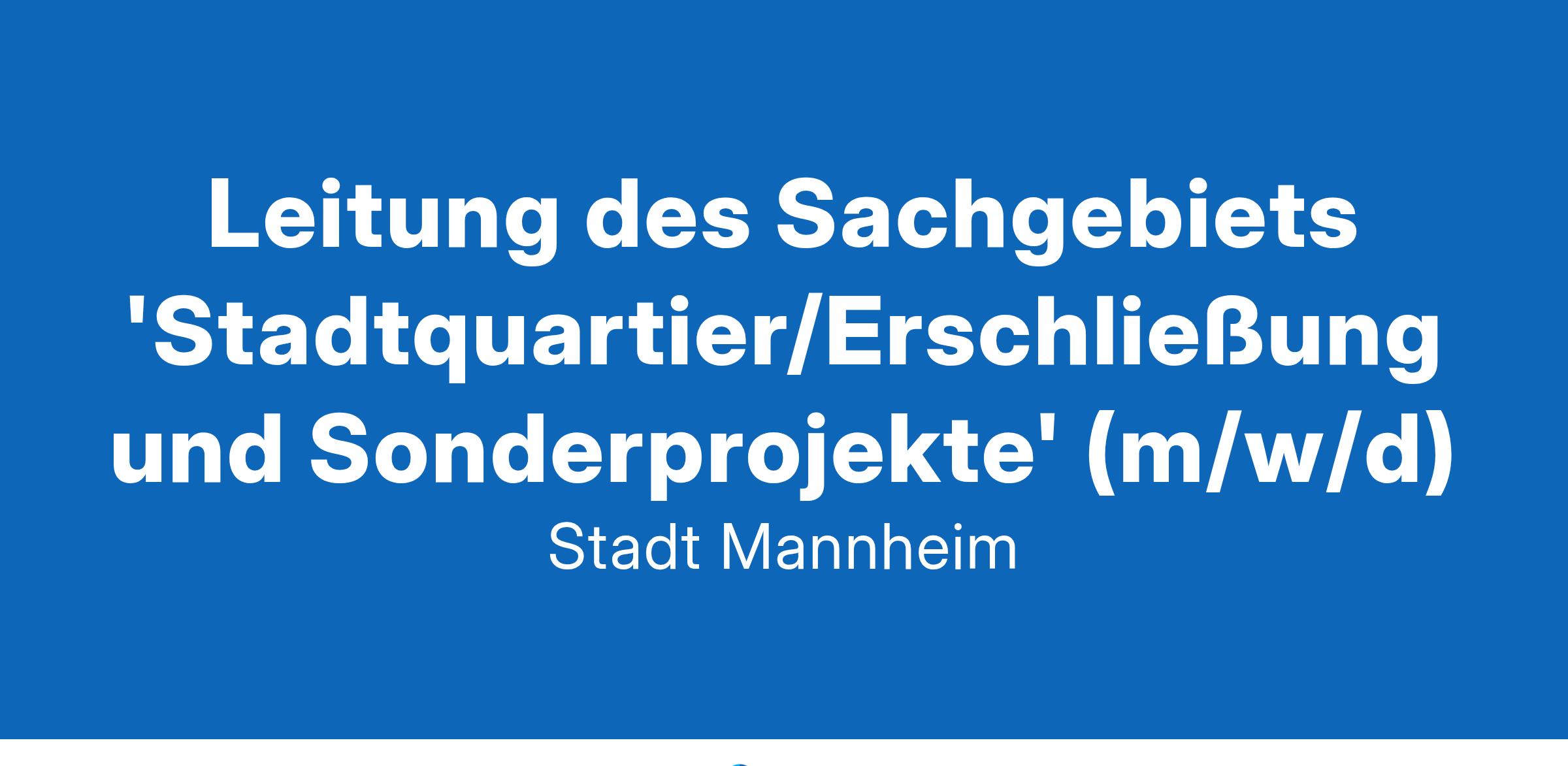 Gemeinsam für eine lebenswerte Stadt MannheimGestalten Sie zusammen mit über 8.000 Kolleg*innen die größte Stadt der Metropolregion Rhein-Neckar. Nachhaltigkeit, Familienfreundlichkeit, Vielfalt und Verlässlichkeit – dafür stehen wir. Bei uns bringen über 260 verschiedene Berufsfelder Innovation und Tradition zusammen.Der Eigenbetrieb Stadtraumservice sucht ab 01.08.2025 eineLEITUNG DES SACHGEBIETS "STADTQUARTIER/ERSCHLIESSUNG UND SONDERPROJEKTE" (M/W/D)