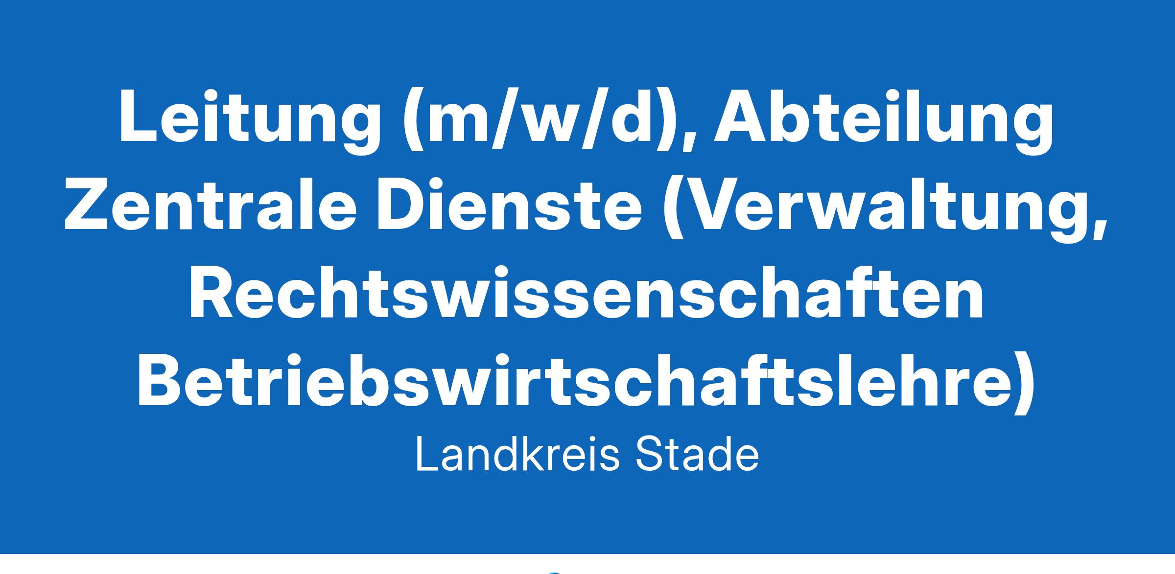 Der Landkreis Stade (rd. 200.000 Einwohnende) liegt im Norden Niedersachsens in direkter Nachbarschaft zur Hansestadt Hamburg und ist Teil der Metropolregion Hamburg; die Kreisverwaltung hat ihren Sitz in der Hansestadt Stade. Ein wohnortnahes, breites Angebot an allgemein- und berufsbildenden Schulen sowie vielfältige Angebote in den Bereichen Kultur, Bildung, Sport und Freizeitgestaltung sind vorhanden. Leitung (m/w/d), Abteilung Zentrale Dienste Beim Landkreis Stade ist im Amt Personal und Interner Service die Stelle der Leitung (m/w/d) der Abteilung Zentrale Dienste zu besetzen. Ihr Aufgabenbereich: die Abteilung Zentrale Dienste fachlich und personell leiten, insbesondere: Organisationsentwicklung und Aufgabenerfüllung koordinieren und steuern Ziele in Form der Jahresarbeitsplanung und Standards der Aufgabenerledigung festlegen Personalplanung, -entwicklung und -führung einschließlich regelmäßiger Jahresgespräche die Abteilung betreffende Projekte durchführen und leiten herausgehobene Sachbearbeitung für EU-weite Vergabeverfahren und schwierige Versicherungsfälle übernehmen sowie einzelfallbezogene Entscheidungen in den Bereichen Schließberechtigung, Fahrzeugreparaturen, Dienstkleidung und Ausstattung treffen bei der Haushaltsplanung mitwirken und die rechtskonforme Verwendung der Haushalts-mittel sicherstellen Ihr Profil: Sie entsprechen unserem Anforderungsprofil, wenn Sie über ein abgeschlossenes Studium (Diplom/FH bzw. Bachelor) einer der folgenden Fachrichtungen verfügen: Allgemeine Verwaltung (Public Administration) / Verwaltungsbetriebswirtschaft (Public Management), einhergehend mit der Befähigung für das 1. Einstiegsamt der Laufbahngruppe 2, Fachrichtung „Allgemeine Dienste“ Rechtswissenschaften mit mindestens der Ersten Juristischen Staatsprüfung Betriebswirtschaftslehre Dienstleistungsmanagement Alternativ entsprechen Sie unserem Profil, wenn Sie als Verwaltungsfachangestellter (m/w/d) die Angestelltenprüfung II (für Angestellte (m/w/d) im kommunalen Verwaltungs- und Kassendienst) abgeschlossen haben. Kenntnisse im Aufbau und zu den Abläufen einer Kommunalverwaltung sind von Vorteil. Außerdem sollten Sie neben einer aufgeschlossenen und kontaktfreudigen Art auch gute Kommunikationsfähigkeiten, Umsicht, Verhandlungs- und Organisationsgeschick sowie ein gutes IT-Verständnis mitbringen. Einstellungsvoraussetzungen sind außerdem das Vorhandensein eines eintragungsfreien Führungszeugnisses (Hinweis: der entsprechende Nachweis wird nach erfolgreicher Bewerbung angefordert) und Deutschkenntnisse auf dem Level C1 (Gemeinsamer Europäischer Referenzrahmen für Sprachen). Wir bieten: einen unbefristeten Arbeitsvertrag in Vollzeit, der teilzeitgeeignet ist eine Bezahlung nach Entgeltgruppe 11 TVöD/VKA weitere im öffentlichen Dienst übliche Leistungen, z.B. zusätzliche Altersversorgung (VBL), Leistungsorientierte Bezahlung bei Vorliegen der beamtenrechtlichen Voraussetzungen eine Einstellung im Beamtenverhältnis (Besoldungsgruppe A 11 NBesG) flexible Möglichkeiten der Arbeitszeitgestaltung (z.B. Homeoffice, Gleitzeitrahmen) eine moderne Arbeitsumgebung vielfältige Fortbildungsmöglichkeiten die Möglichkeit zur Nutzung des Jobtickets und des Jobbikes (Fahrradleasing) Schwerbehinderte und schwerbehinderten Personen gleichgestellte Bewerbende werden im Rahmen des gesetzlich Zulässigen bei gleicher Eignung bevorzugt berücksichtigt. Zum Abbau der Unterrepräsentanz im Sinne des Nds. Gleichberechtigungsgesetzes werden Bewerbungen von Männern besonders begrüßt. Außerdem sehen wir ausdrücklich Bewerbungen von Menschen mit dem Geschlechtseintrag „divers“ entgegen. Kontakt: Für Auskünfte steht die Leiterin des Amtes Personal und Interner Service, Frau Vagts, Tel. 04141 12-1010, gerne zur Verfügung. Haben wir Ihr Interesse geweckt? Dann freuen wir uns auf Ihre aussagekräftige Online-Bewerbung bis zum 25.02.2025 über www.landkreis-stade.de/jobs. Landkreis Stade · Der Landrat · 21677 Stade www.landkreis-stade.de Landkreis Stade · Der Landrat · 21677 Stade www.landkreis-stade.de