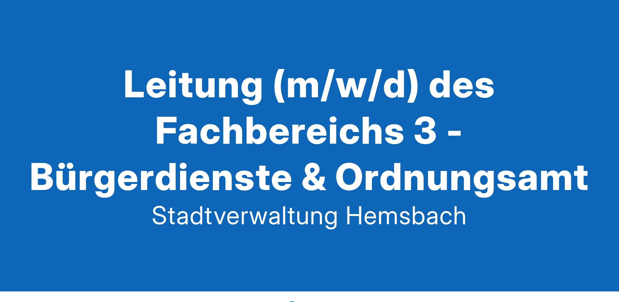 Die Stadt Hemsbach sucht eine engagierte Persönlichkeit, die Verantwortung übernimmt und mit Führungsstärke das Team leitet und motiviert. Dabei steht stets die Dienstleistung mit einem hohen Serviceanspruch für die Bürgerinnen und Bürger der Stadt Hemsbach im Vordergrund.