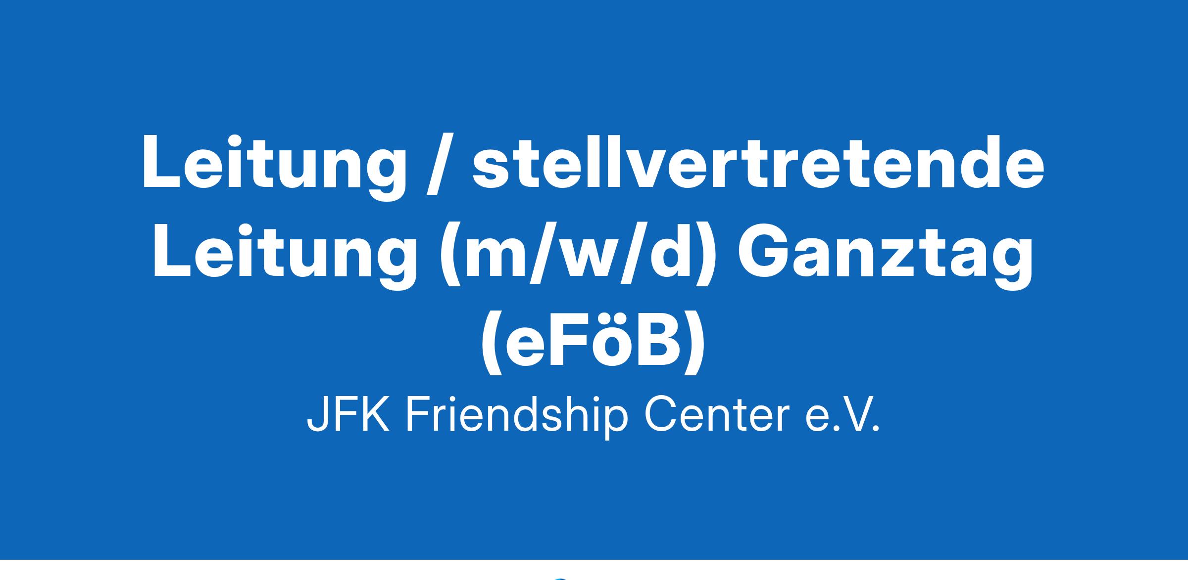 THE BEST WAY TO HAVE A FRIEND? BE ONE!Findest Du auch, oder? Schon seit 1983 setzen wir vom JFK Friendship Center e.V. uns in Berlin für die deutsch-amerikanische Freundschaft ein und sind Träger von zwei bilingualen, bikulturellen Kindertagesstätten sowie Kooperationspartner der JFK Schule. Wir haben uns Familie, Kultur und Interkulturalität auf die Fahne geschrieben und suchen nun DICH in Teilzeit für unsere Kindertagesstätte Lucky Kids. Werde Teil unserer aufgeschlossenen, bunten Welt und gewinne neue Freunde als Leitung / stellvertretende Leitung (m/w/d) Ganztag (eFöB)Aufgaben: Umsetzung des Berliner Bildungsprogramms für die offene Ganztagsschule sowie unseres Konzeptes Personalführung, -planung und -entwicklung Kommunikation und Zusammenarbeit mit Eltern, Geschäftsführung, Jugendamt, Beratungsstellen und der Schule Qualitätsmanagement und Verwaltungstätigkeiten Profil: Eine staatliche Anerkennung als Erzieher*in mit einer Zusatzqualifikation im Leitungsbereich, als Sozialpädagoge*in oder als Kindheitspädagoge*in mit Berufserfahrung in der ergänzenden Förderung und Betreuung an Grundschulen oder eine vergleichbare Qualifikation. Leitungserfahrung Fundierte Kenntnisse des Berliner Bildungsprogramms für die offene Ganztagsgrundschule Mehrjährige Erfahrungen in der Zusammenarbeit mit Eltern und Kooperationspartnern Eigenverantwortlichkeit, Kommunikations- und Organisationsvermögen Ausgeprägte soziale Kompetenz und ein gewinnendes Auftreten, dialogische und ressourcenorientierte Haltung Durchsetzungsfähigkeit, Teamfähigkeit sowie Reflexionskompetenz Sehr gute Microsoft-Office Kenntnisse Interkulturelle und interreligiöse Offenheit Deutsche- und Englisch-Sprachkenntnisse, wovon eine der beiden Sprachen auf muttersprachlichem Niveau beherrscht werden sollte Für Dich! Attraktive Vergütung angelehnt an TV-L Anlage G Jahressonderzahlung und Urlaubsgeld Vermögenswirksame Leistungen Altersvorsorge mit Arbeitgeberanteil Benefit Karte Gesundheitsförderung, bis zu 480,-- € jährliches Gesundheitsbudget Firmenfitness-Kooperation BVG-Firmenticket Sehr gut ausgestatteter Arbeitsplatz Wöchentliche Teamzeit sowie mehrere Teamtage pro Jahr 30 Tage Urlaub zzgl. Sonderurlaub am Geburtstag Umfangreiche Weiterbildungsmöglichkeiten Kurzfristige Prozesse durch freie Trägerschaft Kontakt:Wenn Sie sich dieser großartigen, lebendigen Aufgabe mit Freude und besonderer Hingabe widmen möchten, dann bewerben Sie sich bitte vorzugsweise per E-Mail: JETZT BEWERBEN! Hort (eFöB an der John F. Kennedy Schule)