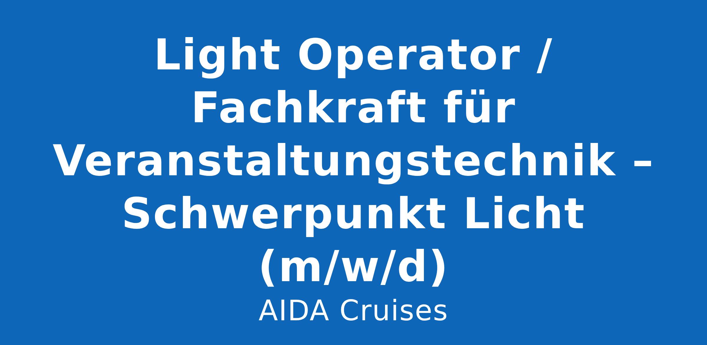 Willkommen bei AIDA - dem Unternehmen, in dem Teamspirit wirklich gelebt wird. Komm in unsere internationale AIDA Familie und arbeite bei einem der bekanntesten und innovativsten Kreuzfahrtunternehmen weltweit. Um die Schönheit der Meere und der Erde zu schützen, sind wir Vorreiter für nachhaltige Kreuzfahrt. Entdecke bei uns deinen #PlaceToWe. Zum nächstmöglichen Zeitpunkt suchen wir dich an Bord unserer Schiffe. Bedienung der Lichtsteuerpulte, Medienserver und Laser Systeme während der Proben, der Shows/ Veranstaltungen im bordeigenen Theater sowie auf dem Pooldeck (MA Lighting, grandMA 2/3, coolux Pandoras Box, Martin Movingheads, LED Wände, Laser Systeme)Gesamtverantwortung und Hauptansprechpartner im Bereich LightingProgrammierung von externen KünstlernWartung, Pflege und Verwaltung der Entertainment LichttechnikEnge Zusammenarbeit mit den Ton- und Bühnentechnikern Ausbildung zur Fachkraft für Veranstaltungstechnik oder Quereinsteiger – jeweils mit mehrjähriger, einschlägiger Erfahrung als Operator in FOHs (Theater / Musical / Show)Sichere EnglischkenntnisseHohe Belastbarkeit, Teamfähigkeit, Flexibilität