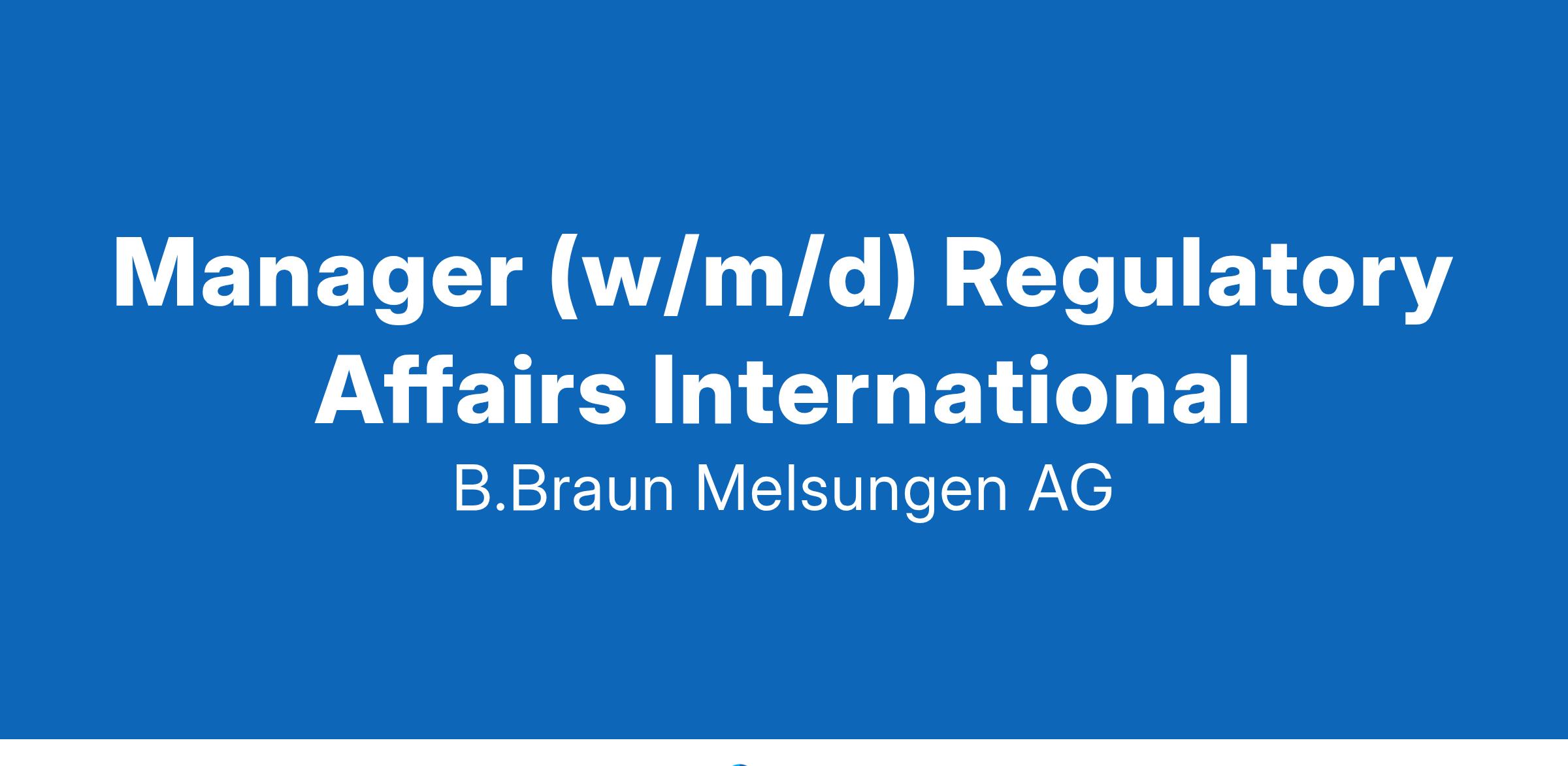 Sie sind ein wichtiger Teil unserer Zukunft. Hoffentlich sind wir auch ein Teil Ihrer Zukunft! Bei B. Braun schützen und verbessern wir die Gesundheit der Menschen weltweit. Sie unterstützen diese Vision, indem Sie Ihr Know-how einbringen und Innovation, Effizienz und Nachhaltigkeit als Werte teilen. Deshalb möchten wir unser Unternehmen gemeinsam mit Ihnen weiter entwickeln. Mit Blick auf Ihre Zukunft leisten wir gemeinsam einen Beitrag zur Gesundheitsversorgung weltweit, mit Vertrauen, Transparenz und Wertschätzung. Das ist Sharing Expertise.Innerhalb der B. Braun Melsungen AG suchen wir für das Center of Excellence Infusion & Pain Therapie, Abteilung Regulatory Affairs International, zum nächstmöglichen Termin einenManager (w/m/d) Regulatory Affairs Internationalam Standort Melsungen.Unternehmen: