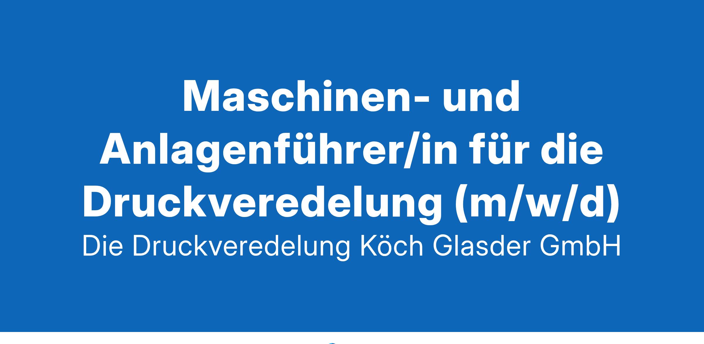 Die Druckveredelung Köch & Glasder GmbH Maschinen- und Anlagenführer/in für die Druckveredelung (m/w/d) Neuss Die Druckveredelung Köch & Glasder GmbH – Ihr Partner für hochwertige Veredelungslösungen! Mit über 30 Jahren Erfahrung in der Druckveredelung haben wir uns auf die Produktion hochwertiger Verpackungen für die Kosmetik-, Lebensmittel- und Non-Food-Industrie spezialisiert. Unser hochmoderner Maschinenpark und unser engagiertes Team sind die Grundlage unseres Erfolgs. Für die Verstärkung unseres Teams suchen wir ab sofort motivierte, technisch versierte Fachkräfte als Maschinen- und Anlagenführer (m/w/d) für den Prägetransferdruck in Vollzeit Ihr Verantwortungsbereich: Selbstständiges Rüsten und Bedienen unserer Veredelungsmaschinen (insbesondere Prägetransferdruckmaschinen der Marke Bobst)