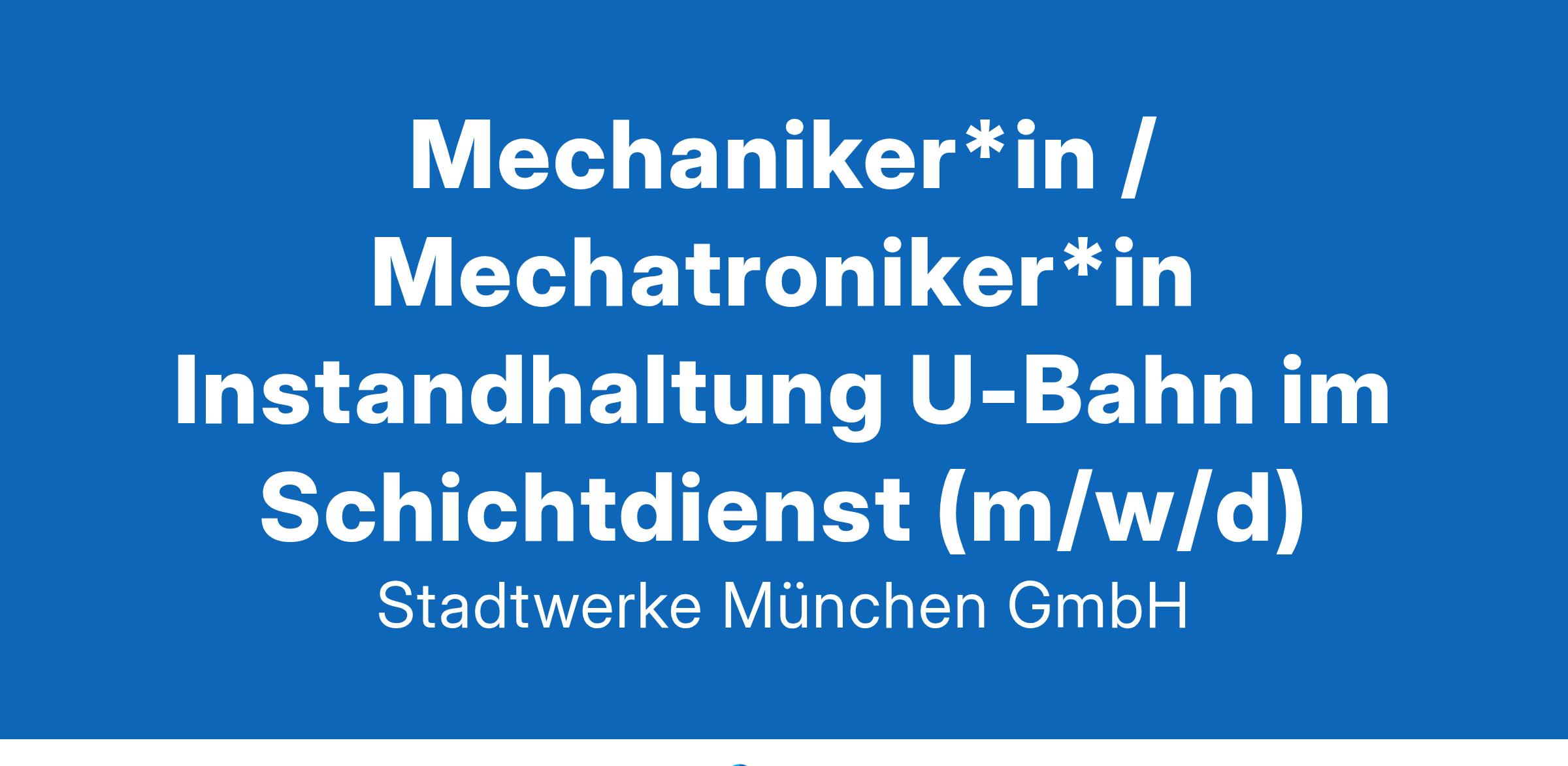 Mechaniker*in / Mechatroniker*in Instandhaltung U-Bahn im Schichtdienst (m/w/d) Jetzt bewerben » Tätigkeitsbereich Wartung, Revision und Reparatur | U-Bahnfahrzeuge UnternehmenStadtwerke München GmbH Standort München VertragsartVollzeit Auf einen Blick Unser Instandhaltungs-Team aus ca. 75 Kollegen*innen für die U-Bahn in der technischen Basis in Fröttmaning sorgen mit ihrem technischen Fachwissen dafür, dass unsere 200 U-Bahnen störungsfrei und sicher im Streckennetz unterwegs sind. Im 2-Schichtbetrieb (Früh- und Spätschicht ohne Nachtschicht) von Montag bis Sonntag führen wir komplizierte Fehlersuchen bis hin zur einfachen Wartungstätigkeit durch. Bei uns wartet ein abwechslungsreiches Aufgabengebiet mit Tätigkeiten an unseren verschiedenen Fahrzeugtypen – mit der ganzen Bandbreite der Technik von 1970 bis heute - auf Sie. Sie haben noch nicht an U-Bahnfahrzeugen gearbeitet? Gar kein Problem! Mit unserer Erfahrung bringen wir Ihnen das notwendige Handwerkszeug für diese Position bei und freuen uns auf Ihre Bewerbung. Wir legen großen Wert auf Diversität und Chancengleichheit — erfahren Sie hier mehr über unsere kulturfördernden Initiativen. Das können Sie bei uns bewegen
