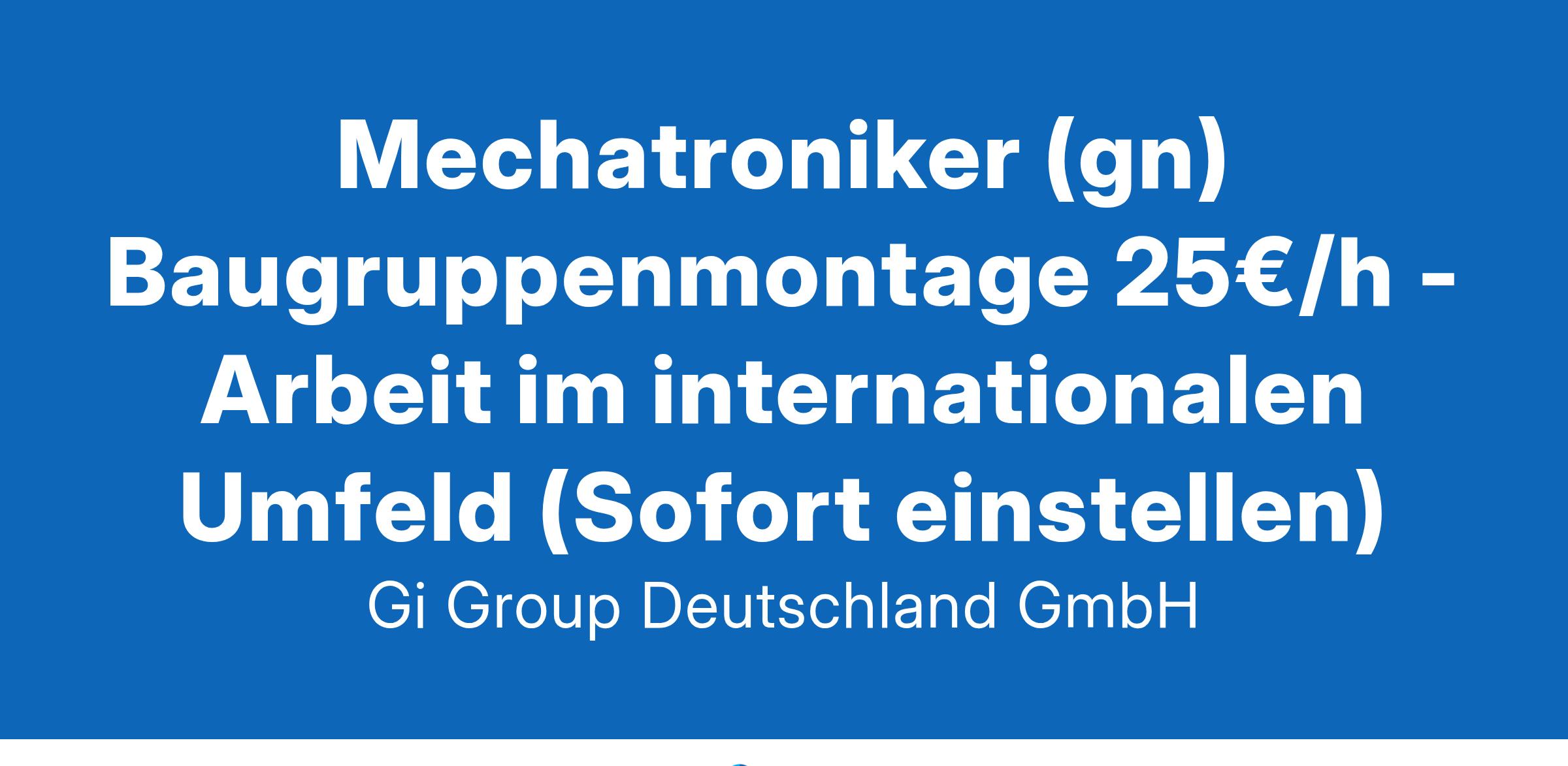 Mechatroniker (gn) Baugruppenmontage 23€/h ab sofort in Vollzeit in Hamburg Bergedorf Die Gi Group ist ein international agierender Personaldienstleister mit mehr als 500 Standorten in 40 Ländern. Für ein Unternehmen aus dem Sondermaschinenbau suchen wir für den nächstmöglichen Zeitpunkt mehrere Mechaniker, Mechatroniker und Elektroniker. Deine Aufgaben Eigenständige Montage und Installation von Baugruppen und anschließender Kontrolle Vorbereitung von Baugruppen und anschließende Montage Einbau und Installation von Baugruppen nach Stückliste und Fertigungsanleitung Überprüfung der Bauteile nach Plan und Funktionskontrolle Dokumentation aller abgeschlossenen Tätigkeiten Dein Profil Abgeschlossene Ausbildung im Bereich Mechatronik oder Mechanik, z.B. als Industriemechaniker, Mechatroniker oder ähnlich Erste Berufserfahrung im Bereich Fertigungsmontage, Baugruppenmontage wünschenswert Flexibilität und Einsatzbereitschaft Hohes Qualitätsbewusstsein, eigenständiges Arbeiten  Unser Angebot Festanstellung bei der Gi Group Zuschuss zum Deutschlandticket Bezahlung nach IG Metall (equal pay) Arbeitszeitkonto für entsprechende Flexibilität Langfristiger Job mit Übernahmemöglichkeit Abwechslungsreiche Tätigkeiten Sprungbrett in den Arbeitsmarkt Einen persönlichen Ansprechpartner  Deine Bewerbung Für Deine Bewerbung als Mechatroniker klicke bitte einfach auf „Jetzt bewerben“. Dort kannst Du Deine Kontaktdaten eingeben sowie Deinen Lebenslauf und Deine Bewerbungsunterlagen hochladen. Du benötigst dafür nur ca. 1 Minute. Dein zuständiger Personaldisponent wird sich bei Dir schnellstmöglich melden. Gerne kannst Du uns auch Deine Bewerbungsunterlagen per E-Mail zusenden. Wir freuen uns auf Deine Bewerbung! Unsere Stellenangebote richten sich an Arbeitssuchende jeglichen Geschlechts. (gn) = geschlechtsneutral. Kontakt Gi Group Recruiting Team