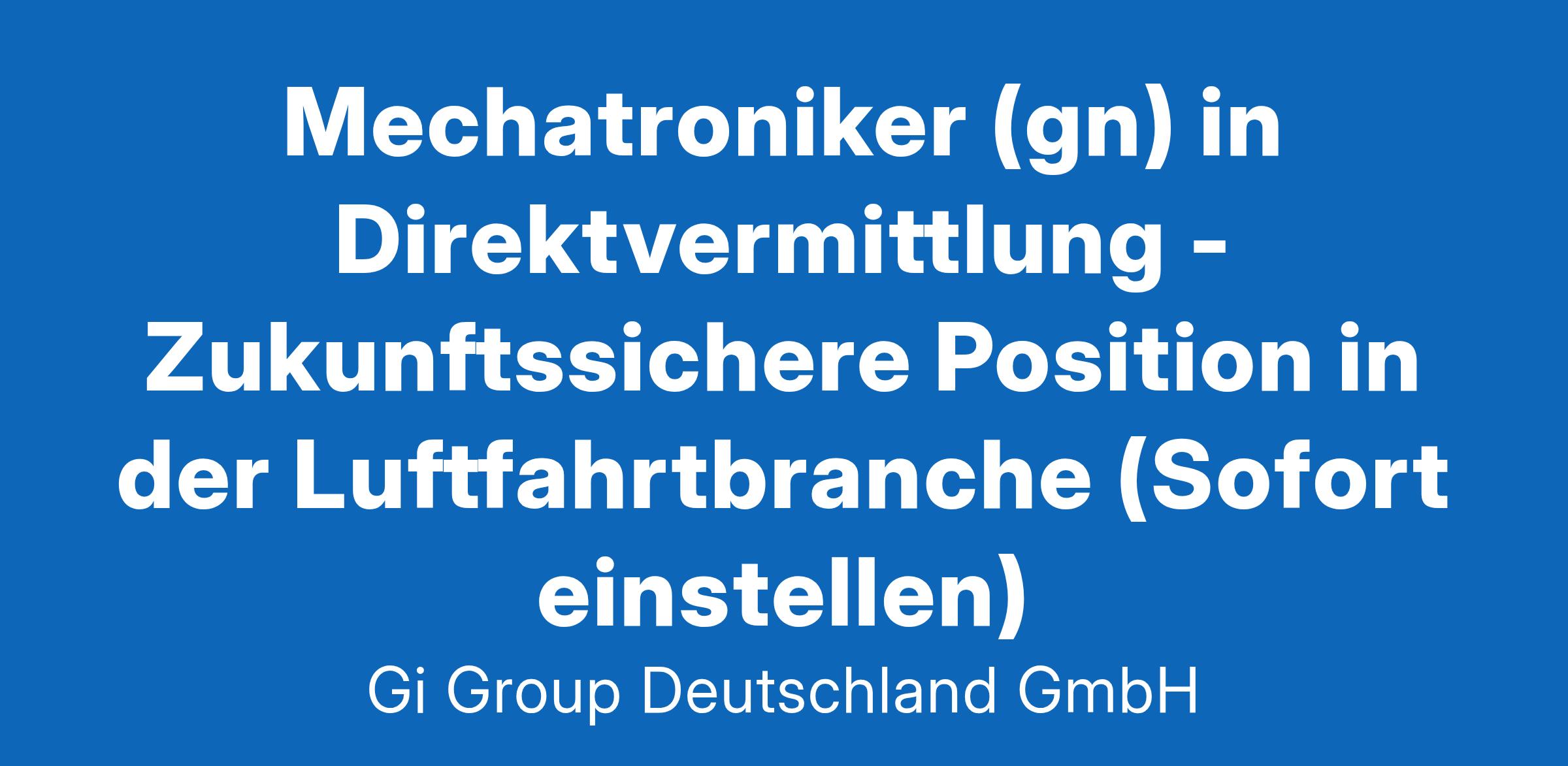 Mechatroniker (gn) in der Luftfahrtindustrie ab sofort in Vollzeit in Hamburg im Rahmen der Direktvermittlung Die Gi Group ist ein international agierender Personaldienstleister mit mehr als 500 Standorten in 40 Ländern. Unser Kunde ist ein renommiertes und zukunftsorientiertes Unternehmen aus der Luftfahrt. Deine Aufgaben Ausführung von Reparaturen an elektromechanischen Bauteilen und Geräten Fehlerdiagnosen an elektromechanischen Fluggeräten oder Baugruppen unter Anwendung von Messgeräten, Test- und Prüfeinrichtungen durchführen Mit technischen Unterlagen arbeiten und die Dokumentation entsprechend pflegen Dein Profil Eine abgeschlossene Berufsausbildung in einem luftfahrttechnischen Bereich, z.B. Fluggerätelektronik Alternativ ist eine abgeschlossene Berufsausbildung in einem Beruf mit Schwerpunkt Mechatronik, z.B. Mechatroniker, Elektromechaniker oder eine gleichwertige Qualifikation wünschenswert Fachkenntnisse in der Wartung, Instandhaltung und Montage Bereitschaft zum Erwerb fehlender Qualifikationen sowie zu berufsbezogener Weiterbildung Gute Englischkenntnisse Das bietet unser Kunde Urlaubs- und Weihnachtsgeld sowie eine Gewinnbeteiligung Flexible Arbeitszeiten (Gleitzeit, keine Schichtarbeit) und 30 Tage Urlaub Flugvergünstigungen, Einkaufsrabatte in Geschäften und Jobrad-Leasing Kostenloses Parken, betriebliche Altersvorsorge und Verpflegungszuschuss für die Kantine Deine Bewerbung Für Deine Bewerbung als Mechatroniker klicke bitte einfach auf „Jetzt bewerben“. Dort kannst Du Deine Kontaktdaten eingeben sowie Deinen Lebenslauf und Deine Bewerbungsunterlagen hochladen. Du benötigst dafür nur ca. 1 Minute. Dein zuständiger Personaldisponent wird sich bei Dir schnellstmöglich melden. Gerne kannst Du uns auch Deine Bewerbungsunterlagen per E-Mail zusenden. Wir freuen uns auf Deine Bewerbung als Mechatroniker in der Luftfahrtindustrie! Unsere Stellenangebote richten sich an Arbeitssuchende jeglichen Geschlechts. (gn) = geschlechtsneutral. Kontakt Gi Group Recruiting Team