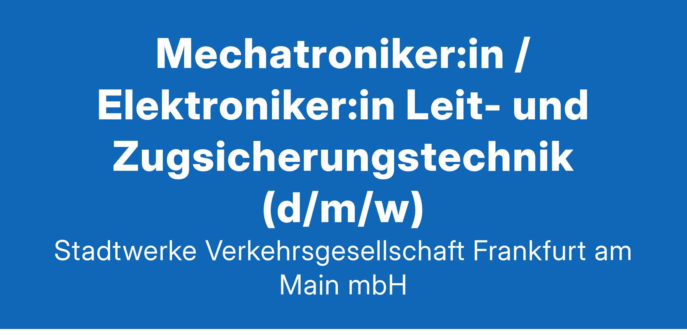 Mechatroniker:in / Elektroniker:in Leit- und Zugsicherungstechnik (d/m/w)WIR BEWEGEN MENSCHENAls Verkehrsdienstleisterin arbeiten wir an der Zukunft Frankfurts - als Arbeitgeberin kümmern wir uns mit Ihnen um Ihre Zukunft. Darum leben wir in unserem Unternehmen Offenheit, Toleranz und Gleichberechtigung und unterstützen Sie mit vielfältigen Benefits. Wir glauben: Der Nahverkehr ist die Zukunft der Mobilität. Deswegen entwickeln wir mit Leidenschaft neue Ideen und Konzepte.