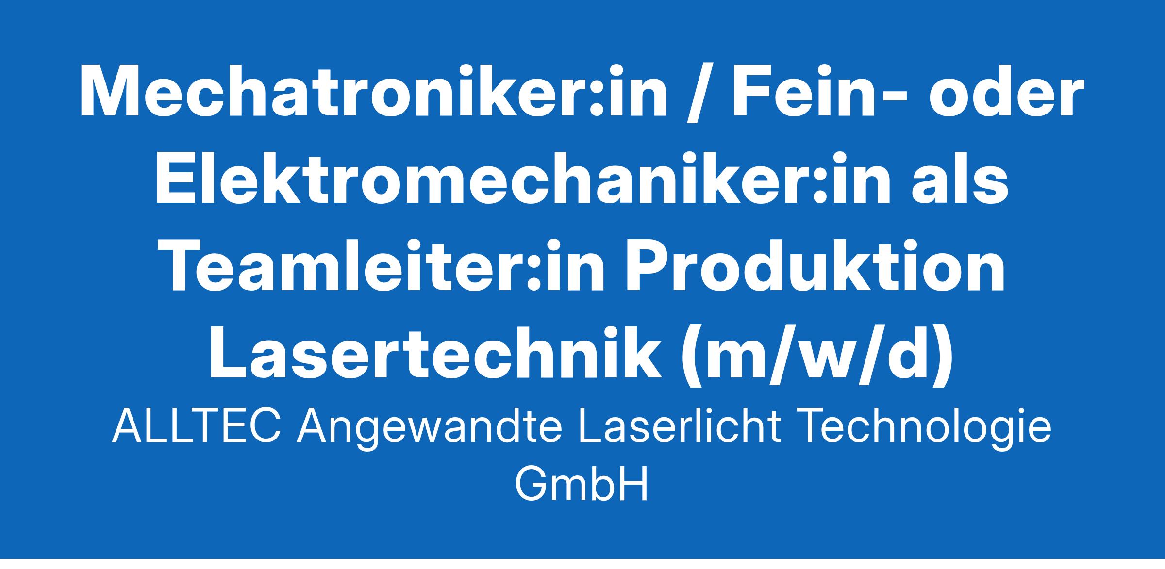 ALLTEC zählt zu den internationalen Markt- und Technologieführern für innovative Lasermarkiersysteme. Wir bieten unsere Lösungen unter unserer eigenen Marke FOBA sowie über unsere starken Partner Videojet und Linx an. ALLTEC ist als globales Technologiezentrum für Laserkennzeichnungslösungen Teil der Produktidentifizierungssparte der börsennotierten Veralto Corporation. FOBA ist führend bei kameragestützten Präzisionssystemen, Maschinen und Prozessen zum Markieren und Gravieren mit Lasern. Wir helfen unseren Kunden, die Rückverfolgbarkeit ihrer Erzeugnisse zu ermöglichen, Qualität und Marken zu schützen, Produkte zu gestalten und frühzeitig auf Trends und Vorschriften zu reagieren – insbesondere in unseren Schlüsselmärkten Medizintechnik, Automobilindustrie sowie in der Luftfahrt- und Elektronikbranche. Dank unserer jahrzehntelangen Laser-Applikationsexpertise, Technologieführerschaft in der bildgebenden Laserkennzeichnung und konsequenten Kunden- und Serviceorientierung können wir auf mehrere Tausend erfolgreich installierte Systeme weltweit verweisen. Wir suchen zum nächstmöglichen Zeitpunkt an unserem Standort Selmsdorf bei Lübeck eine:n Mechatroniker:in / Fein- oder Elektromechaniker:in als Teamleiter:in Produktion Lasertechnik Ihre Aufgaben Fachliche und disziplinarische Leitung eines Teams im Bereich Produktion, inklusive etwaiger Problemlösungen und Unterstützung im Produktionsablauf Kapazitätsplanung und effiziente Steuerung einer / mehrerer Produktionslinien zur termingerechten Fertigung der Produkte gemäß unseren Qualitätsvorgaben, inklusive Ergebnisdokumentation Einhalten aller relevanten Unfallverhütungs-, Arbeitssicherheits- und Umweltschutzstandards Fachliche Weiterentwicklung des Teams, inklusive Erarbeiten individueller Entwicklungspläne Kooperative Zusammenarbeit mit allen involvierten Abteilungen Ihr Profil Berufsausbildung und Erfahrung als Mechatroniker:in, Feinmechaniker:in oder Elektromechaniker:in – aber auch Quereinsteiger:innen mit mehrjähriger Berufserfahrung sind herzlich willkommen Teamgeist, Verantwortungsbereitschaft und Offenheit für stetige Veränderungen Selbstständige, strukturierte und lösungsorientierte Arbeitsweise Das bieten wir Flexible Arbeitszeiten mit Zeiterfassung im Rahmen unserer Gleitzeit – wahlweise in Teil- oder Vollzeit für bestmögliche Vereinbarkeit von Familie und Beruf Individuell auf Sie zugeschnittener Einarbeitungsplan – auch eine Probearbeit ist möglich Leistungsorientiertes Gehalt plus betriebliche Altersvorsorge (Entgeltumwandlung), Unfallversicherung und Gesundheitsvorsorge Mitarbeiterbonus gemäß Geschäftserfolg, Jubiläumsprämien sowie jährlicher Gehaltsüberprüfung E-Bike-Leasing nach der Probezeit Gezielte Personalentwicklungs- und Weiterbildungsmaßnahmen für Ihr persönliches Vorankommen Attraktives Mitarbeiterempfehlungsprogramm, Kurzpraktika und Mitarbeiterevents Ihre Chance Ergreifen Sie jetzt Ihre Chance und bewerben Sie sich über unser Karriereportal! Unser erklärtes Ziel ist es, den Frauenanteil bei Alltec zu steigern – deshalb ermutigen wir alle qualifizierten Personen, insbesondere aber Frauen, sich bei uns zu bewerben. Freuen Sie sich auf spannende berufliche Perspektiven, abwechslungsreiche Aufgaben, die sich stets an der neuesten Technologie orientieren, sowie ein kollegiales, wertschätzendes und durchweg positives Betriebsklima. Wir weisen ausdrücklich darauf hin, dass wir uns auch über Bewerbungen von Menschen mit Behinderung freuen. ALLTEC Angewandte Laserlicht Technologie GmbH An der Trave 27–31 23923 Selmsdorf T (Inhalt entfernt) 55–0 F (Inhalt entfernt) 55–222 (Inhalt entfernt) (Inhalt entfernt)