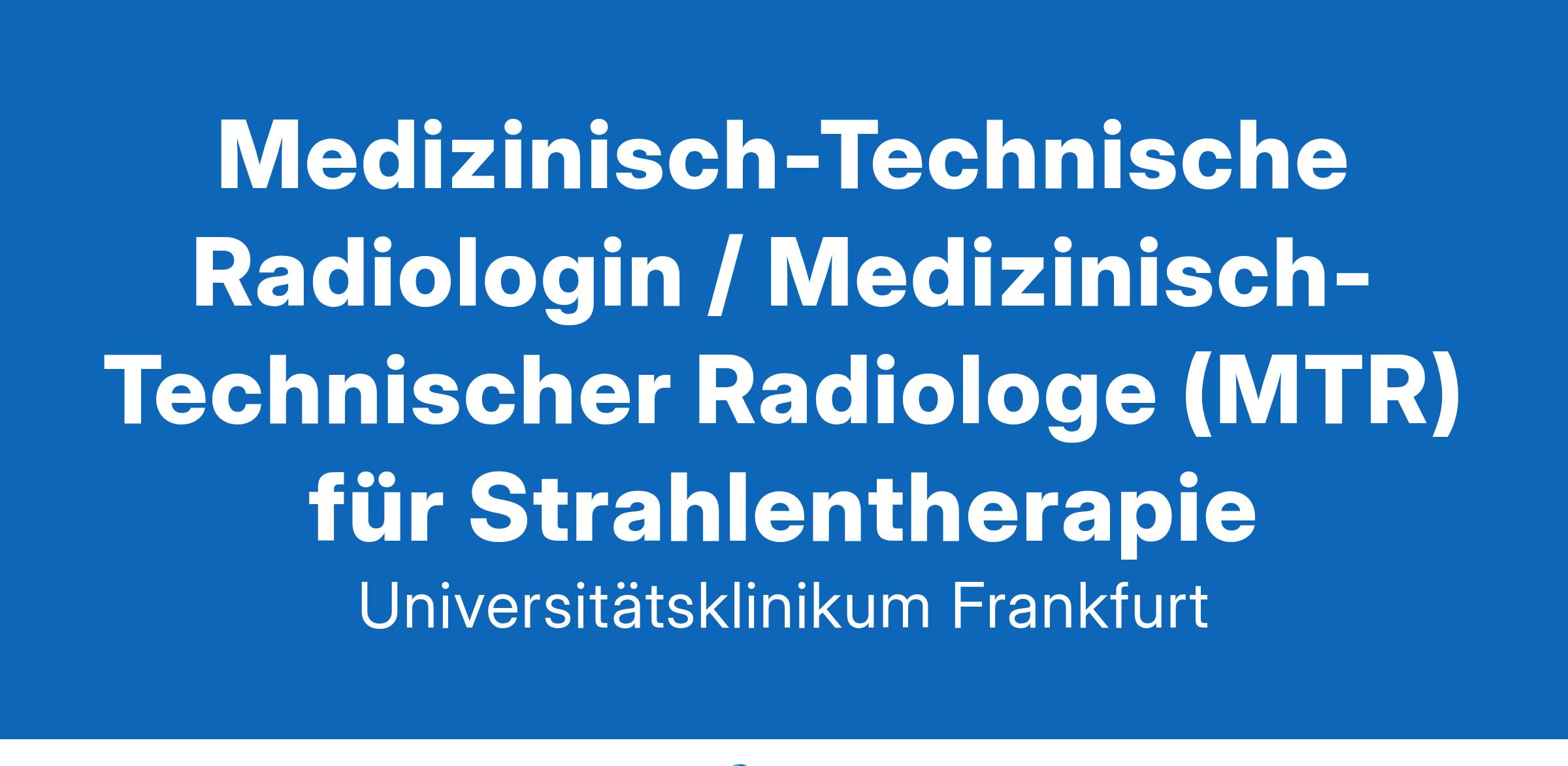 „Aus Wissen wird Gesundheit“ - wir füllen dieses Motto tagtäglich mit Leben, entwickeln neue Ideen und Altbewährtes weiter. Das Universitätsklinikum Frankfurt besteht seit 1914 und unsere rund 8.500 Beschäftigten bringen sich mit ihrem Können und Wissen an den 33 Fachkliniken, klinisch theoretischen Instituten und in den Verwaltungsbereichen ein. Die enge Verbindung von Krankenversorgung mit Forschung und Lehre sowie ein Klima der Kollegialität, Internationalität und berufsgruppenübergreifender Zusammenarbeit zeichnen das Universitätsklinikum aus.Medizinisch-Technische Radiologin / Medizinisch-Technischer Radiologe (MTR) für Strahlentherapie(wir richten uns mit dieser Ausschreibung an Bewerbende jeden Geschlechts)Vollzeit | unbefristet | Ausschreibungsnummer: 965-2024In unserer Klinik für Strahlentherapie in der Universitätsmedizin Frankfurt am Main decken wir in zwei Diensten ohne Nachtdienst ein breites Spektrum moderner Strahlentherapieverfahren ab. Mit aktuell drei Elekta Bestrahlungsgeräten bietet die Klinik ein innovatives und dynamisches Arbeitsumfeld.