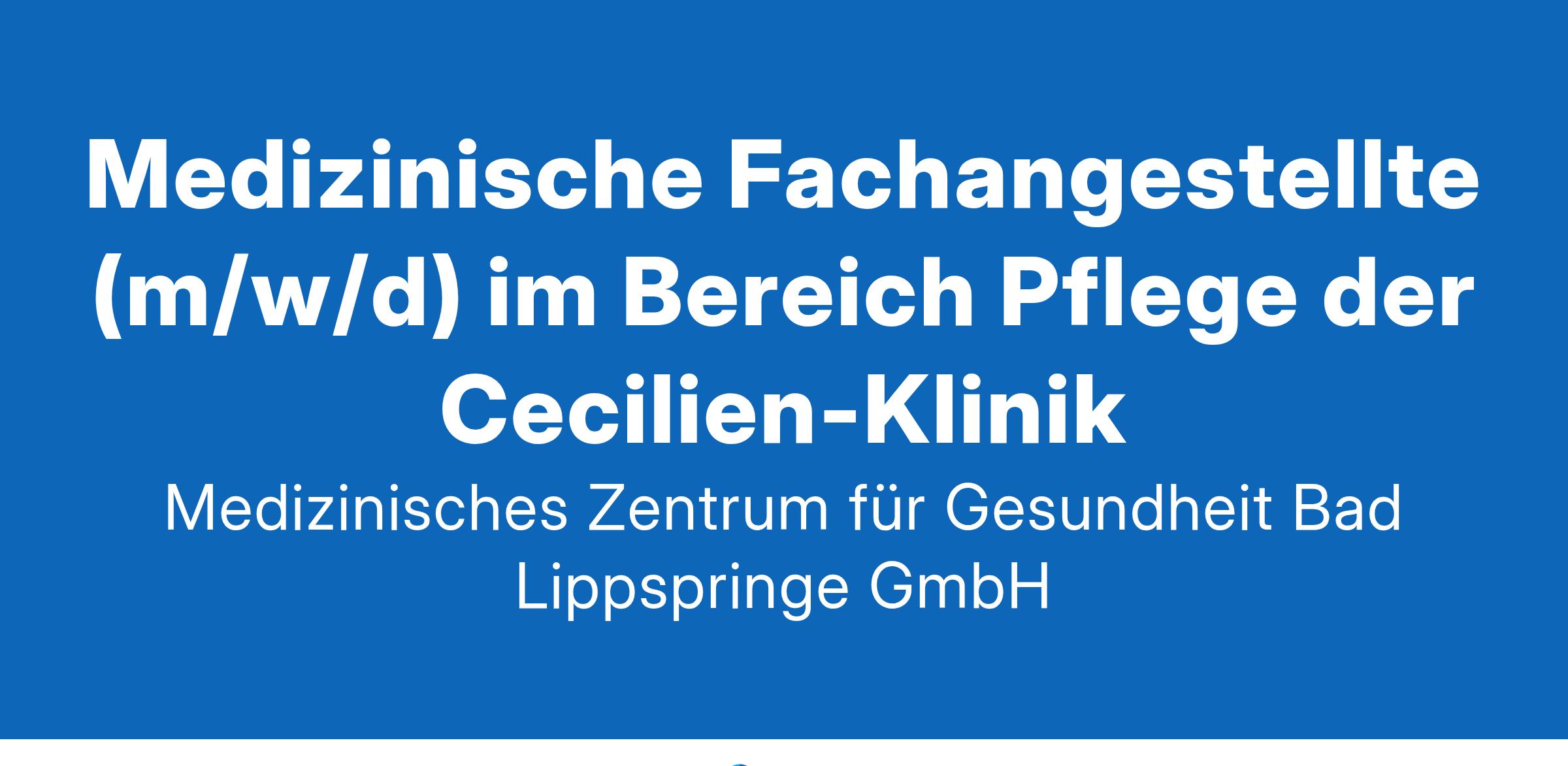 Medizinische Fachangestellte (m/w/d) im Bereich Pflege der Cecilien-KlinikDas Medizinische Zentrum für Gesundheit in Bad Lippspringe ist ein leistungsstarker Klinikverbund mit vielfältigen Angeboten in der Prävention, Akutmedizin, Rehabilitation und Pflege mit rund 1.200 Beschäftigten und 200 Auszubildenden.