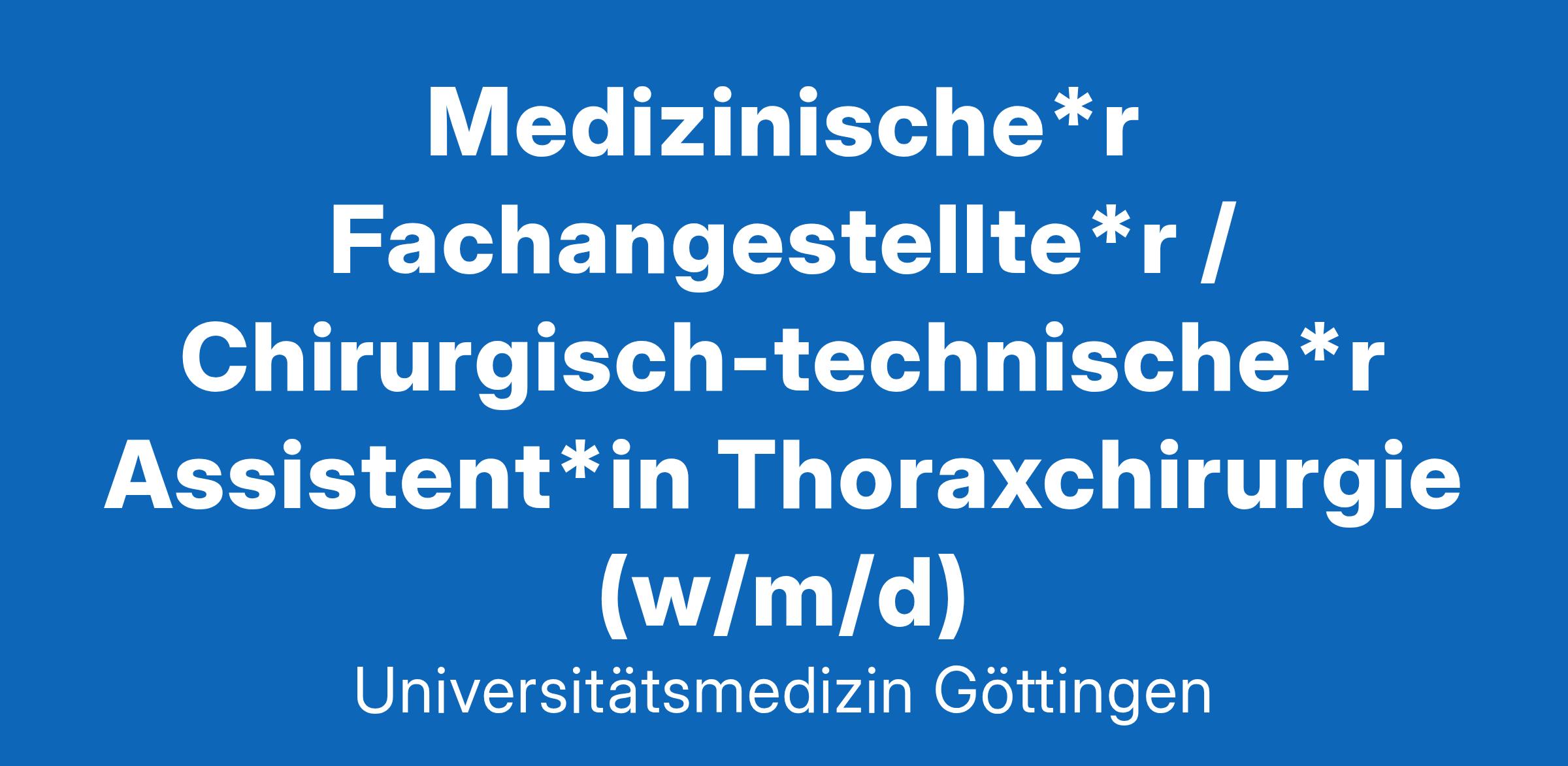 Göttingen als Stadt der Wissenschaft liegt im Zentrum Deutschlands und die Universitätsmedizin ist vor Ort eingebunden in ein attraktives Netzwerk universitärer und außeruniversitärer Wissenschaftseinrichtungen. Klinik für Herz-, Thorax- und Gefäßchirurgie der Universitätsmedizin Göttingen sucht zum frühestmöglichen Eintrittstermin: Medizinische*n Fachangestellte*n/Chirurgisch-Technische*n Assistent*in Thoraxchirurgie (w/m/d) Vollzeit, befristet für die Dauer von 2 Jahren Die Klinik für Herz-, Thorax- und Gefäßchirurgie ist in den Versorgungsbereichen Herz-, Thorax- und Gefäßchirurgie sowie in der chirurgischen Intensivmedizin auf hohem Niveau tätig. Wir leben eine intensive Zusammenarbeit mit allen Fachkliniken, unseren Zuweisern, weiterbehandelnden Kliniken und Hausärzt*innen unserer Patient*innen und führen eine Hochschulambulanz zur Diagnostik und Nachsorge unserer herz-, thorax- und gefäßchirurgischen Patient*innen.