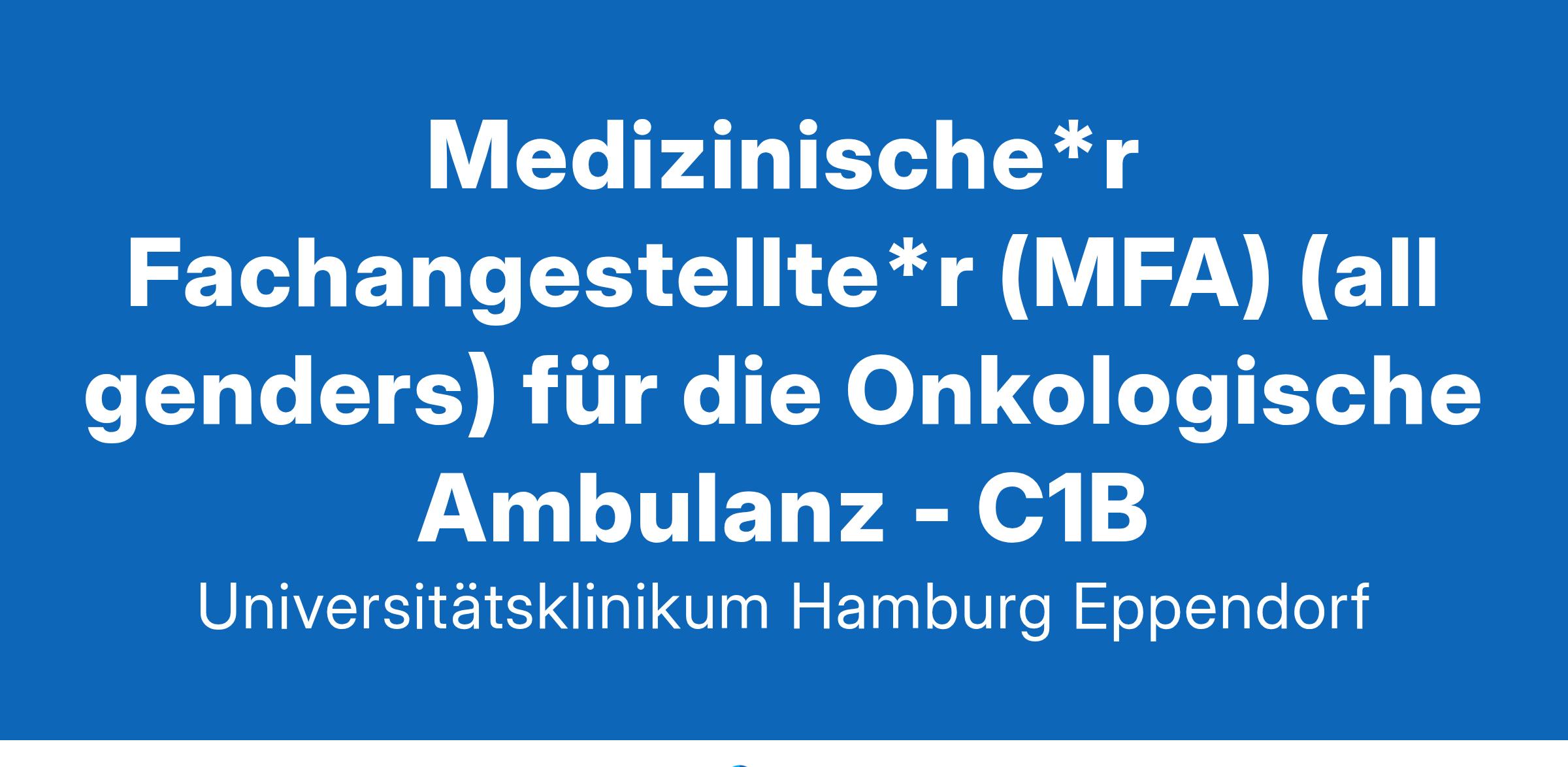 "GENERATIONEN EINE BERUFLICHE UND PERSÖNLICHE PERSPEKTIVE BIETEN." Faruk Y.: Medizinischer Fachangestellter Medizinische:r Fachangestellte:r (MFA) (all genders) für die Onkologische Ambulanz - C1B Vollzeit/Teilzeit | Unbefristet | Arbeitsort: Hamburg Eppendorf UKE_Zentrum für Onkologie Gemeinsam besser. Fürs Leben. Wir sind das Universitätsklinikum Hamburg-Eppendorf (UKE) – und stehen für exzellente Kompetenz in Forschung, Lehre und der vollumfänglichen Gesundheitsversorgung in unseren Kliniken. Unsere rund 15.300 Mitarbeiter:innen streben jeden Tag aufs Neue danach, mit ihrem Beitrag die Welt ein bisschen gesünder zu machen. Es ist unser Anspruch, eine der führenden Universitätskliniken zu sein – und gleichzeitig der beste Arbeitgeber unserer Branche. So glauben wir im UKE fest daran, dass erfolgreiches und erfüllendes Arbeiten im Einklang mit den persönlichen Bedürfnissen und individuellen Lebensentwürfen der Mitarbeitenden stehen sollte. Und so unterschiedlich diese sind, so vielfältig ist unser Angebot an individuellen Lösungen. Willkommen im UKE. Das macht die Position aus In der Onkologischen Ambulanz werden ambulante Patient:innen mit soliden Tumoren, Sarkomen und hämatologischen Erkrankungen behandelt. Die Schwerpunkte der Behandlung liegen dabei auf Antikörpergaben und Applikation von Zytostatika sowie Blutprodukten, Beratung von Patient:innen und Angehörigen und Umgang mit Portsystemen und Blutabnahmen. Wir sind ein interdisziplinäres Team aus examinierten Pflegekräften, MFA's und Ärzten/Ärtzinnen und arbeiten eng mit der Studienzentrale zusammen. Aufnahme und Pflege von Patient:innendaten Terminvergabe im SAP und Koordination der Weiterbehandlung Rezepterstellung im SAP Bearbeitung aller telefonischen Anfragen, Übernahme von administrativen Tätigkeiten Vor- und Nachbereitung der Arbeitsplätze Anmeldung und Blutentnahme Durchführung von Blutentnahmen, Umgang mit Portsystemen und Venenverweilkanülen Verabreichung von Injektionen, Impfungen, Inhalationen und EKG schreiben. Führen der Dokumentation in der digitalen Patient:innenakte (Soarian) Einhalten der Hygienerichtlinien und Qualitätsstandards Prozessverantwortung für Hamburgische und Klinische Krebsregister Teilnahme an Mitarbeiter:innenbesprechungen, Fortbildungsveranstaltungen und Teamentwicklungsmaßnahmen. Einarbeitung neuer Mitarbeiter:innen und Auszubildende Kollegiale Zusammenarbeit mit unterschiedlichen Berufsgruppen in einem multiprofessionellen Team. Die Stelle interessiert Sie und Sie möchten das Team schon mal kennenlernen? Dann klicken Sie in unsere jukebox und schauen Sie den Bereich der Onkologischen Ambulanz (C1B) an. Diese Position kann auch mit Teilzeitkräften besetzt werden. Darauf freuen wir uns Wir freuen uns auf Teamplayer mit abgeschlossener Ausbildung zur/zum Medizinischen Fachangestellten. Kenntnisse der medizinischen Nomenklatur, MS Office-Kenntnisse Fähigkeit klinische Abläufe zuzuordnen und patient:innenorientiertes Arbeiten Wünschenswert: praktische Erfahrung in den Anwendungen SAP Sehr gute kommunikative Fähigkeiten Patient:innenorientiertes Handeln Einsatzbereitschaft, Kooperationsfähigkeit, Flexibilität, Organisationsgeschick, Verantwortungsbewusstsein Selbstverständliche kooperative Zusammenarbeit mit allen Berufsgruppen Das bieten wir Keine Wechselschichtdienste, keine Wochenenddienste sowie keine (Ruf-) Bereitschaftsdienste Attraktive Bezahlung nach TVöD/VKA Krisensicherer Arbeitsplatz, sinnstiftende Tätigkeit, wertschätzendes Miteinander Strukturierte Einarbeitung und offener Wissensaustausch im Team Umfangreiche Fort- und Weiterbildungsprogramme an unserer UKE-Akademie für Bildung und Karriere Möglichkeiten zur Mitgestaltung unserer Personalpolitik „UKE INside“ in berufsgruppen- und hierarchieübergreifenden Projekten Nachhaltig unterwegs: Zuschüsse zum Deutschlandticket als Jobticket und Dr. Bike Fahrradservice; Option zum Dienstrad-Leasing Familienfreundliches Arbeitsumfeld: Kooperation zur Kinderbetreuung, kostenlose Ferienbetreuung, Beratung für Beschäftigte mit pflegebedürftigen Angehörigen Ausgezeichnete Gesundheits-, Präventions- und Sportangebote Unser Mitarbeitendenrestaurant bietet eine reiche Auswahl an kulinarischen Angeboten; weitere Angebote gibt es in den „Health Kitchen“ Cafés und Bistros und in einem Supermarkt direkt auf dem Gelände Unser Auftrag: Wissen – Forschen – Heilen durch vernetzte Kompetenz Kontakt ins UKE Wir freuen uns auf eine aussagekräftige Bewerbung bis zum 03. Februar 2025. Kontakt zum Fachbereich Frau Anne Overlach (Pflegerische Zentrumsleitung) & Frau Sarah Sprenger (Assistenz Pflegerische Zentrumsleitung) +49 (0) 40 7410-52267 // +49 (0) 40 7410-58284 a.overlach@uke.de // s.sprenger@uke.de Kontakt zum Recruiting Recruiting Team +49 (0) 40 7410-52599 Eine Einstellung ist nur möglich, wenn nach den jeweils geltenden (gesetzlichen und medizinischen) Vorgaben gegen das Masernvirus ein vollständiger Immunisierungs- bzw. Immunitätsnachweis vorliegt. Dies ist vor Beschäftigungsbeginn durch entsprechende Unterlagen (z.B. Impfausweis) nachzuweisen. Wir leben Diversität und schätzen Vielfalt Wir bieten ein Arbeitsumfeld, das unabhängig von Alter, Geschlecht, sexueller Identität, Behinderung, ethnischer und sozialer Herkunft oder Religion gleiche Chancen ermöglicht. Dieses bestätigen wir mit dem Beitritt zur Charta der Vielfalt. Wir streben ausdrücklich eine Erhöhung des Anteils von Frauen in Führungspositionen an, insbesondere beim wissenschaftlichen Personal in Forschung und Lehre. Gleiches gilt im Falle einer Unterrepräsentation eines Geschlechts im ausschreibenden Bereich. Personen mit Schwerbehinderung werden bei gleicher Eignung, Befähigung und fachlicher Leistung vorrangig berücksichtigt. Hier mehr zum Thema Diversity im UKE erfahren