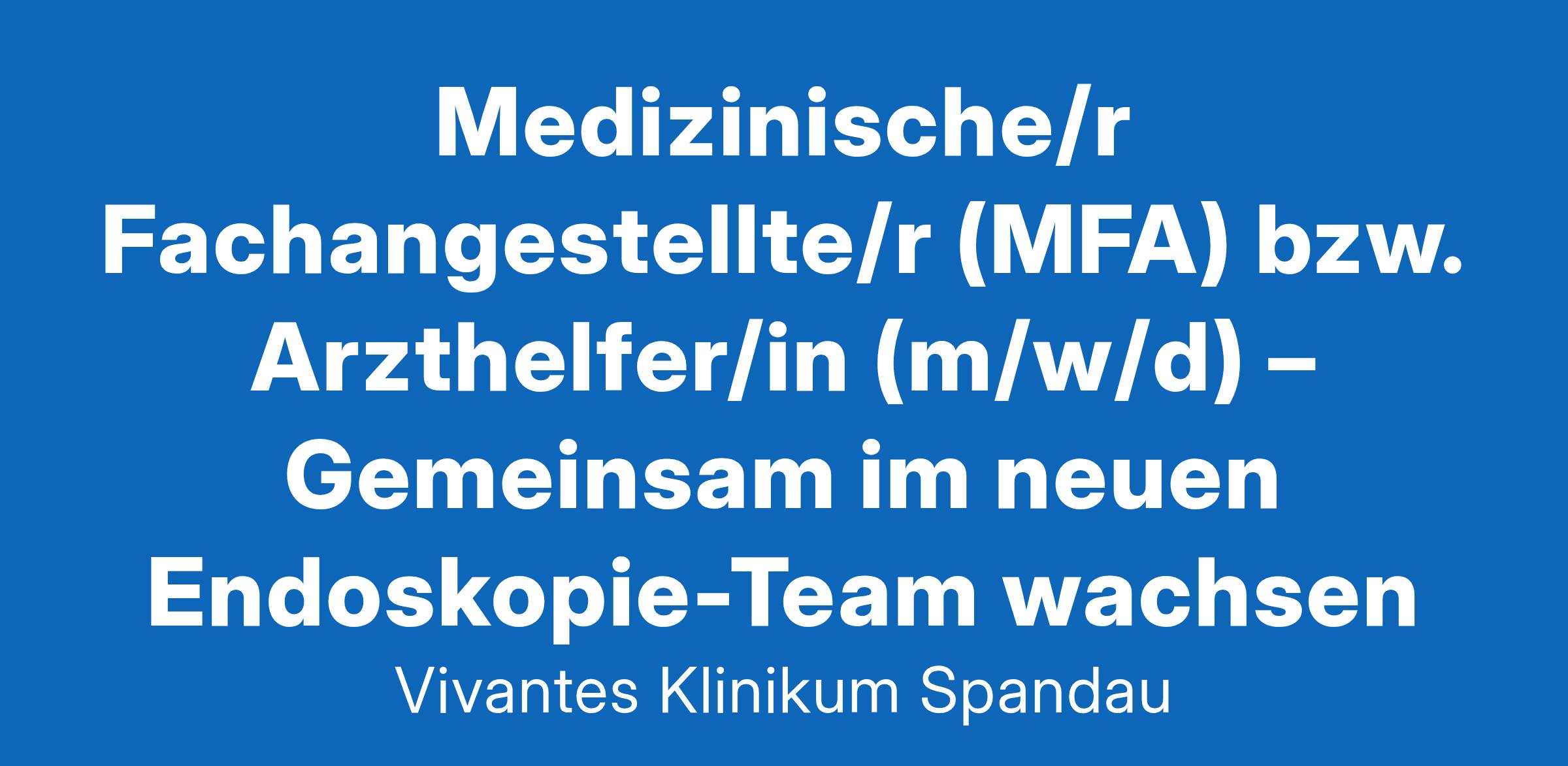 Mittendrin. Mitarbeiten. Gemeinsam mit angesehenen Expertinnen und Experten. Wir sind der größte kommunale Klinikbetreiber Deutschlands mit über 100 Fachkliniken, Pflegeeinrichtungen und Instituten. Gestalten Sie die Gesundheitsversorgung von morgen in unserer pulsierenden Hauptstadt. Kommen Sie zu uns als Medizinische/n Fachangestellte/n (MFA) bzw. Arzthelfer/in (m/w/d) – Gemeinsam im neuen Endoskopie - Team wachsen! für die Klinik für Innere Medizin – Gastroenterologie im Vivantes Klinikum Spandau zum nächstmöglichen Termin als. Möchten Sie Teil eines neuen Teams in unserer modernen Endoskopie-Abteilung werden? Hier haben Sie die Chance, den Aufbau aktiv mitzugestalten. Sie arbeiten eigenverantwortlich und haben geregelte Arbeitszeiten von Montag bis Freitag ohne Schichtdienst – nur eine Rufbereitschaft ist erforderlich. Darüber hinaus unterstützen wir Ihre Weiterentwicklung mit vielen Fortbildungsangeboten. Kommen Sie zu uns als Medizinische/n Fachangestellte/n (MFA) bzw. Arzthelfer/in (m/w/d) – Gemeinsam im neuen Endoskopie - Team wachsen! für die Klinik für Innere Medizin – Gastroenterologie im Vivantes Klinikum Spandau zum nächstmöglichen Termin als. Mittendrin. Mitarbeiten. Gemeinsam mit angesehenen Expertinnen und Experten. Wir sind der größte kommunale Klinikbetreiber Deutschlands mit über 100 Fachkliniken, Pflegeeinrichtungen und Instituten. Gestalten Sie die Gesundheitsversorgung von morgen in unserer pulsierenden Hauptstadt. Möchten Sie Teil eines neuen Teams in unserer modernen Endoskopie-Abteilung werden? Hier haben Sie die Chance, den Aufbau aktiv mitzugestalten. Sie arbeiten eigenverantwortlich und haben geregelte Arbeitszeiten von Montag bis Freitag ohne Schichtdienst – nur eine Rufbereitschaft ist erforderlich. Darüber hinaus unterstützen wir Ihre Weiterentwicklung mit vielen Fortbildungsangeboten. Freuen Sie sich auf: eine herausfordernde, vielseitige und verantwortungsvolle Tätigkeit mit der Möglichkeit, sich einzubringen und zu engagierenein fachlich gut ausgebildetes Team mit hoher Leistungsmotivationfundierte Einarbeitung durch ein qualifiziertes Teamattraktive leistungsgerechte Vergütung nach TVöDeine sehr günstige Lage mit guten VerkehrsanbindungenPrämiensystem bei Anwerbung von PersonalMitarbeiter-Einkaufsvorteile bei namhaften FirmenEntwicklungs- und Karrierechancen als Vorteil unseres großen Konzernssehr gute Weiterentwicklungs- und Fortbildungsmöglichkeiten in einem eigenen innerbetrieblichen LehrinstitutCNE – ein multimediales Fortbildungskonzept für Gesundheits- und Krankenpflegekostenlose betriebseigene Kinderbetreuung bei kurzfristigem Bedarfattraktive und vielfältige Gesundheits- und Freizeitangeboteeine betriebliche Altersversorgung (VBL)bezuschusste Altersvorsorge durch Gehaltsumwandlung möglich Wir wünschen uns: Mit Sorgfalt und Wissen – für klare Diagnosen und gute Pflege.eine abgeschlossene Ausbildung als Medizinische/r Fachangestellte/r (MFA) bzw. Arzthelfer/inidealerweise Erfahrung im endoskopischen FunktionsbereichKenntnisse in der AkutmedizinPC-Grundkenntnisse sowie technisches, manuelles und organisatorisches GeschickVerantwortungsbewusstsein, Einsatzfreude und Loyalität Ihre Aufgaben: Mit Feingefühl und Fürsorge – wir begleiten Sie durch jede Untersuchung.Vorbereitung, Überwachung und Nachsorge der Patienten und Patientinnen in der EndoskopieAssistenz sowie technisch-apparative Vor- und Nachbereitung bei allen diagnostischen und interventionellen Endoskopien sowie sonographischen InterventionenTeilnahme am Endoskopie-Rufbereitschaftsdienst Freuen Sie sich auf: eine herausfordernde, vielseitige und verantwortungsvolle Tätigkeit mit der Möglichkeit, sich einzubringen und zu engagierenein fachlich gut ausgebildetes Team mit hoher Leistungsmotivationfundierte Einarbeitung durch ein qualifiziertes Teamattraktive leistungsgerechte Vergütung nach TVöDeine sehr günstige Lage mit guten VerkehrsanbindungenPrämiensystem bei Anwerbung von PersonalMitarbeiter-Einkaufsvorteile bei namhaften FirmenEntwicklungs- und Karrierechancen als Vorteil unseres großen Konzernssehr gute Weiterentwicklungs- und Fortbildungsmöglichkeiten in einem eigenen innerbetrieblichen LehrinstitutCNE – ein multimediales Fortbildungskonzept für Gesundheits- und Krankenpflegekostenlose betriebseigene Kinderbetreuung bei kurzfristigem Bedarfattraktive und vielfältige Gesundheits- und Freizeitangeboteeine betriebliche Altersversorgung (VBL)bezuschusste Altersvorsorge durch Gehaltsumwandlung möglich Rahmenbedingungen: Karriere mit Herz und Perspektive – willkommen in unserem Unternehmen!Entgelt nach EG E6 TVöDEinsatz auch in Teilzeit möglichdas Vivantes Klinikum Spandau kann Ihnen auf dem Klinikgelände temporär eine Unterkunft anbietenVereinbaren Sie noch heute einen Termin und kommen Sie zum Hospitieren zu uns Einstellungsvoraussetzung: vor Aufnahme der Tätigkeit – Nachweis der Masernimmunität / Masernschutzimpfung für nach 1970 Geborene. Rahmenbedingungen: Karriere mit Herz und Perspektive – willkommen in unserem Unternehmen!Entgelt nach EG E6 TVöDEinsatz auch in Teilzeit möglichdas Vivantes Klinikum Spandau kann Ihnen auf dem Klinikgelände temporär eine Unterkunft anbietenVereinbaren Sie noch heute einen Termin und kommen Sie zum Hospitieren zu uns Einstellungsvoraussetzung: vor Aufnahme der Tätigkeit – Nachweis der Masernimmunität / Masernschutzimpfung für nach 1970 Geborene. Ihre Bewerbung: Wenn Sie die Arbeit in einem dynamischen, motivierten und vor allem offenen und kollegialen Umfeld schätzen, freuen wir uns Sie kennenzulernen. Bitte bewerben Sie sich bis zum 23.02.2025 auf die Referenz-Nr. KSP1854 über unser elektronisches Bewerbermanagement über den Stellenmarkt unserer Website: https://karriere.vivantes.de Ihre Fragen beantwortet: