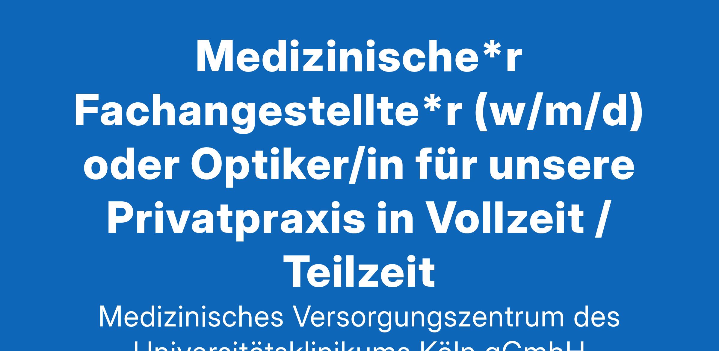 Suchen Sie nach einer anspruchsvollen und erfüllenden Aufgabe im Gesundheitswesen? Werden Sie Teil unseres medizinischen Versorgungszentrums (MVZ Uniklinik Köln) und leisten Sie ambulante Versorgung auf höchstem Niveau. Neben zahlreichen Praxen verschiedenster Disziplinen, die auf dem Campus des Universitätsklinikums verortet sind, bieten wir in unserer Praxis am Stadtwaldgürtel Privatpatienten und Selbstzahlern ein breites Leistungsspektrum der Augenheilkunde an. Wir suchen Sie als engagierte*n und motivierte*n Medizinische*n Fachangestellte*n (w/m/d) oder Optiker/in für unsere Privatpraxis in Voll- und Teilzeit. Die Stelle ist unbefristet zu besetzen. Das erwartet Sie: Mitarbeit und Vorbereitung von medizinischen Untersuchungen (u.a. Refraktions- und Visusbestimmung) Technische Assistenz in Spezialsprechstunden Voruntersuchung für Operationen Einhaltung der Hygiene- und Qualitätsstandards Patientenbetreuung Administrative Tätigkeiten Das wünschen wir uns: Abgeschlossene Ausbildung als MFA und Berufserfahrung in der Augenheilkunde oder staatlich geprüfte/r Augenoptiker), Optometrist/in, Orthoptist/in Teamgeist und Verlässlichkeit Freundlichkeit, Sensibilität und Einfühlungsvermögen im Umgang mit Patientinnen und Patienten Persönliches Engagement, Verantwortungsbewusstsein & Sorgfalt Hohes Maß an Organisationsgeschick und Qualitätsbewusstsein Auch bei stärkerem Patientenandrang behalten Sie einen kühlen Kopf und haben Spaß an der Arbeit Darauf können Sie sich freuen: Regelmäßige Arbeitszeiten, ohne Nachtdienste Freie Wochenenden 30 Tage Urlaub Faire und leistungsgerechte Vergütung Ein freundliches und dynamisches Team in R(h)einkultur Strukturiertes Einarbeitungskonzept und Mentor als Ansprechpartner Vielfältige Einsatzmöglichkeiten & abwechslungsreiche Aufgaben Regelmäßige interne und externe Fortbildungen Corporate Benefits Haben wir Ihr Interesse geweckt? Dann freuen wir uns auf Ihre Bewerbung. Ihre persönlichen Daten rund um Ihre Bewerbung behandeln wir mit Sorgfalt und höchster Vertraulichkeit. Ihre Bewerbung richten Sie bitte unter Angabe des möglichen Eintrittstermins und Ihres Gehaltswunsches per E-Mail an: MVZ-Bewerbung@uk-koeln.de Kontakt Martin Gerlach, Geschäftsbereichsleiter MVZ-Bewerbung@uk-koeln.de Standort Köln Medizinisches Versorgungszentrum des Universitätsklinikums Köln gGmbH Joseph-Stelzmann-Str. 24 50931 Köln https://mvz.uk-koeln.de/