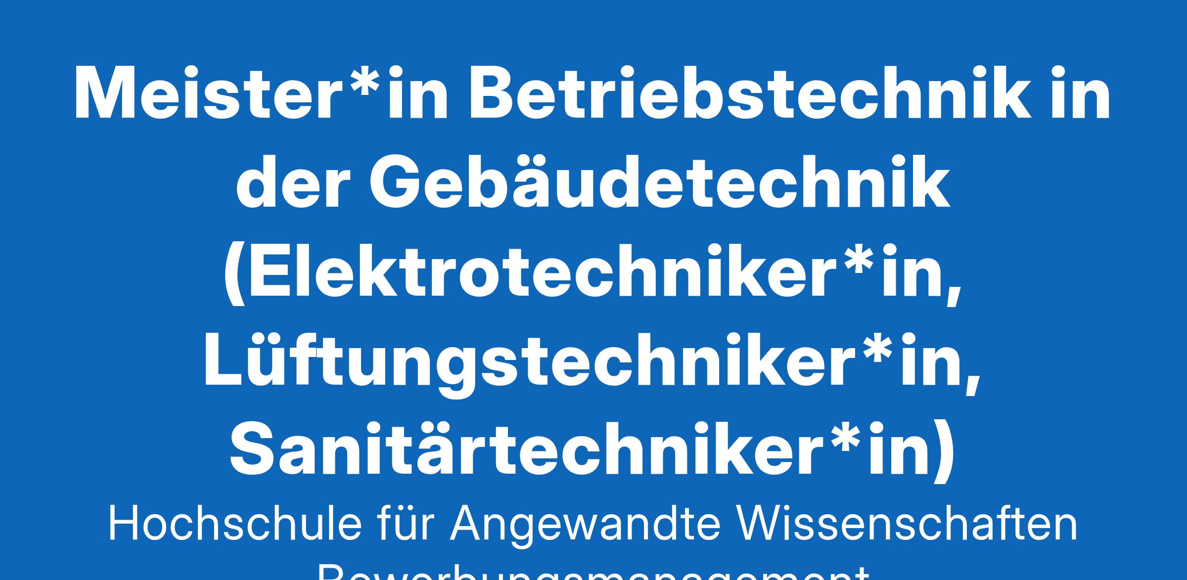 Hochschule für Angewandte Wissenschaften Bewerbungsmanagement -- Meister*in Betriebstechnik in der Gebäudetechnik (Elektrotechniker*in, Lüftungstechniker*in, Sanitärtechniker*in)