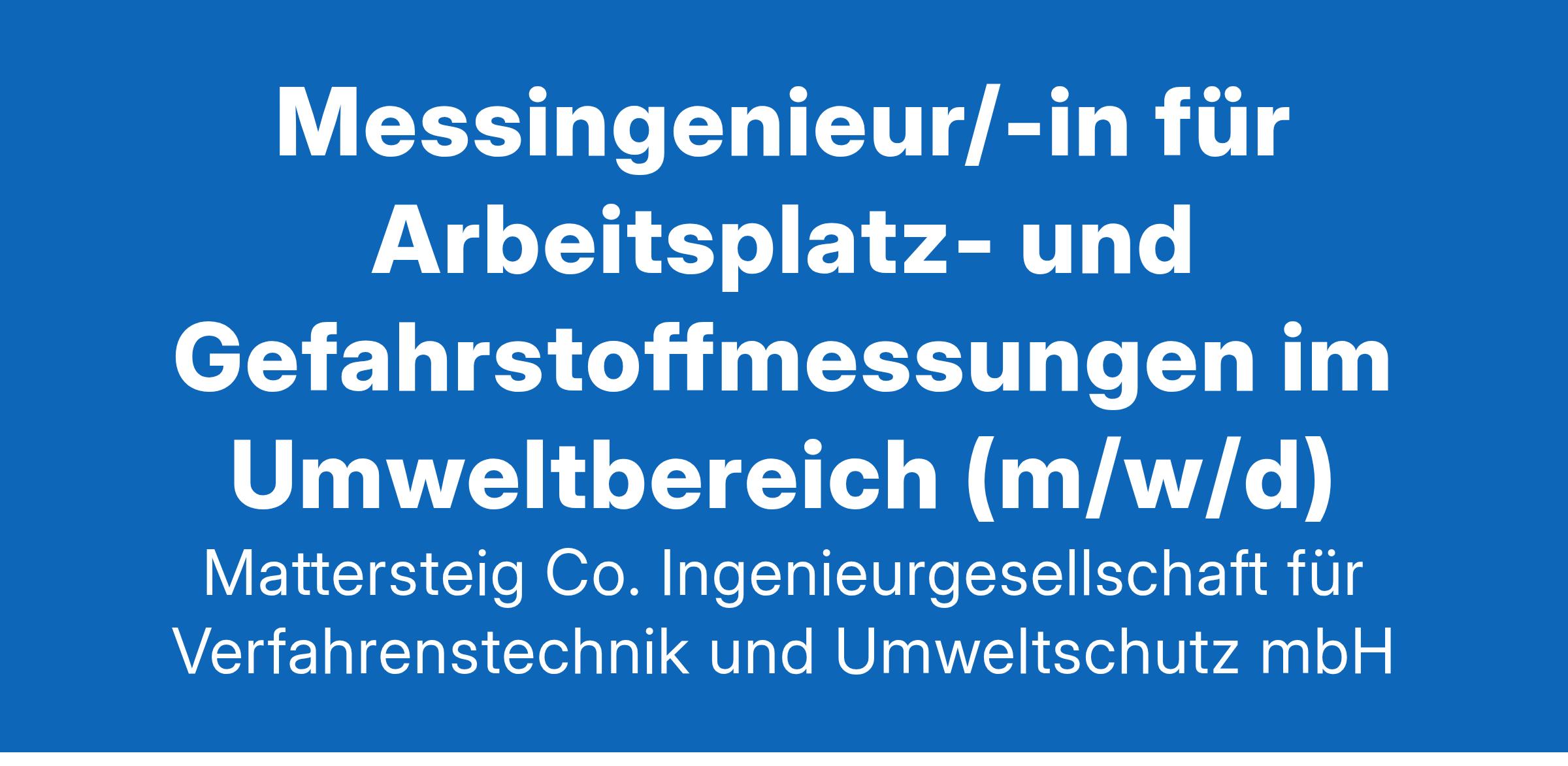 Mattersteig & Co. Ingenieurgesellschaft für Verfahrenstechnik und Umweltschutz mbH Messingenieur/-in für Arbeitsplatz- und Gefahrstoffmessungen im Umweltbereich (m/w/d) Kommen Sie in unser Team! Zur unbefristeten Festanstellung suchen wir Sie in Vollzeit als Messingenieur/-in für Arbeitsplatz- und Gefahrstoffmessungen im Umweltbereich (m/w/d) im Markranstädt. Wir, die Firma Mattersteig & Co. Ingenieurgesellschaft mbH für Verfahrenstechnik und Umweltschutz, sind seit über 30 Jahren ein inhabergeführtes, mittelständisches Unternehmen. Wir sind eine bekanntgegebene Messstelle nach § 29b BImSchG mit Sitz in Markranstädt bei Leipzig und einer Niederlassung im Saterland. Das Unternehmen wurde 1991 mit drei Mitarbeitern gegründet. Heute besteht unser Team aus mehr als 35 Mitarbeitern und setzt sich aus Ingenieuren und Naturwissenschaftlern sowie Technikern und Laboranten zusammen. Als kompetentes Dienstleistungsunternehmen ist es unser Anliegen, mit gesetzeskonformen Verfahren Messungen und Analysen durchzuführen sowie Gutachten sach- und termingerecht zu erstellen. Wir bieten feste, unbefristete Arbeitsverträge, einen sicheren Arbeitsplatz sowie attraktive Zusatzleistungen. Durch unser dynamisches Wachstum suchen wir Sie als motivierte Unterstützung für unser Team. Zum Alltag des Messingenieurs/-in gehören folgende Aufgaben: der Aufgabenbereich im Unternehmen umfasst den Bereich der Gefahrstoff-, Arbeitsplatz- und Innenraummessung Projektvorbereitung inklusive Messplanung Durchführung und Bewertung von Gefahrstoffmessungen an unterschiedlichen Industrieanlagen Berichterstellung und -kontrolle Korrespondenz mit Kunden und Geschäftspartners Weiterentwicklung der Messtechnik Dokumentenpflege Ihr Profil: Berufserfahrung im Bereich Arbeitsplatzmessungen, gern auch im Umweltbereich Kenntnisse im Bereich der Gefahrstoff-Probenahme und der relevanten Regelwerke technischer Sachverstand im Bereich der Gefahrstoff-Messtechnik, Arbeitsplatzmessungen gemäß § 7 Abs. 10 der GefStoffV Organisationsgeschick und aktive Einsatzfreude Reisebereitschaft (bundesweit) zuverlässige, selbstständige, strukturierte und absolut loyale Arbeitsweise Fähigkeit zum selbstständigen, eigenverantwortlichen und sorgfältigen Arbeiten ein erfolgreiches abgeschlossenes Studium im Umweltbereich gute bis sehr gute Kenntnisse im Umgang mit den Microsoft Office Anwendungen Führerschein Klasse B erforderlich Wir bieten: unbefristeten Arbeitsvertrag als Messingenieur/-in (m/w/d) Weihnachtsgeld Sicherheit in einer krisensicheren Branche betriebliche Krankenversicherung - bereits nach sechs Monaten Betriebszugehörigkeit ein großartiges Team, was jederzeit für Sie da ist! der Arbeitsort in Markranstädt ist mit öffentlichen Verkehrsmitteln gut erreichbar Interesse? Dann freuen wir uns auf Ihre Bewerbung unter: bewerbung@mattersteig-und-co.de Mattersteig & Co. Ingenieurgesellschaft mbH Herr Dr. Mattersteig Wirtschaftsweg 27 04420 Markranstädt https://mattersteig-und-co.de/