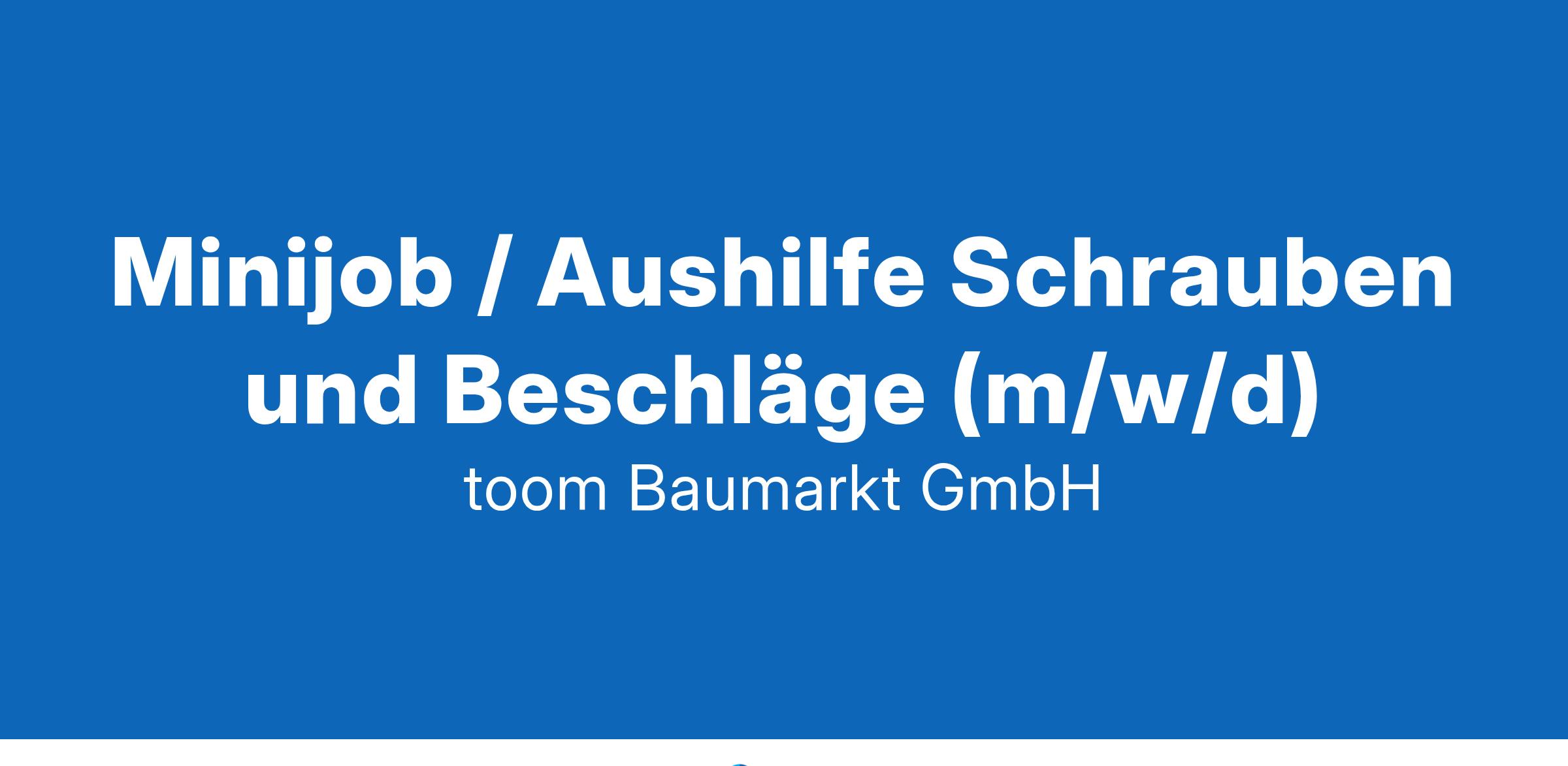 Minijob / Aushilfe Schrauben und Beschläge (m/w/d)Bei uns stehst du im Vordergrund. Und ein ganzes Team hinter dir: Denn Respekt, gegenseitige Wertschätzung und Unterstützung sind für uns das Wichtigste – egal, in welcher Position du bei uns arbeitest.Unsere Zahlen, Daten und Fakten: Wir sind Teil der REWE Group. Bundesweit betreiben wir mehr als 300 Märkte und beschäftigen rund 18.000 Mitarbeitende.Jobdetails