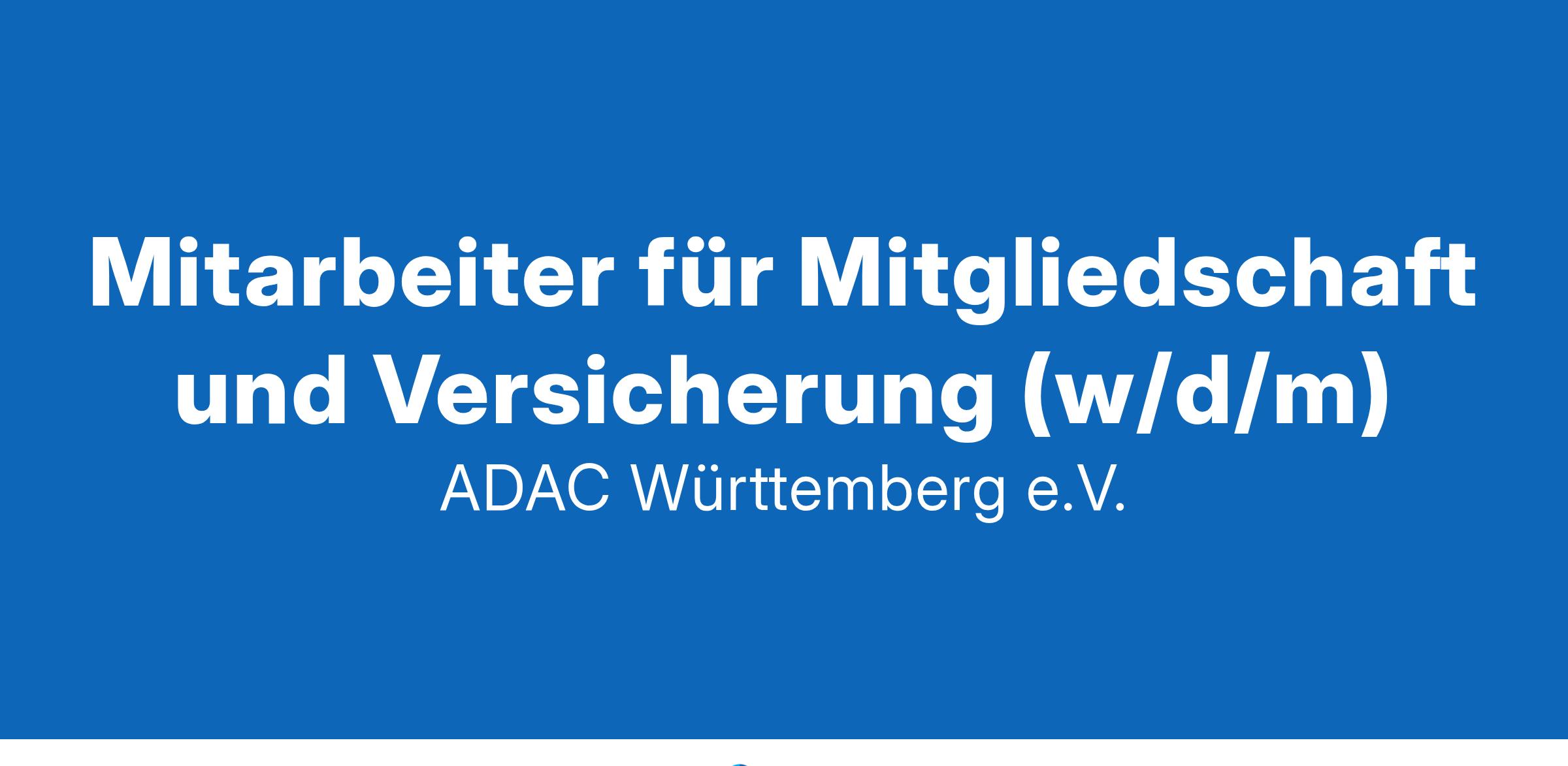 Mitarbeiter für Mitgliedschaft und Versicherung (w/d/m)Der Regionalclub ADAC Württemberg e.V. wurde 1904 gegründet. Mittlerweile arbeiten 230 Mitarbeitende in unseren 14 Geschäftsstellen in Württemberg. Hier kümmern wir uns um die Themen Mobilität, Reise & Urlaub, Versicherungen und natürlich die ADAC Mitgliedschaft.