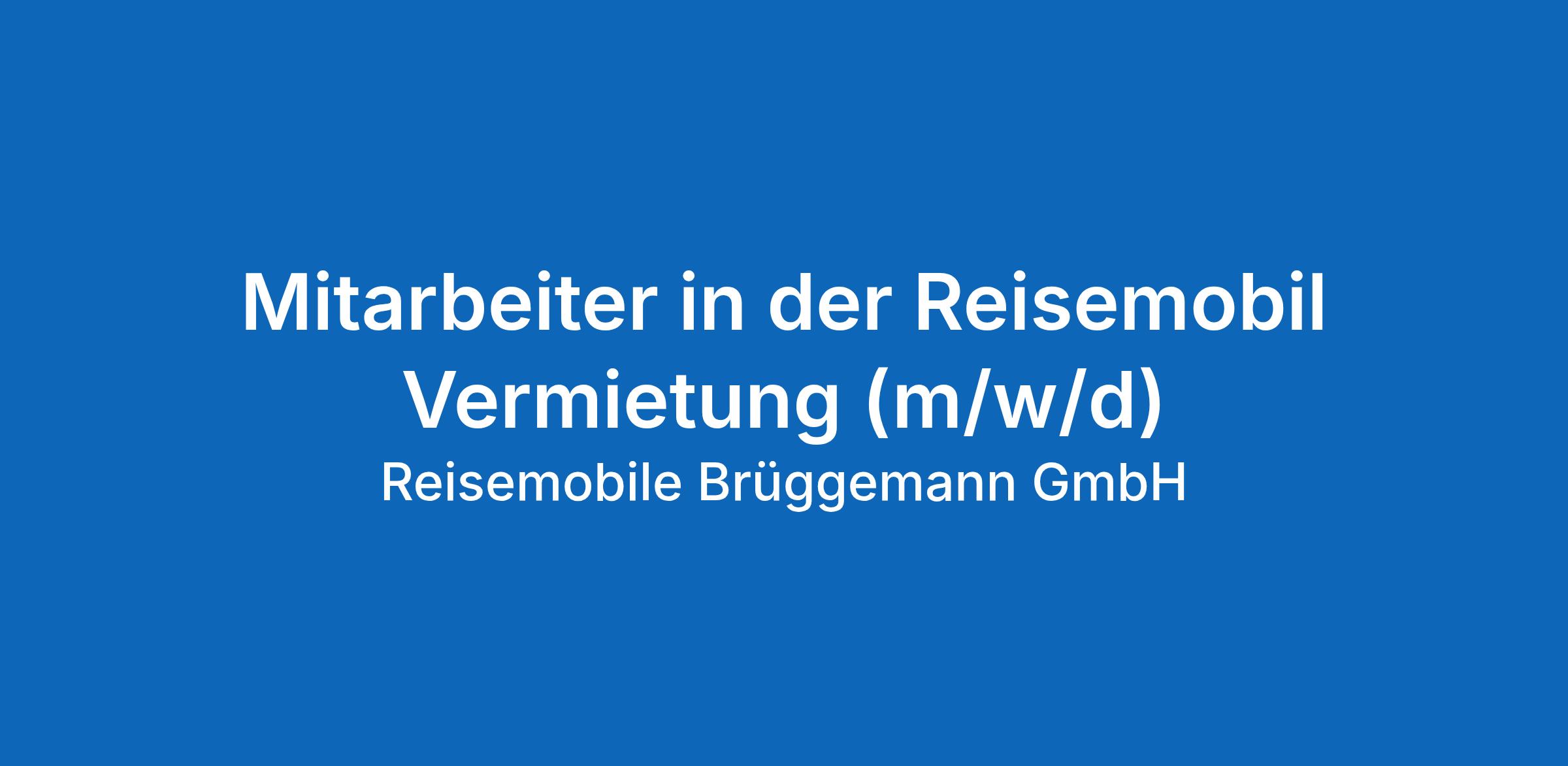 Wir freuen uns auf Ihre aussagekräftige Bewerbung mit Angabe Ihrer Gehaltsvorstellung und Verfügbarkeit. Bevorzugt per Mail in einer zusammengeführten PDF-Datei (max. 10 MB) an: bewerbung@reisemobile-brueggemann.de