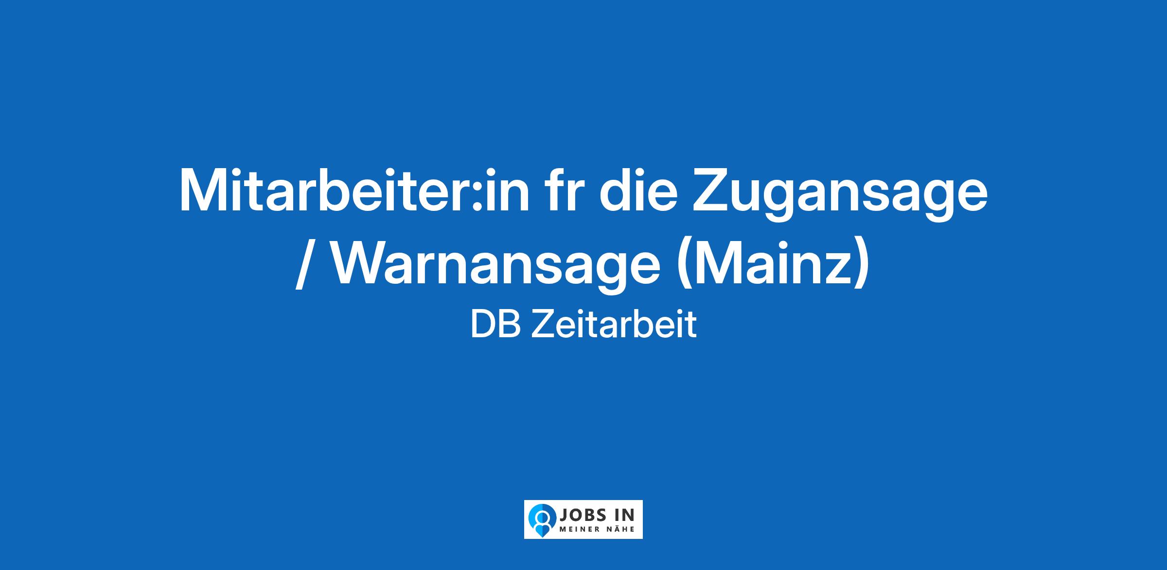 Zum nchstmglichen Zeitpunkt suchen wir dich als Zeitarbeitnehmer:in im Auftrag der DB InfraGO AG fr einen Einsatz als Mitarbeiter:in fr die Zugansage / Warnansage (w/m/d) fr den Standort Mainz. Als Zeitarbeitnehmer:in erbringst du deine Arbeitsleistung direkt vor Ort im genannten Geschftsfeld, whrend du dein Arbeitsverhltnis mit uns, der DB Zeitarbeit, abschliet.