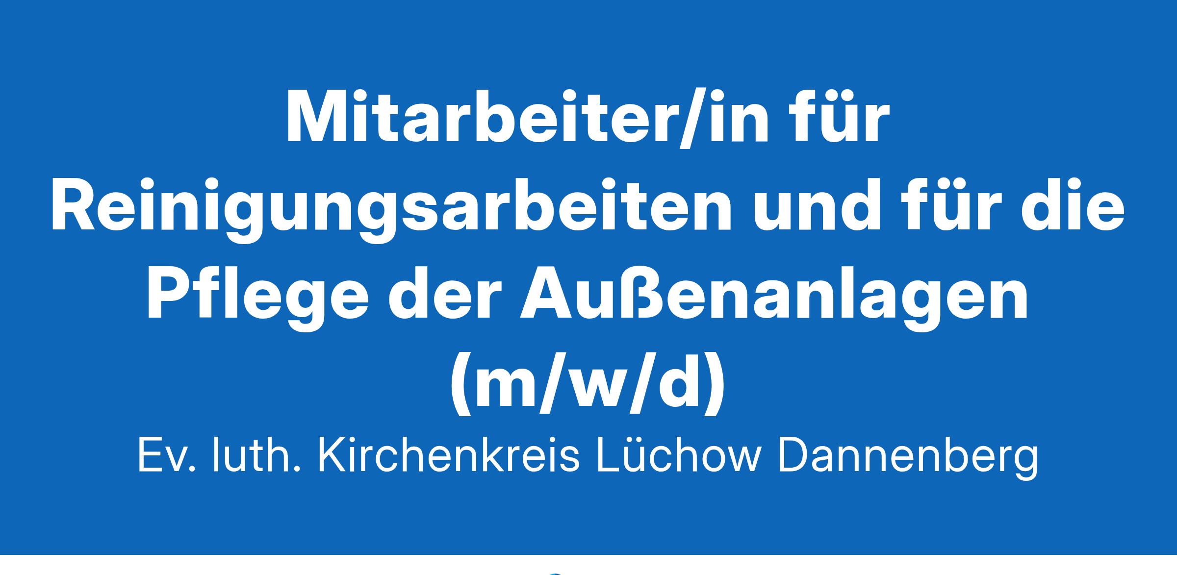 und für die Pflege der Außenanlagen (m/w/d) mit einer wöchentlichen Arbeitszeit von 16,75 Stunden. Die Vergütung erfolgt nach TV-L. Wir setzen ein loyales Verhalten gegenüber der evangelischen Kirche voraus. Von allen Mitarbeitenden erwarten wir, dass sie die evangelische Prägung unserer Kirche achten und im beruflichen Handeln den Auftrag der Kirche vertreten und fördern. Ihre schriftliche Bewerbung richten Sie bitte bis zum 07.02.2025 an das Ev.-luth. Kirchenamt Lüchow-Dannenberg, Bahnhofstraße 26, 29451 Dannenberg oder per Mail an bewerbung.kk.Luechow-dannenberg@evlka.de.