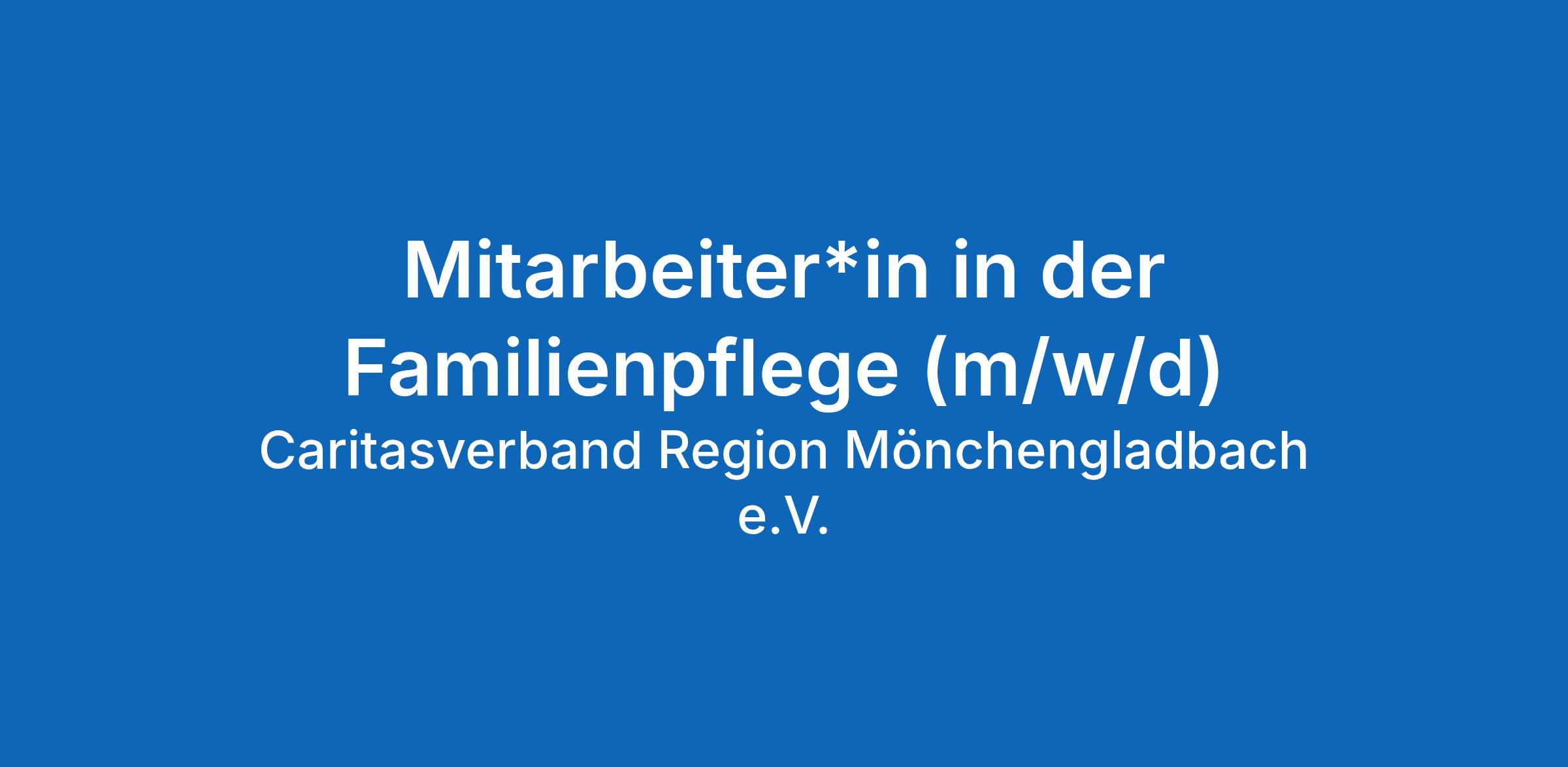 Wir suchen ab dem 01.06.2026 eine engagierte und erfahrene Fachkraft, die unser Team in der Familienpflege mit 20 bis 30 Wochenstunden unterstützt. Als Mitarbeiter*in in der Familienpflege beim Caritasverband Region Mönchengladbach e.V. leisten Sie einen wertvollen Beitrag zur Unterstützung von Familien in herausfordernden Lebenssituationen.